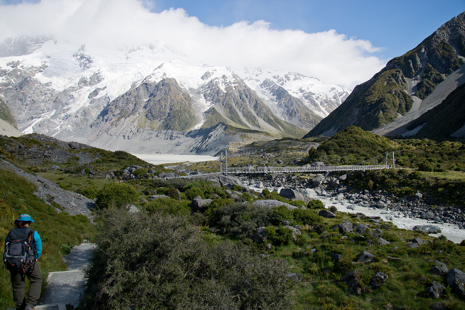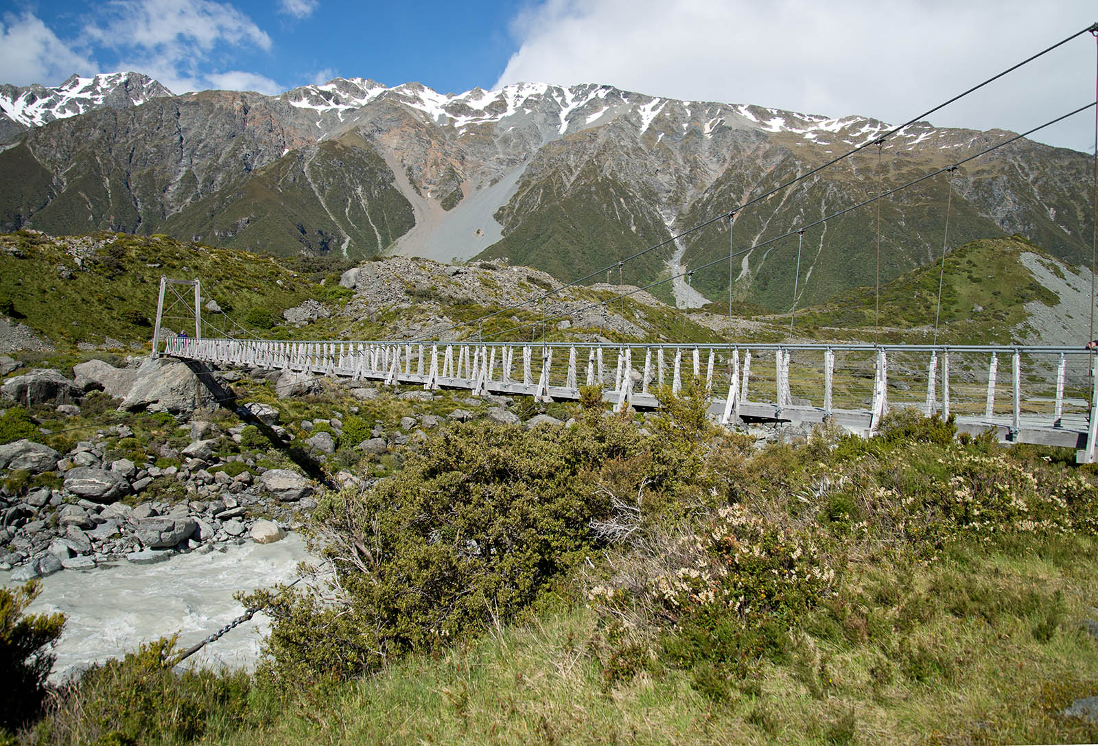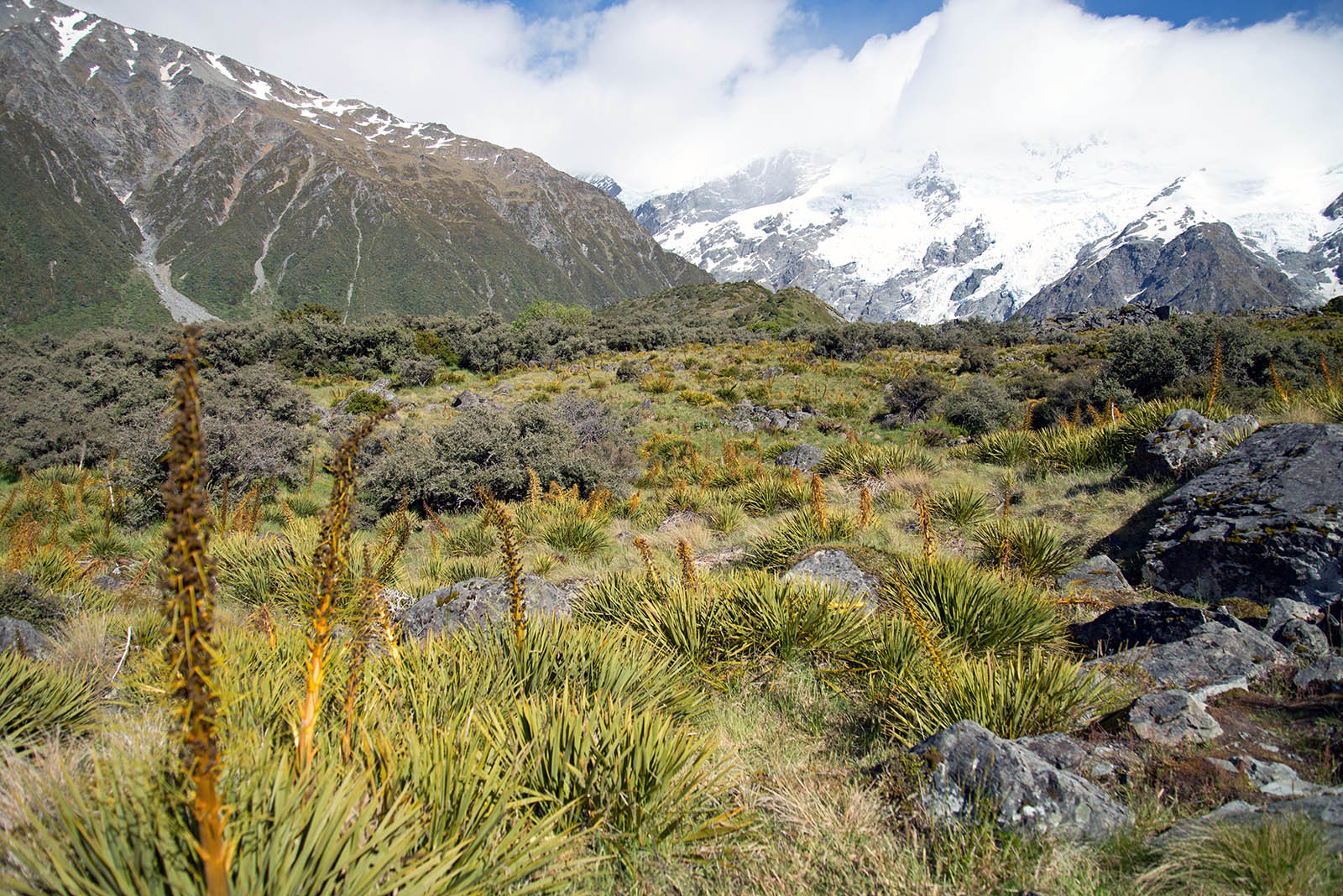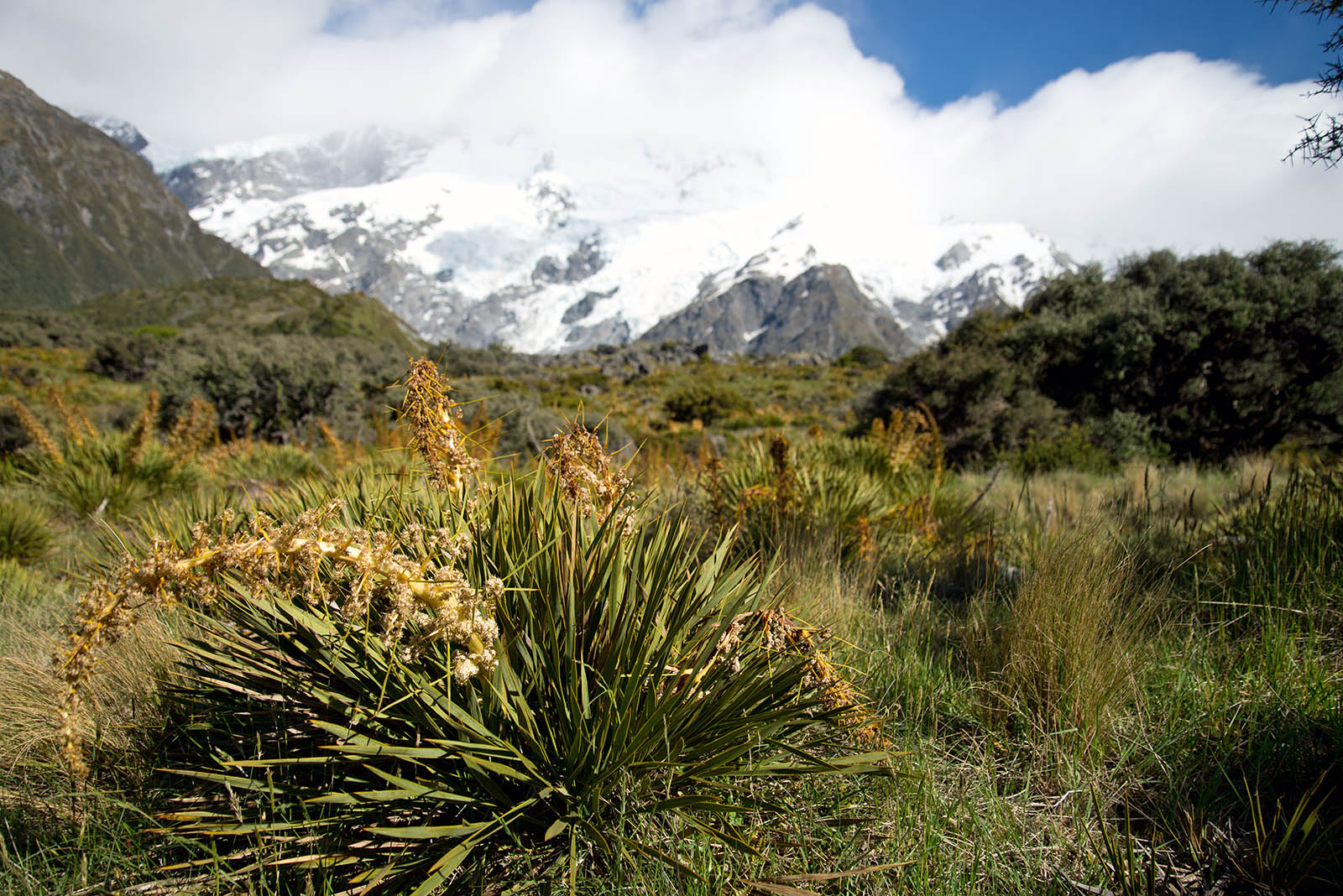 マウントクックの代表的なハイキングコースで、所要時間は約3時間半、歩行距離は往復で約7kmのコースです。訓練された日本語トレッキングガイドが同行し山や花、自然に関する詳しい御説明もありました。平坦なコース上では世界遺産に登録されているマウントクックの優美な姿や数多くの氷河や氷河湖を見ることができる。マウントクック村のキャンプ場からフッカー川に沿って、第二と第二の吊り橋を渡り、先の小さい橋の先(通称・水場)で折り返します。マウントクックに近づいた写真撮影のベストポイントです。また、周辺には11月中旬から11月にかけて、マウントクック・リリーが咲き誇り、目を楽しませてくれます。帰りには、眼下に不思議な青色のプカチ湖や、ハミテージホテルを遠望できる。