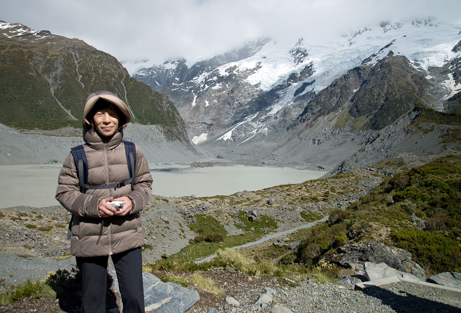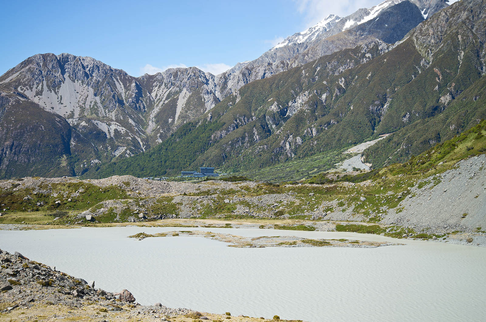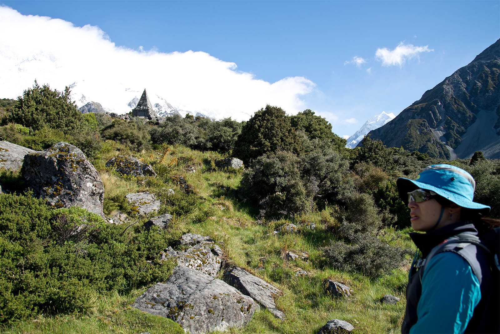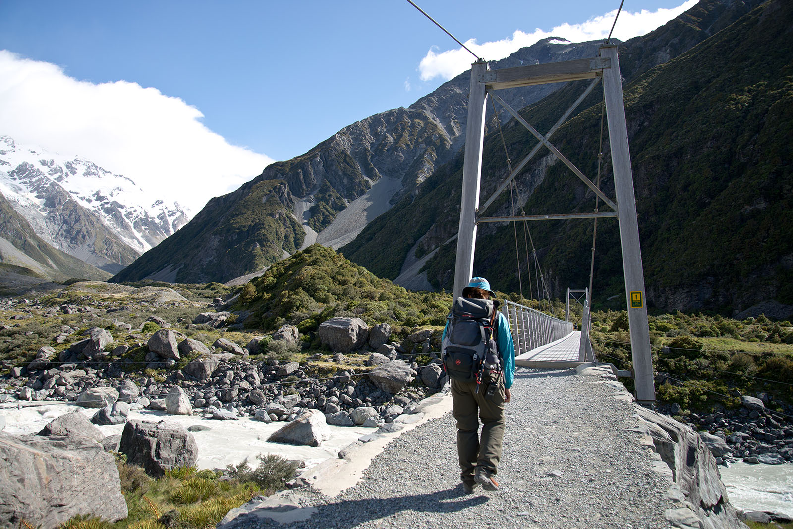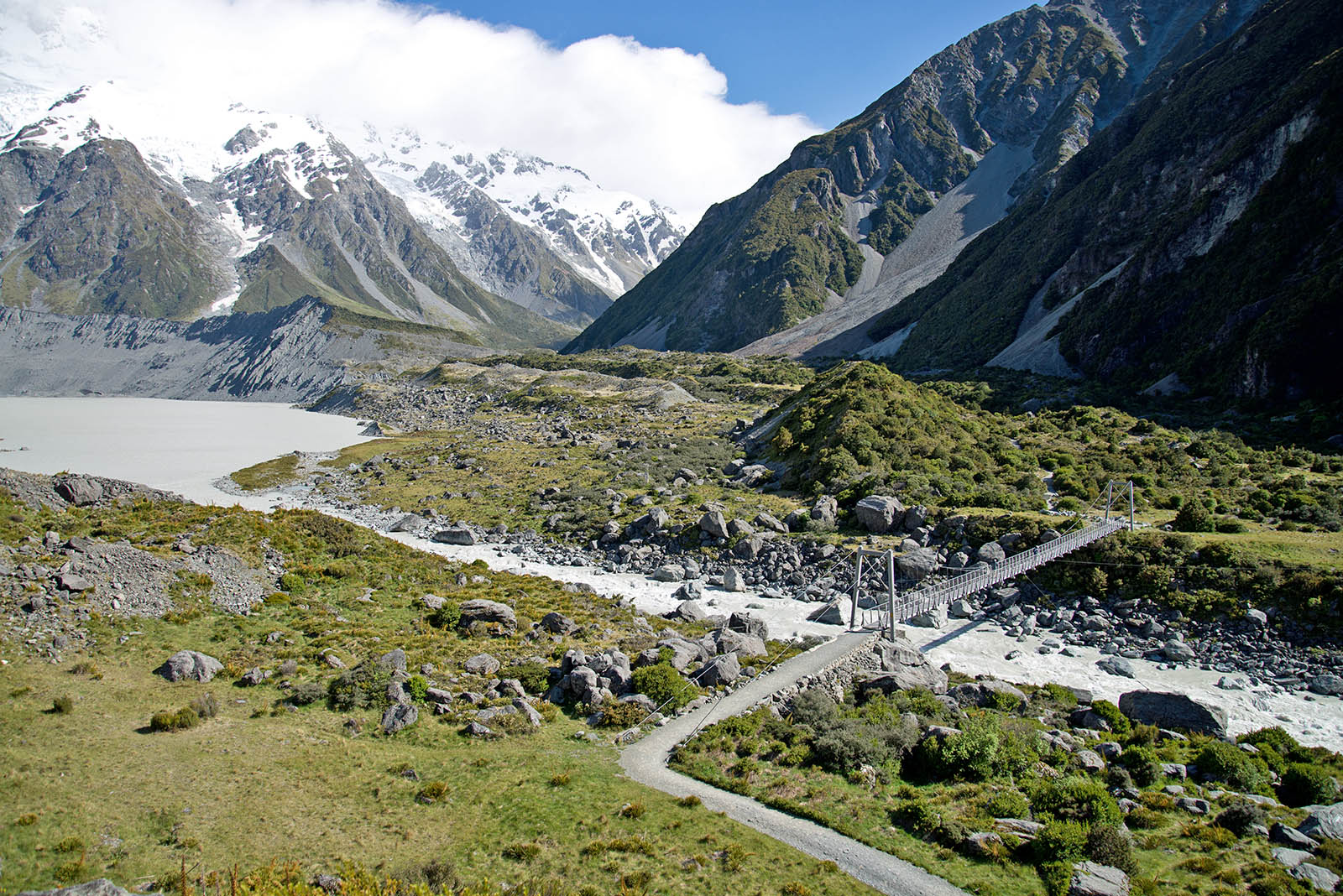 マウントクックの代表的なハイキングコースで、所要時間は約3時間半、歩行距離は往復で約7kmのコースです。訓練された日本語トレッキングガイドが同行し山や花、自然に関する詳しい御説明もありました。平坦なコース上では世界遺産に登録されているマウントクックの優美な姿や数多くの氷河や氷河湖を見ることができる。マウントクック村のキャンプ場からフッカー川に沿って、第二と第二の吊り橋を渡り、先の小さい橋の先(通称・水場)で折り返します。マウントクックに近づいた写真撮影のベストポイントです。また、周辺には11月中旬から11月にかけて、マウントクック・リリーが咲き誇り、目を楽しませてくれます。帰りには、眼下に不思議な青色のプカチ湖や、ハミテージホテルを遠望できる。