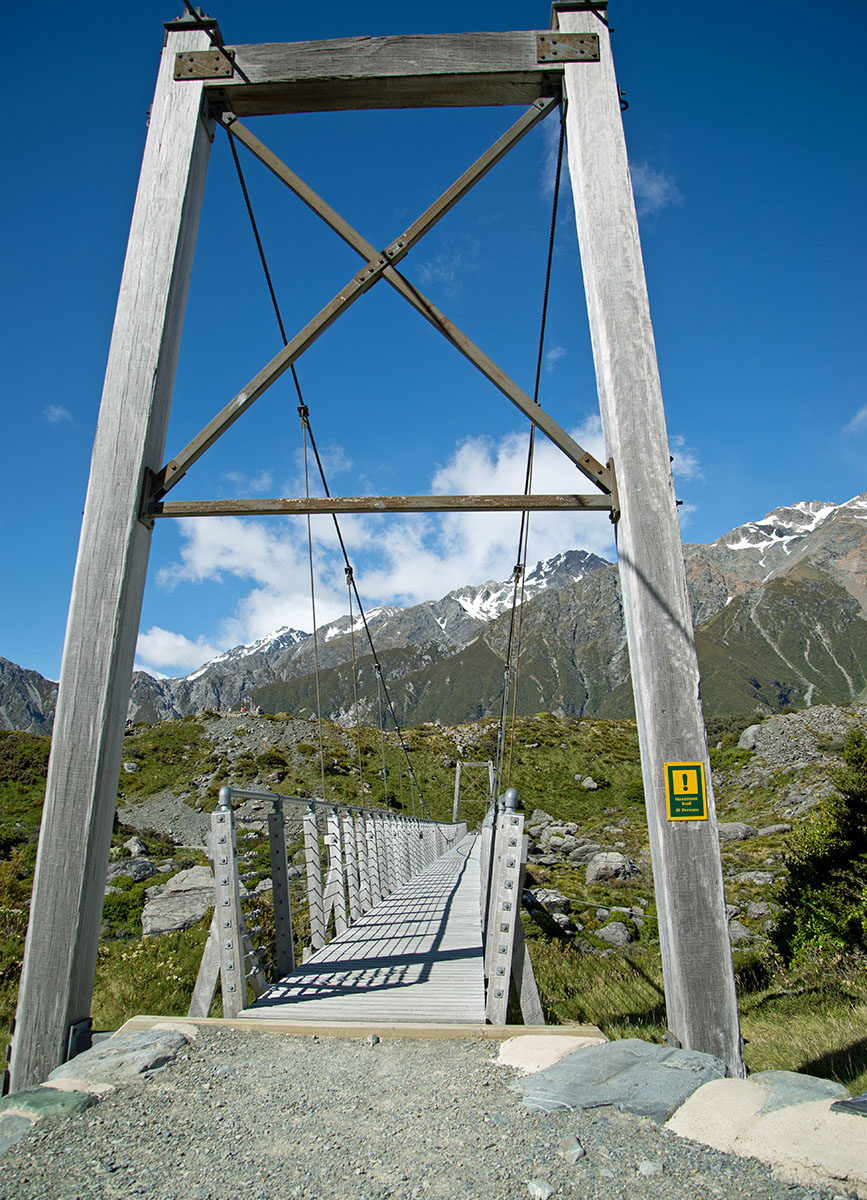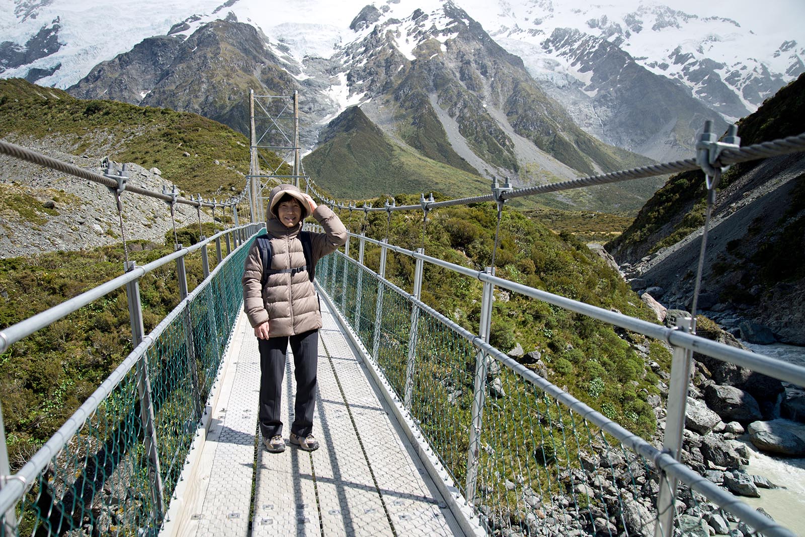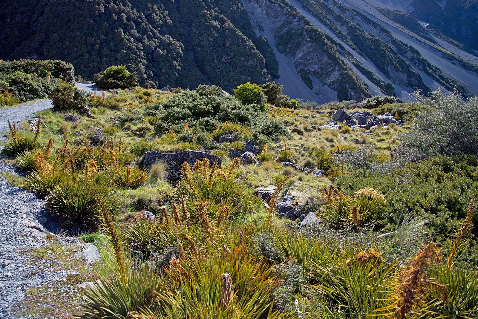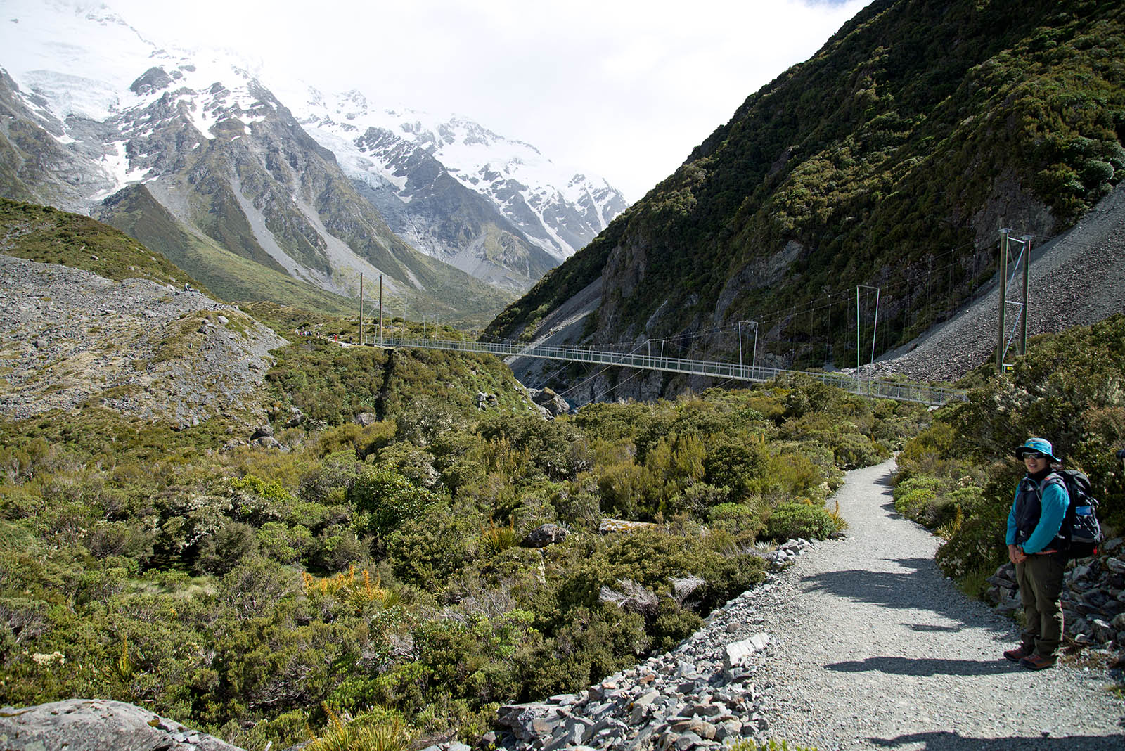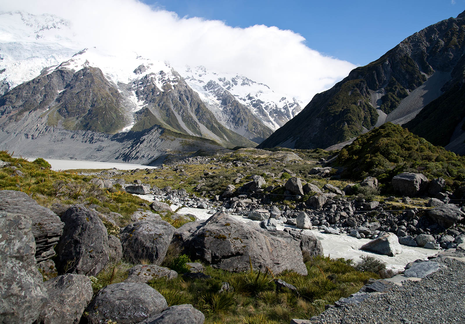 マウントクックの代表的なハイキングコースで、所要時間は約3時間半、歩行距離は往復で約7kmのコースです。訓練された日本語トレッキングガイドが同行し山や花、自然に関する詳しい御説明もありました。平坦なコース上では世界遺産に登録されているマウントクックの優美な姿や数多くの氷河や氷河湖を見ることができる。マウントクック村のキャンプ場からフッカー川に沿って、第二と第二の吊り橋を渡り、先の小さい橋の先(通称・水場)で折り返します。マウントクックに近づいた写真撮影のベストポイントです。また、周辺には11月中旬から11月にかけて、マウントクック・リリーが咲き誇り、目を楽しませてくれます。帰りには、眼下に不思議な青色のプカチ湖や、ハミテージホテルを遠望できる。