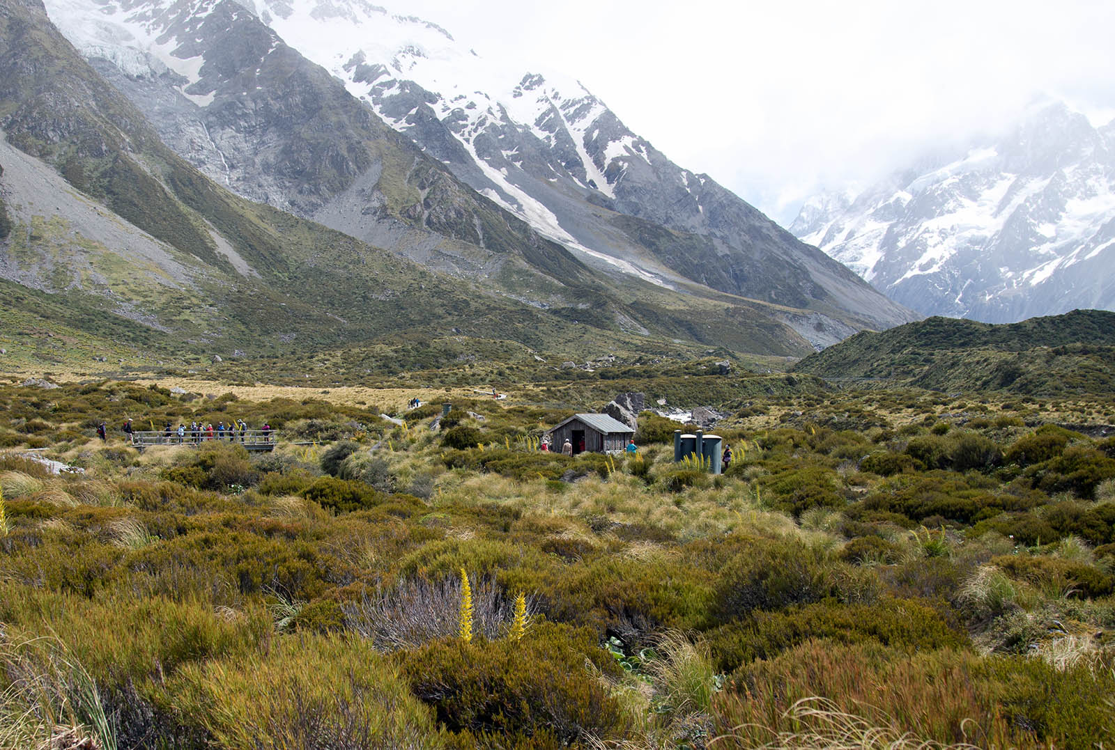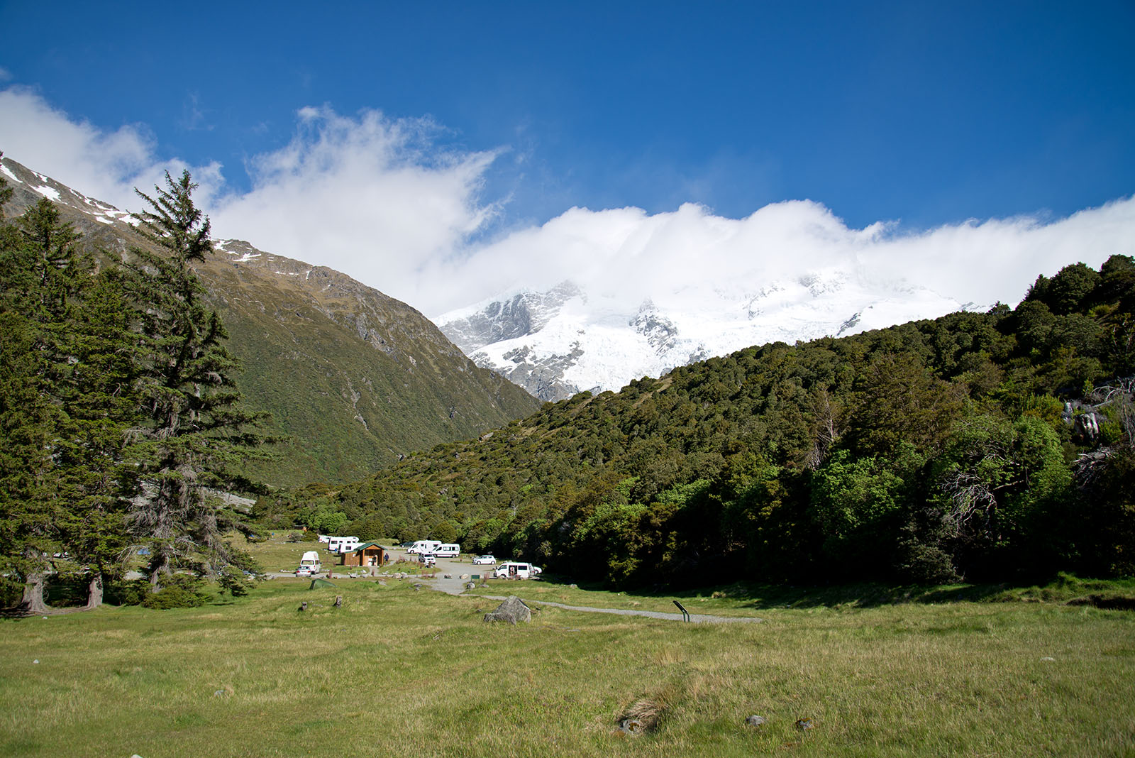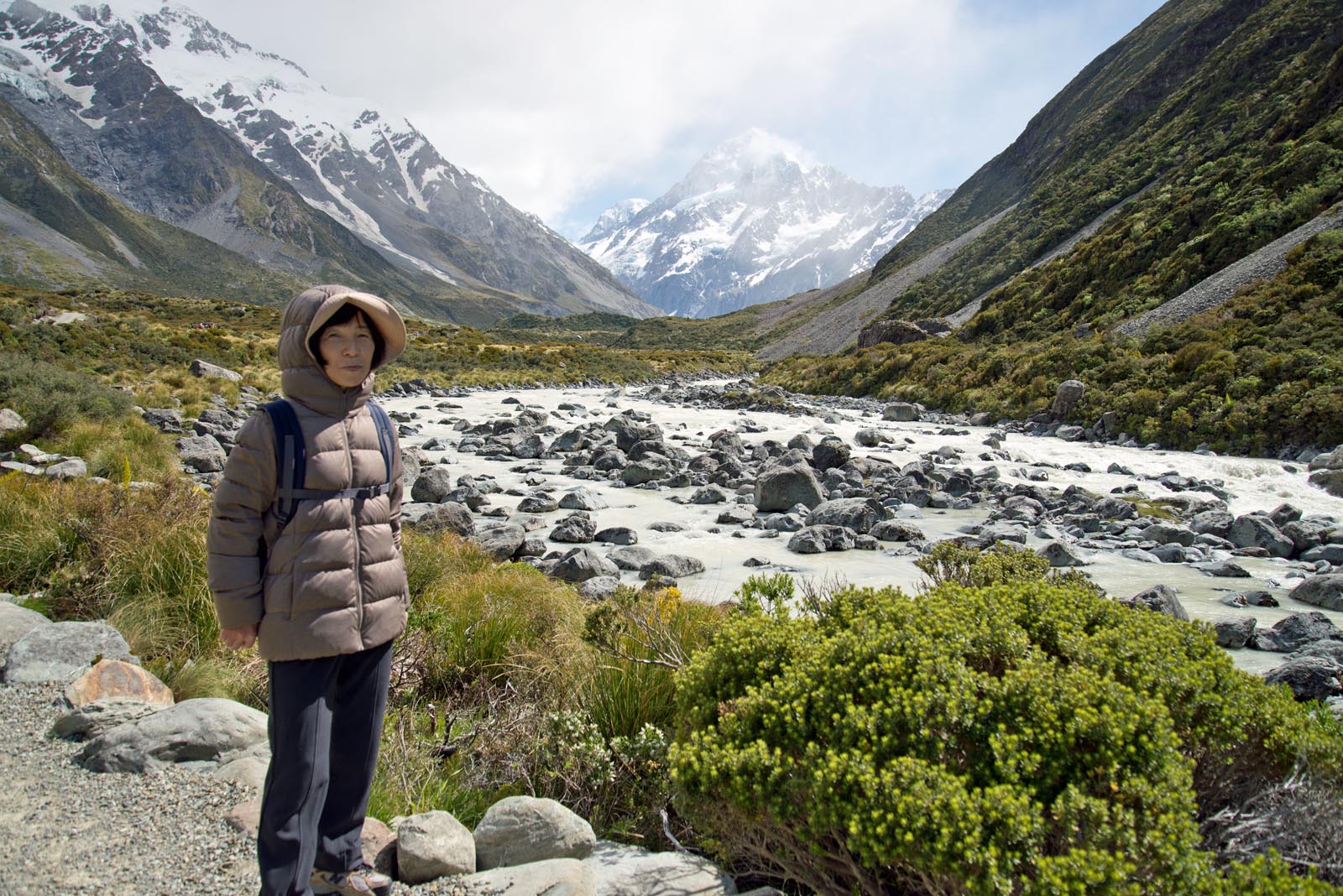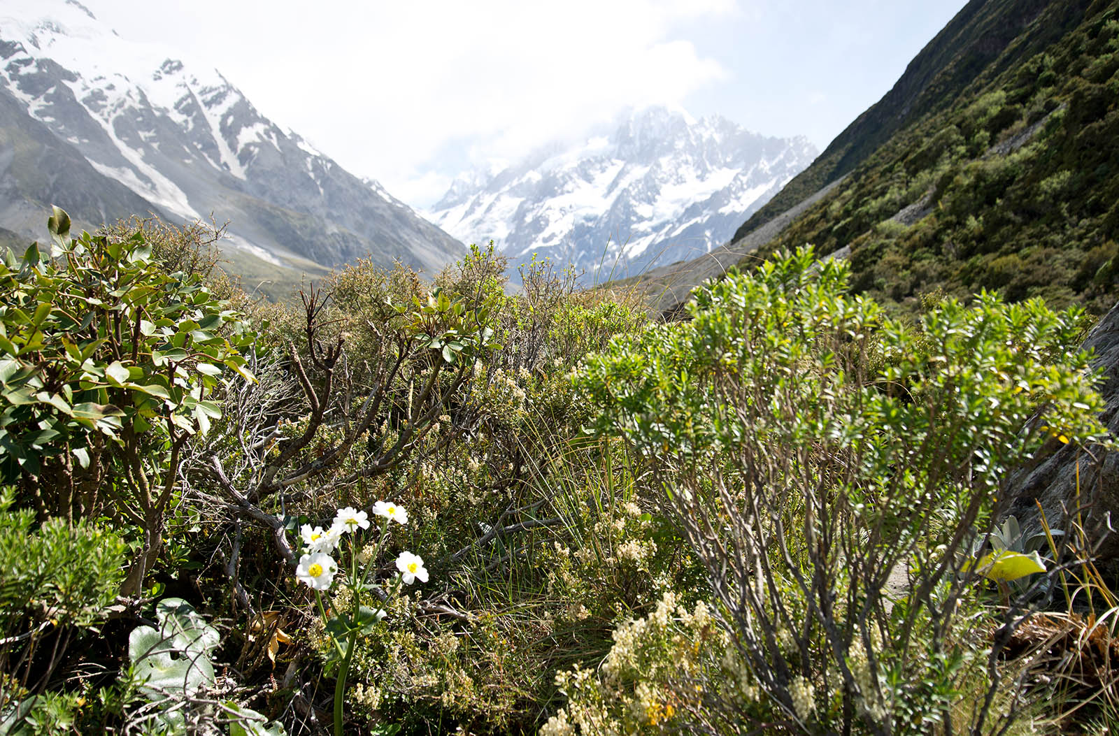 マウントクックの代表的なハイキングコースで、所要時間は約3時間半、歩行距離は往復で約7kmのコースです。訓練された日本語トレッキングガイドが同行し山や花、自然に関する詳しい御説明もありました。平坦なコース上では世界遺産に登録されているマウントクックの優美な姿や数多くの氷河や氷河湖を見ることができる。マウントクック村のキャンプ場からフッカー川に沿って、第二と第二の吊り橋を渡り、先の小さい橋の先(通称・水場)で折り返します。マウントクックに近づいた写真撮影のベストポイントです。また、周辺には11月中旬から11月にかけて、マウントクック・リリーが咲き誇り、目を楽しませてくれます。帰りには、眼下に不思議な青色のプカチ湖や、ハミテージホテルを遠望できる。