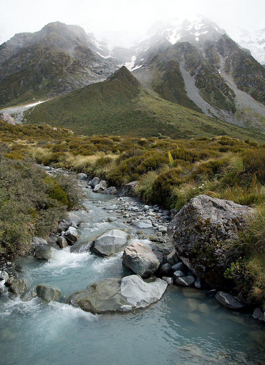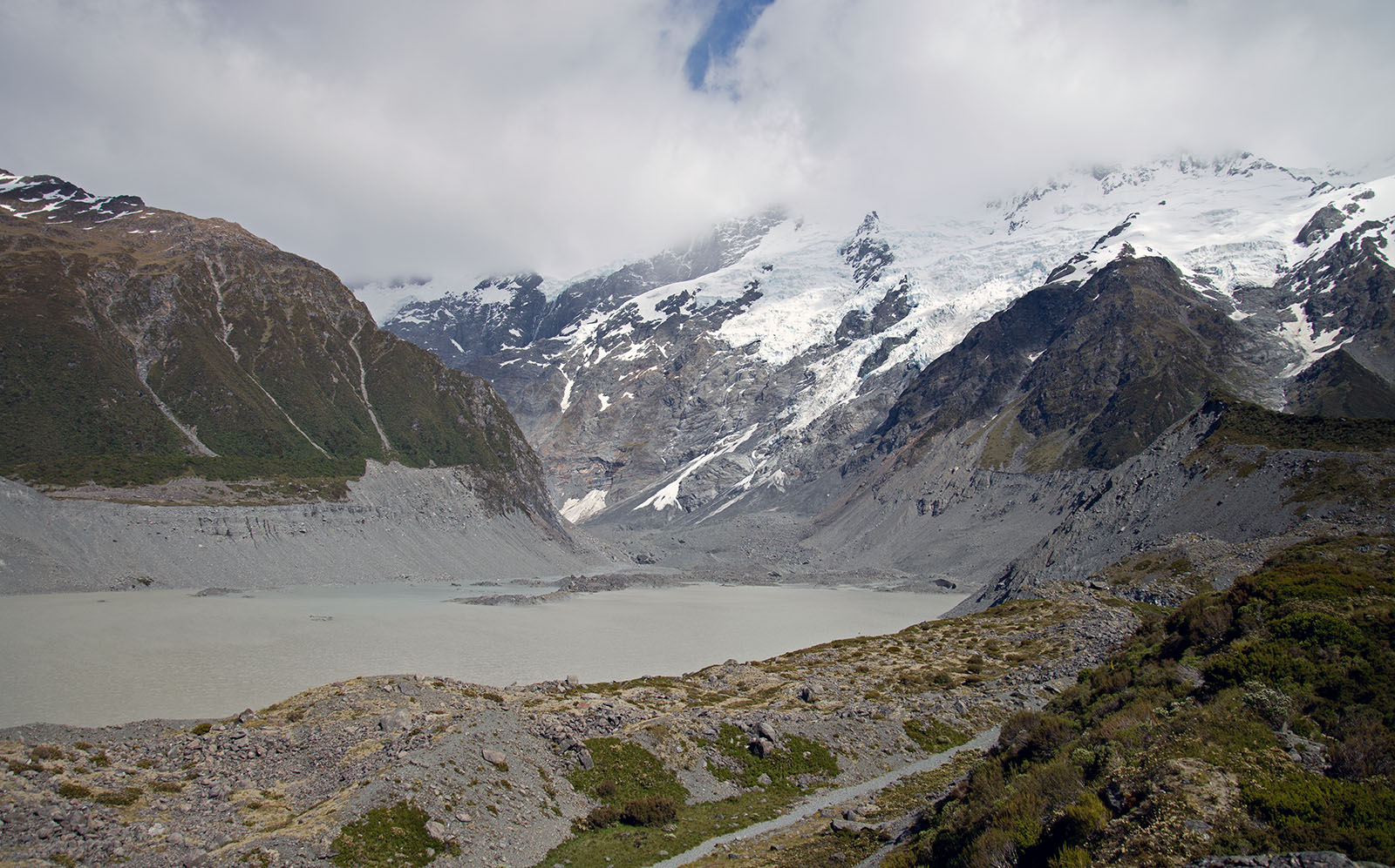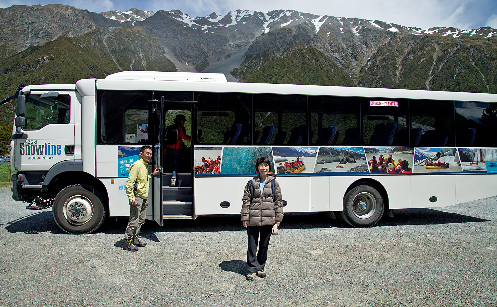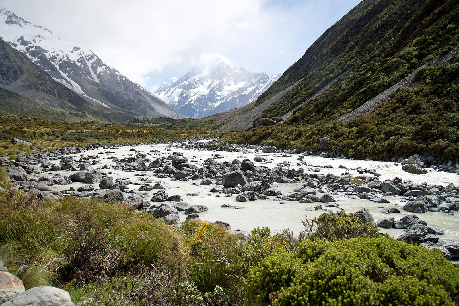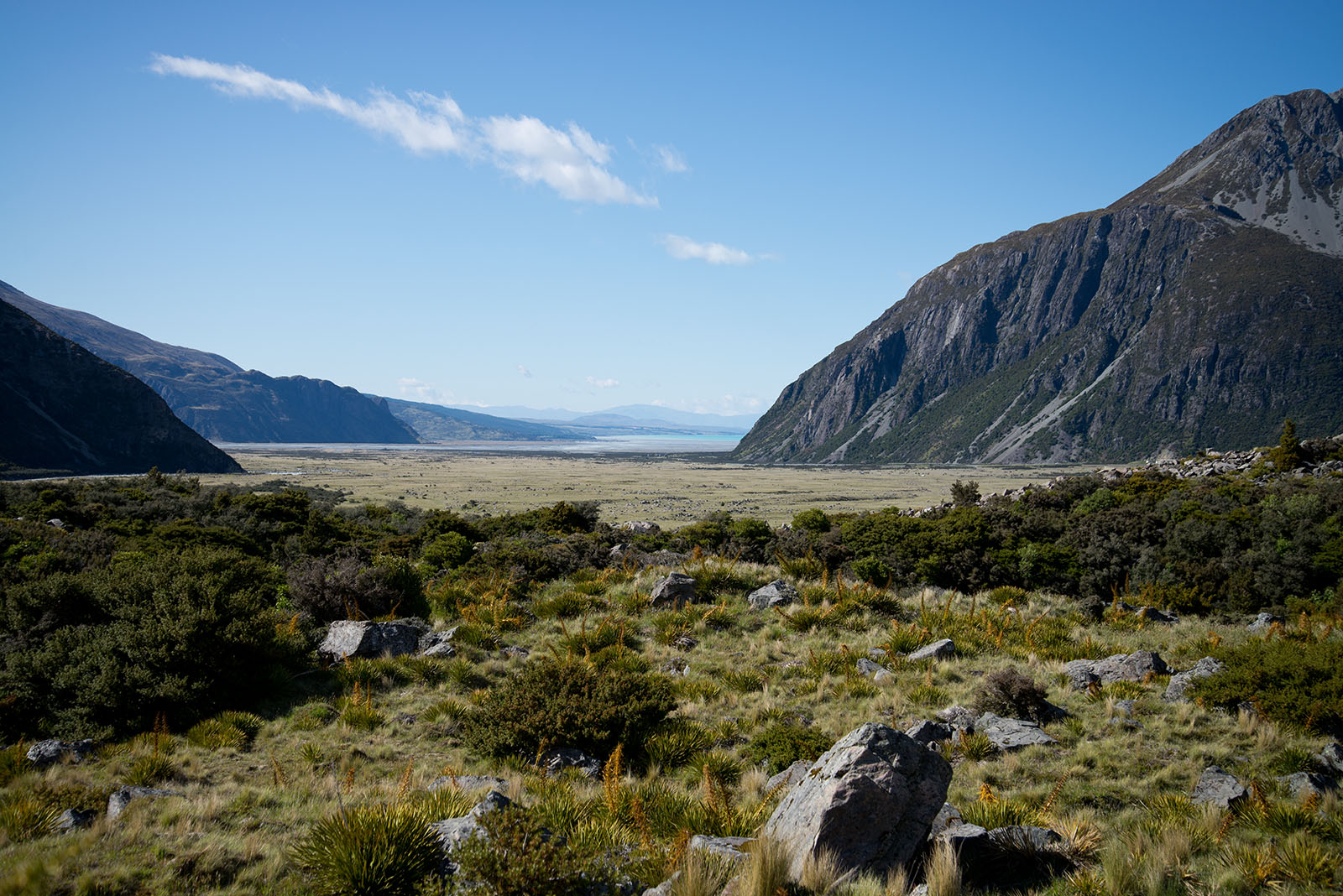 マウントクックの代表的なハイキングコースで、所要時間は約3時間半、歩行距離は往復で約7kmのコースです。訓練された日本語トレッキングガイドが同行し山や花、自然に関する詳しい御説明もありました。平坦なコース上では世界遺産に登録されているマウントクックの優美な姿や数多くの氷河や氷河湖を見ることができる。マウントクック村のキャンプ場からフッカー川に沿って、第二と第二の吊り橋を渡り、先の小さい橋の先(通称・水場)で折り返します。マウントクックに近づいた写真撮影のベストポイントです。また、周辺には11月中旬から11月にかけて、マウントクック・リリーが咲き誇り、目を楽しませてくれます。帰りには、眼下に不思議な青色のプカチ湖や、ハミテージホテルを遠望できる。