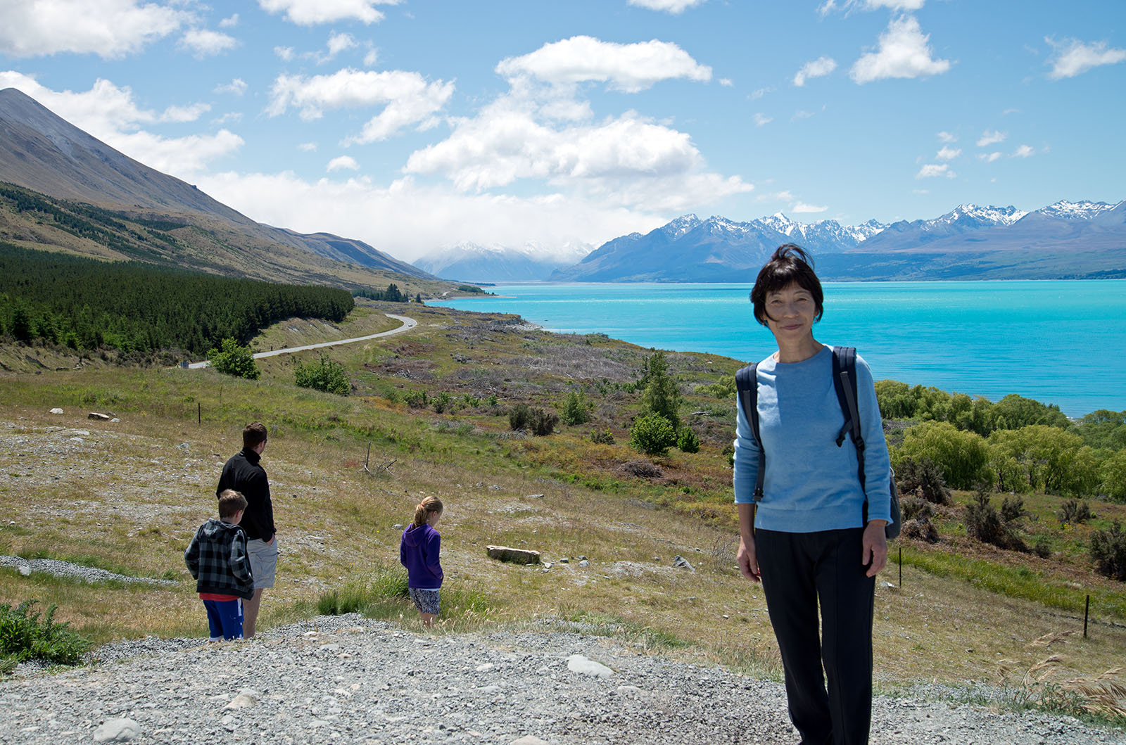 プカキ湖畔のマウントクックが美しく望めるポイント。あいにくマウントクックは雲の中
