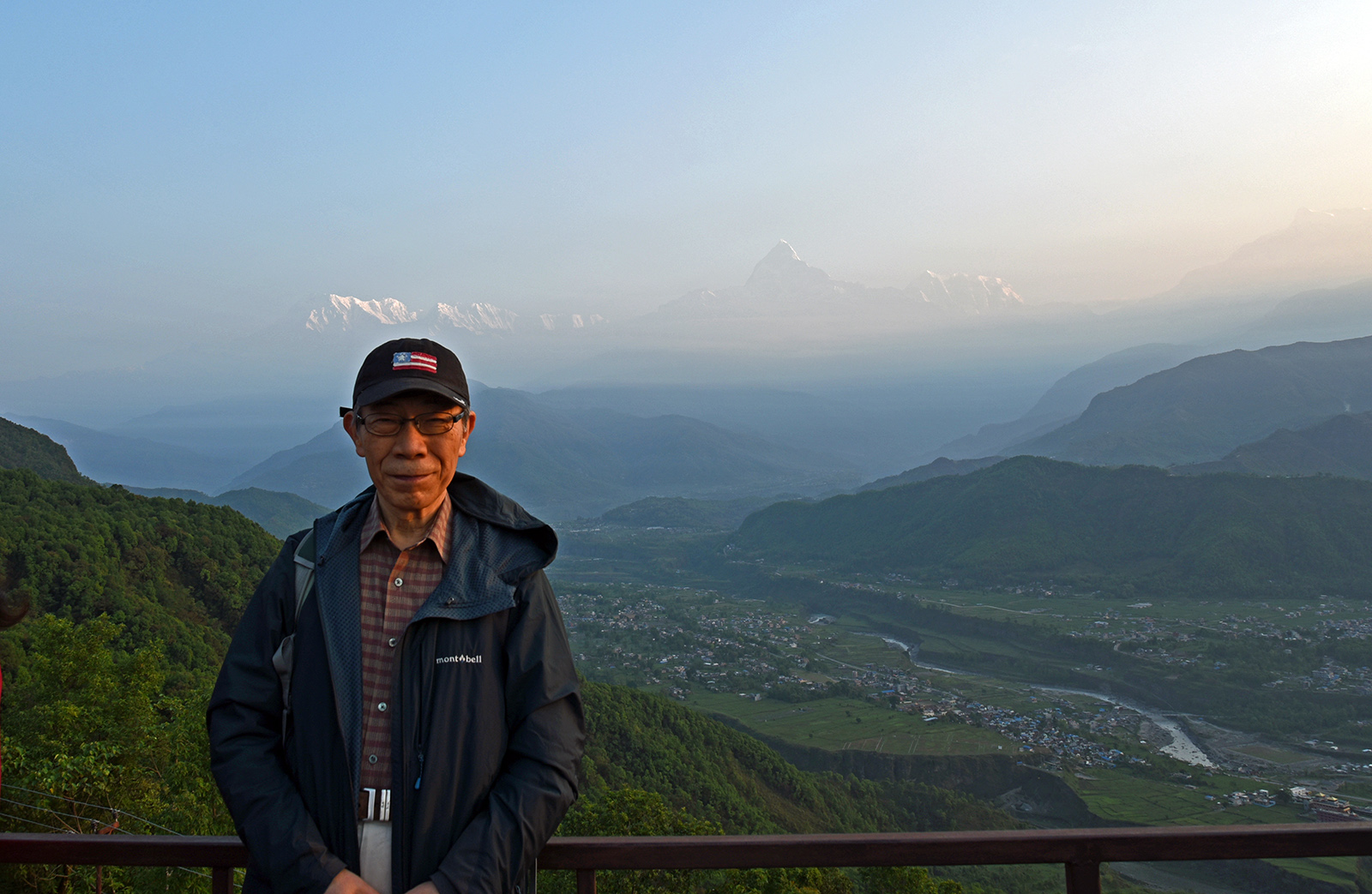 朝4時に起きて、暗い中をマイクロバスで山道を登り、日の出を見る。ヒマラヤフロントホテルはポカラの町からサランコットの丘に登る途中にある。