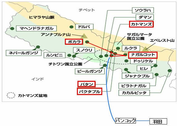 行程-地図 第1日:羽田発,バンコク乗換,カトマンズへ