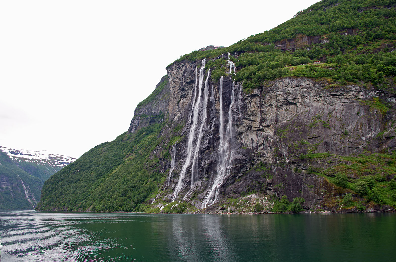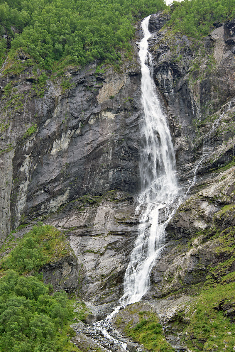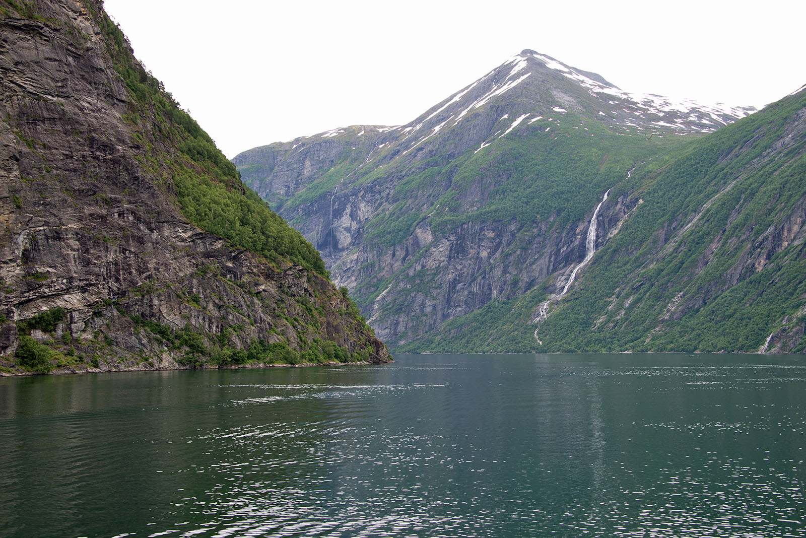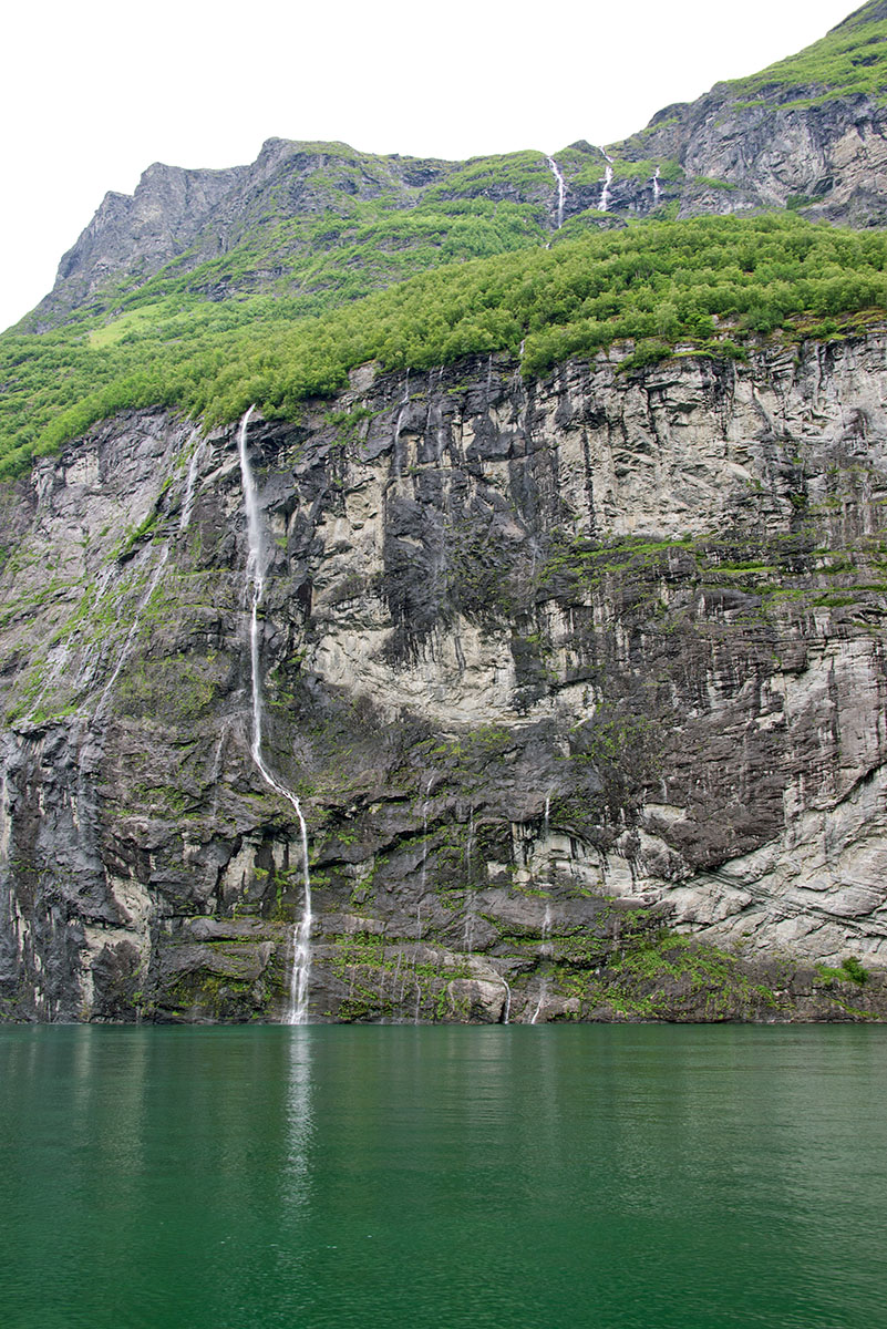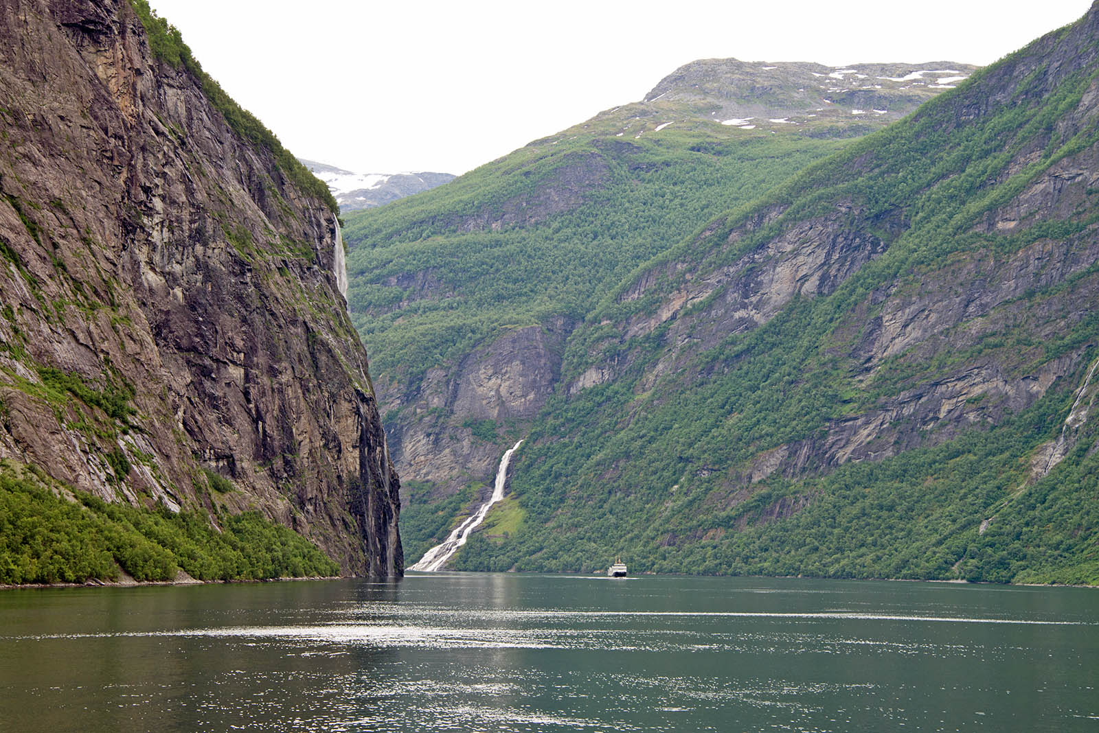 ガイランゲル~ヘルシルト間のクルーズは、フェリーで約1時間の旅です。山頂に氷河を抱く山々や、標高1200~1500mの切り立った断崖絶壁が両側に迫る。断崖絶壁の岩肌を流れ落ちるのは、繊細な流れの「花嫁のベール」あるいは「七人姉妹」と呼ばれる7筋の滝、酒瓶の形のような「求婚者の滝」など数々の滝がある。