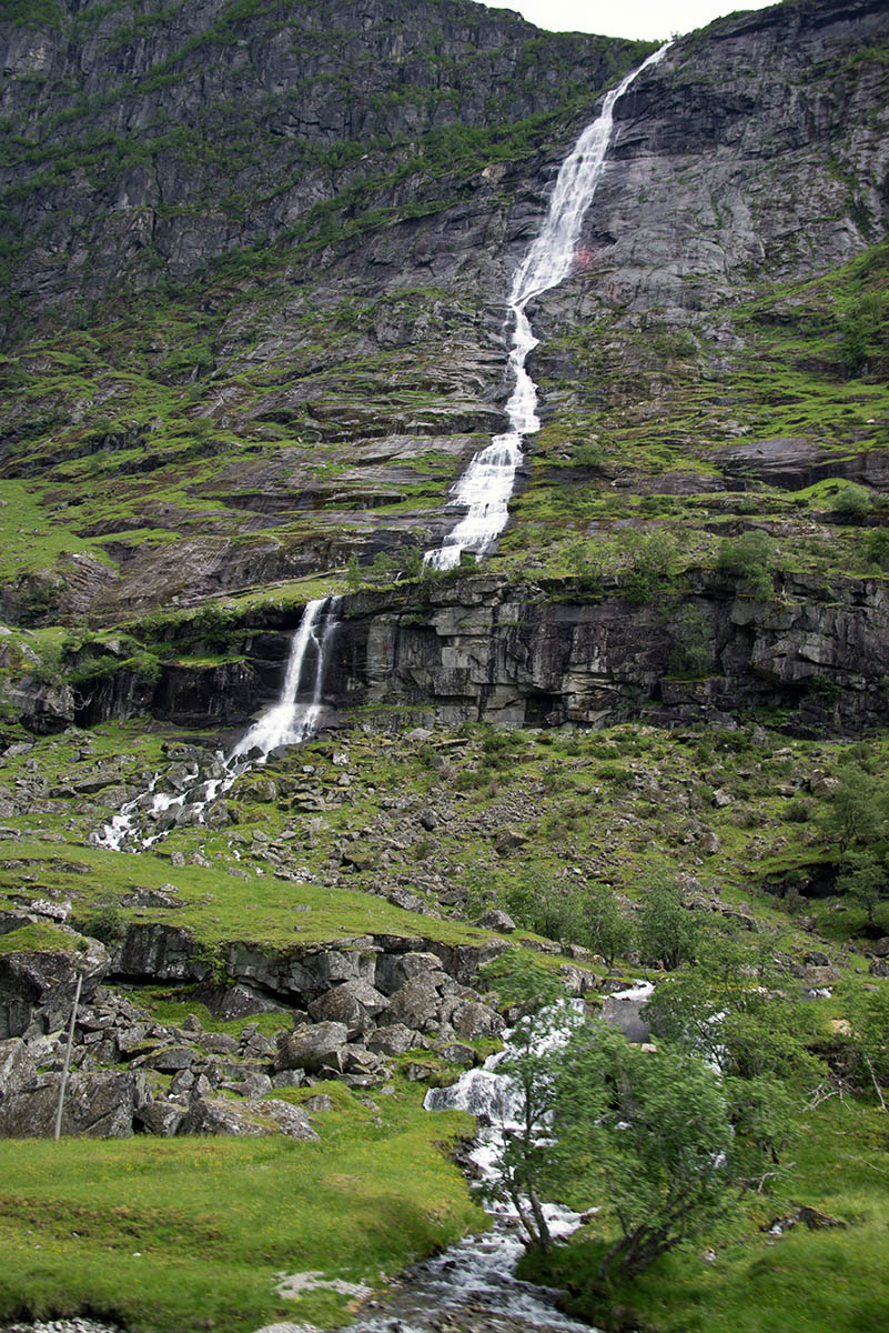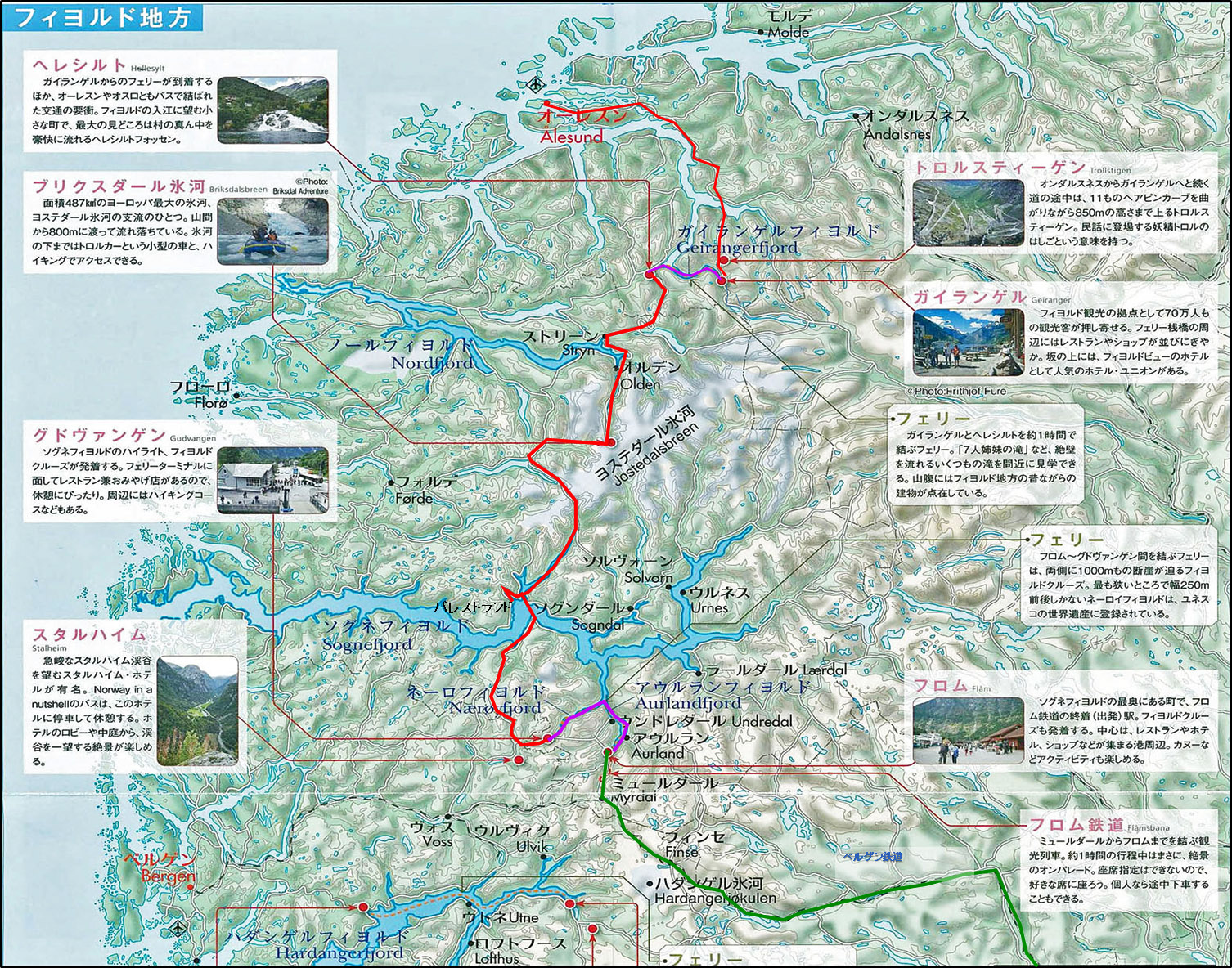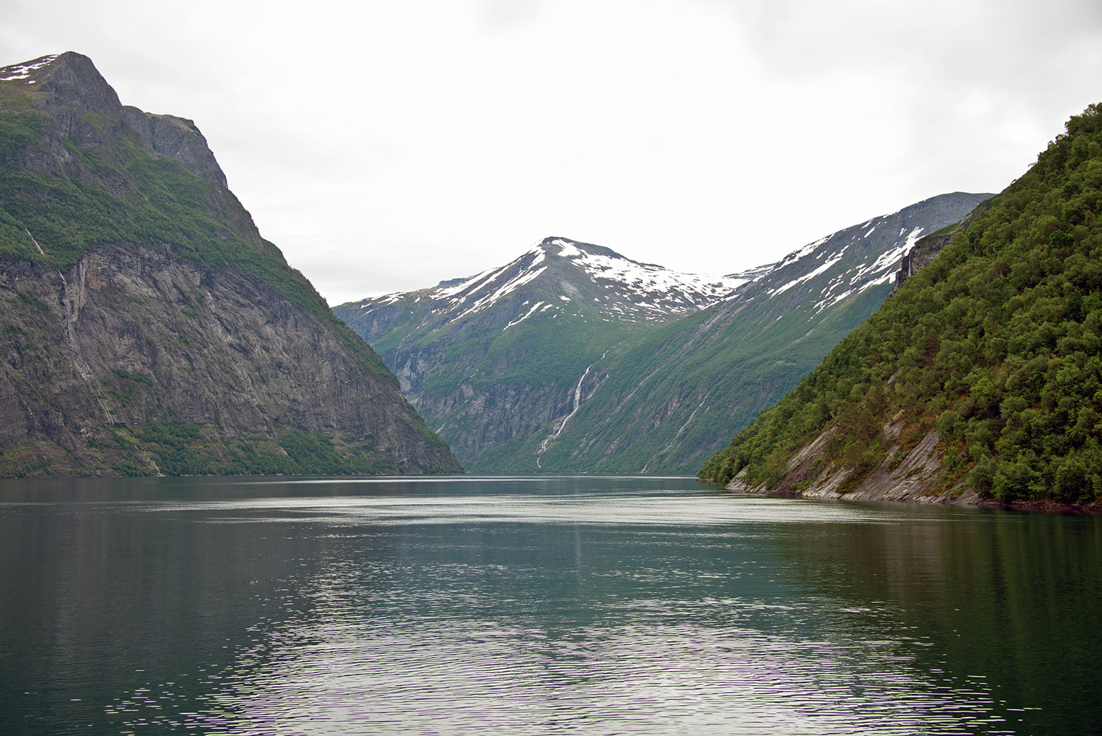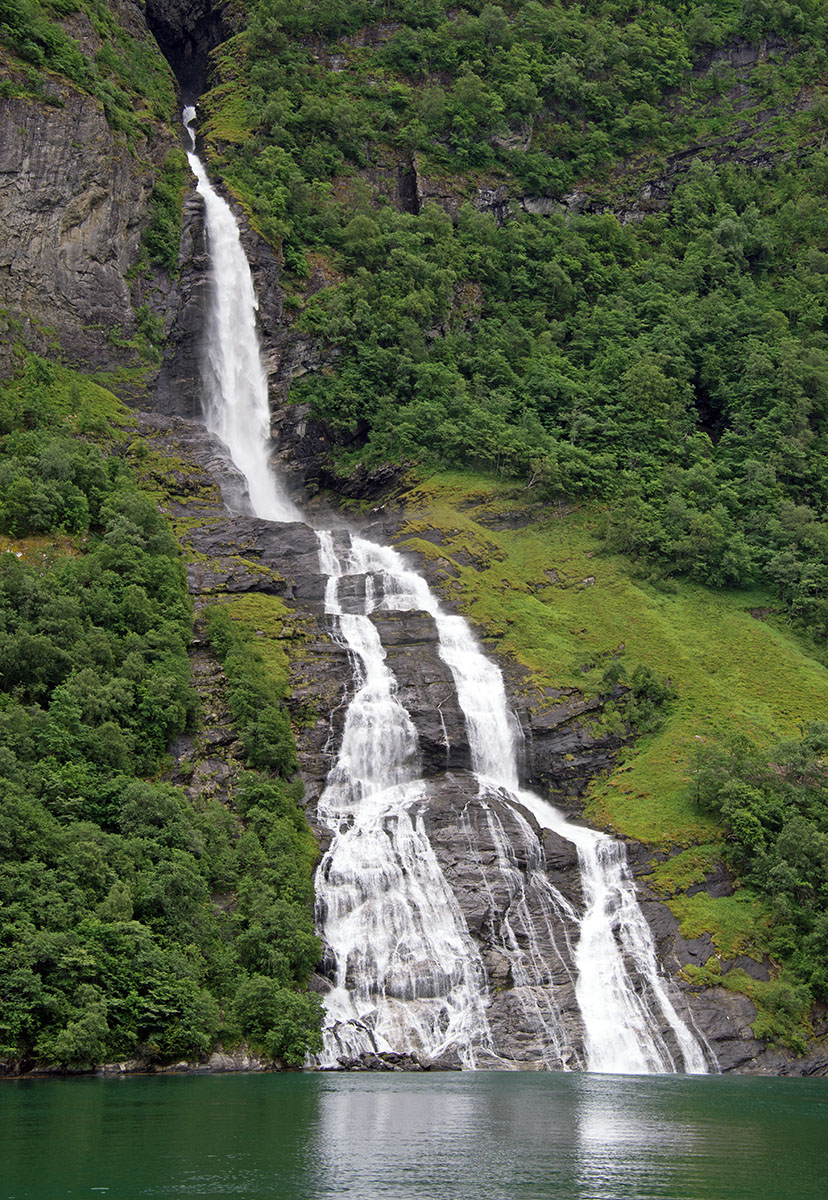 ガイランゲル~ヘルシルト間のクルーズは、フェリーで約1時間の旅です。山頂に氷河を抱く山々や、標高1200~1500mの切り立った断崖絶壁が両側に迫る。断崖絶壁の岩肌を流れ落ちるのは、繊細な流れの「花嫁のベール」あるいは「七人姉妹」と呼ばれる7筋の滝、酒瓶の形のような「求婚者の滝」など数々の滝がある。