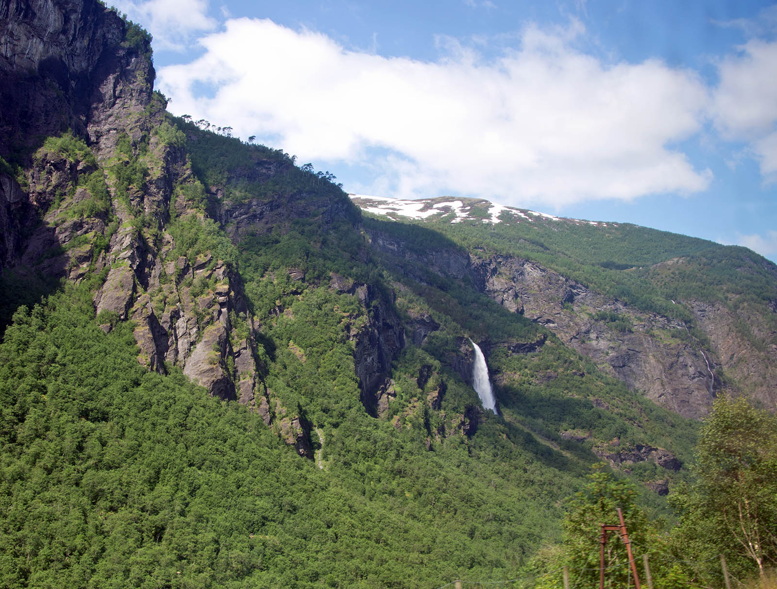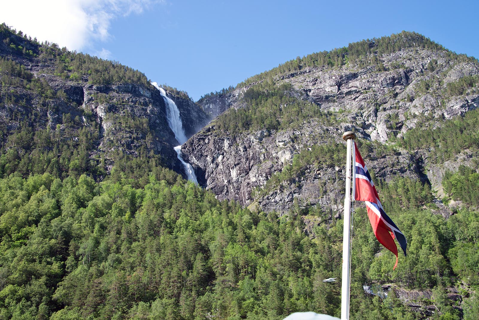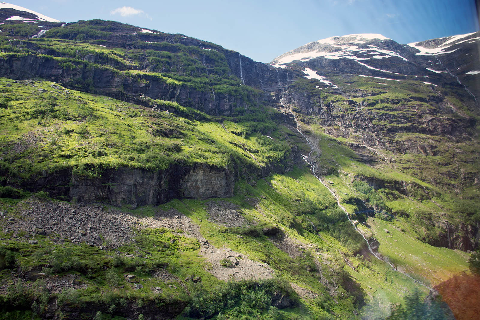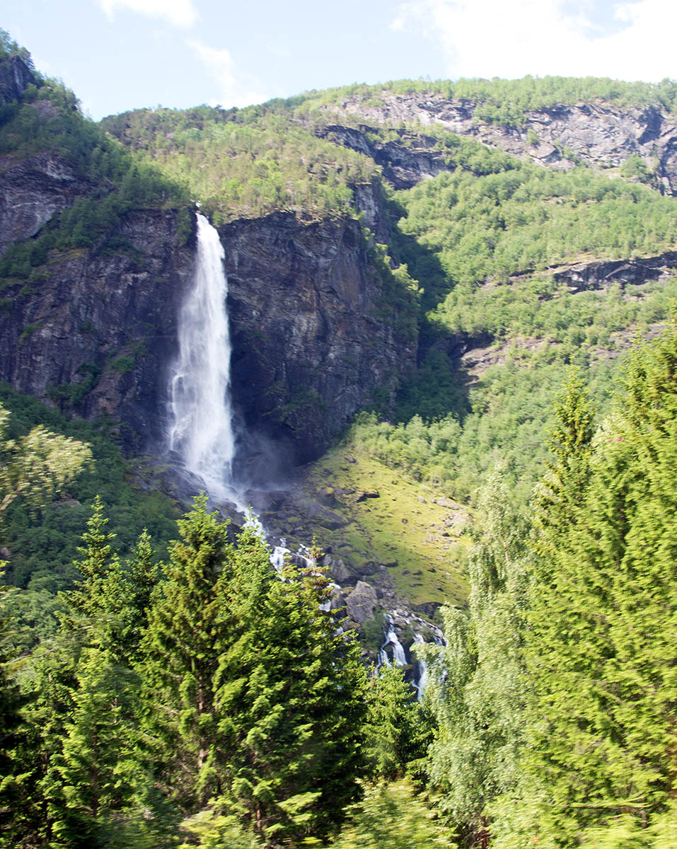 列車からフィヨールドを鑑賞 山頂から滝が流れちている。