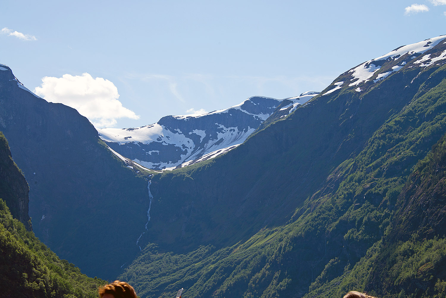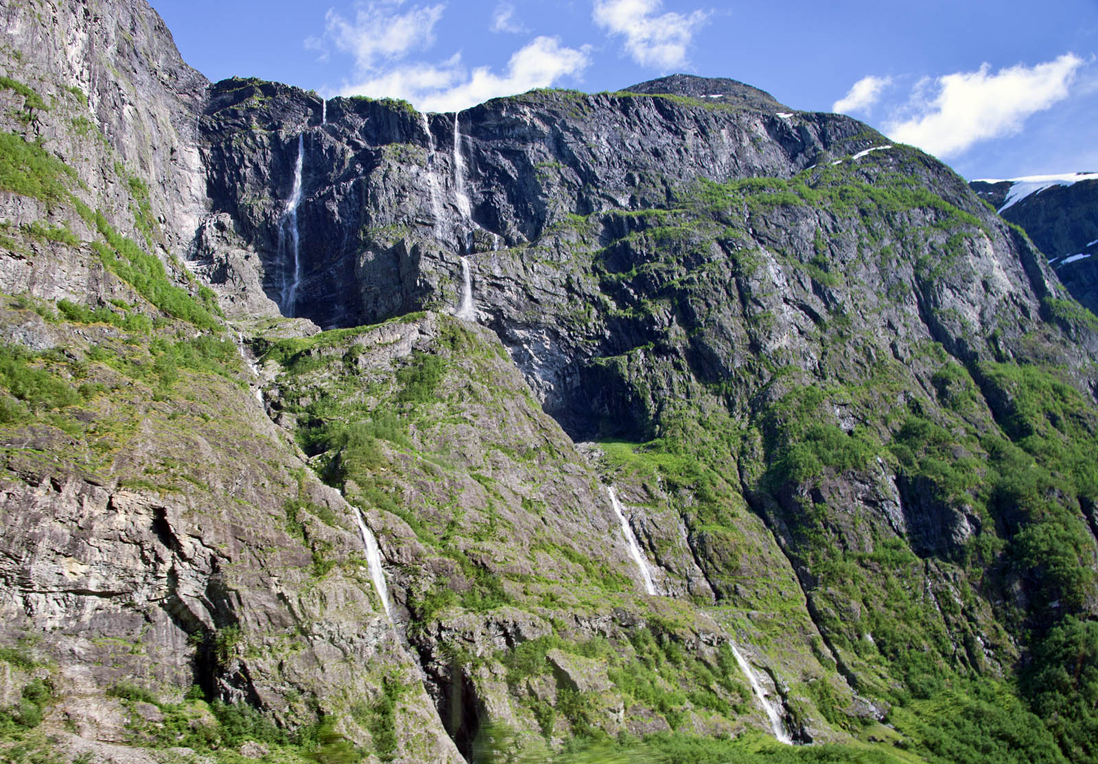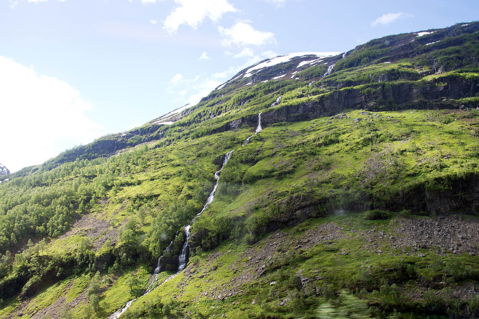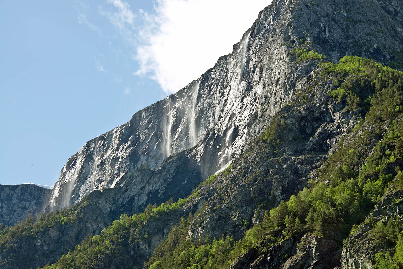 列車からフィヨールドを鑑賞 山頂から滝が流れちている。