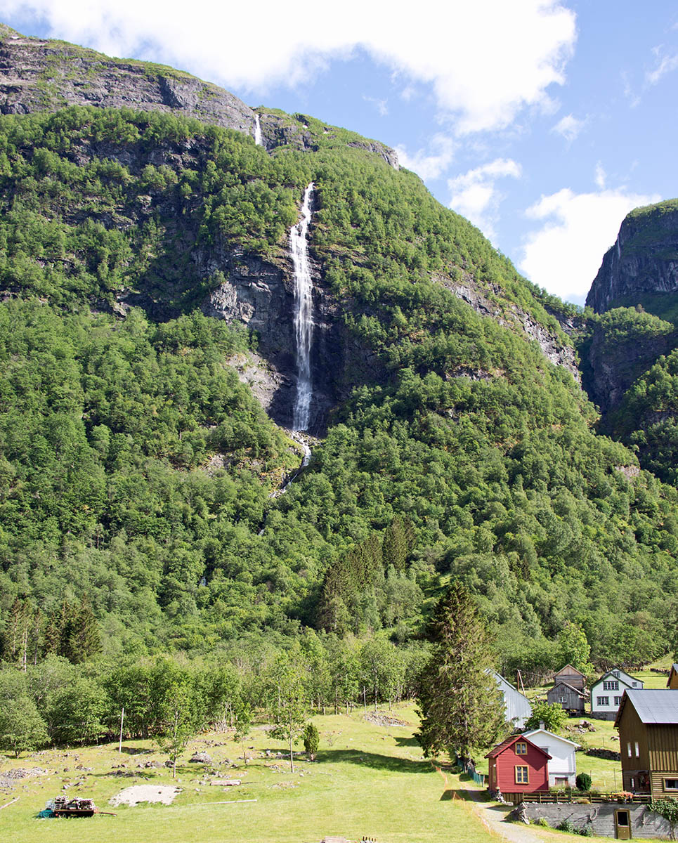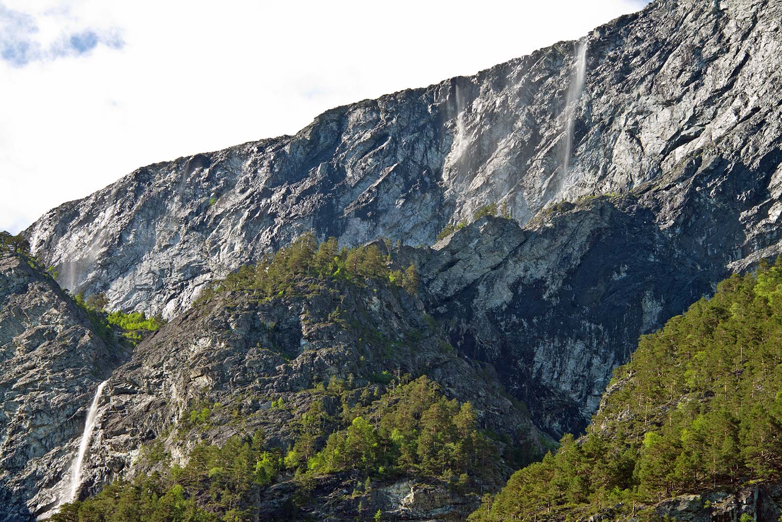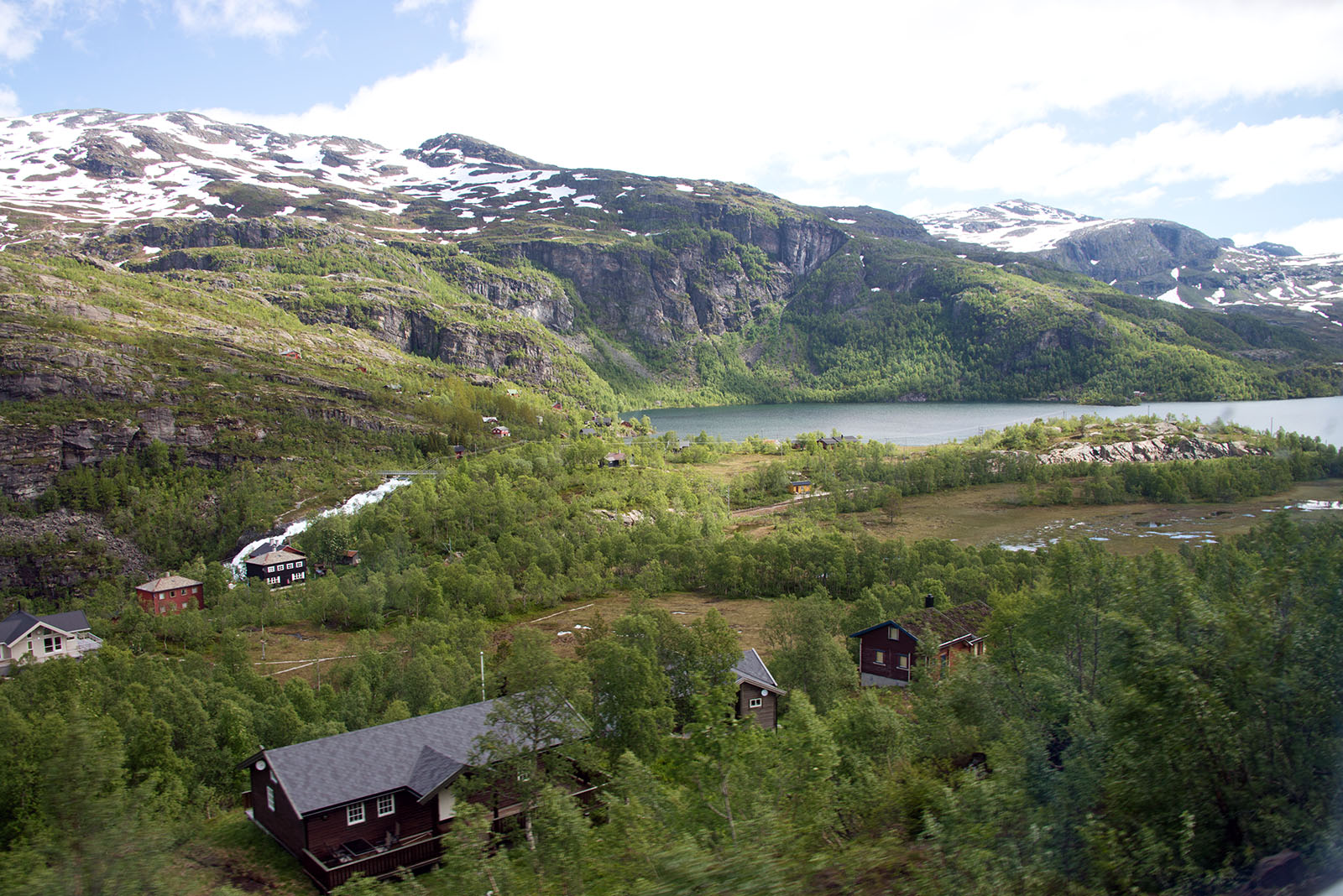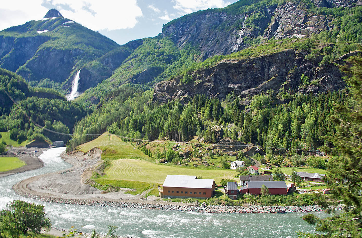列車からフィヨールドを鑑賞 山頂から滝が流れちている。