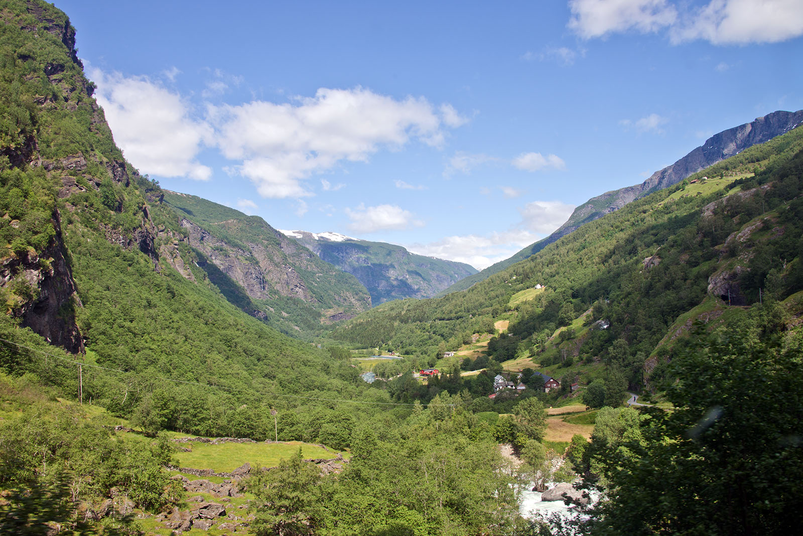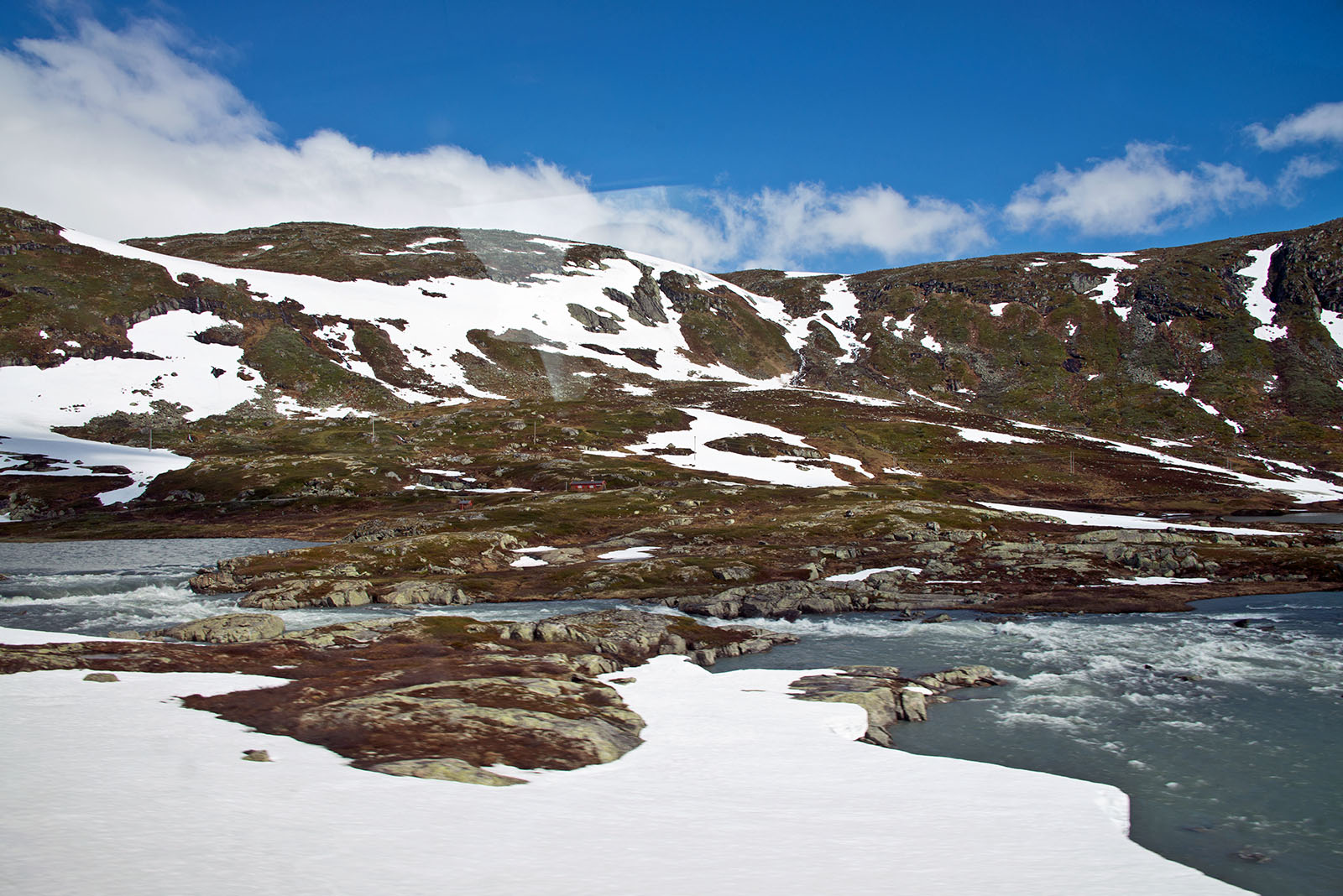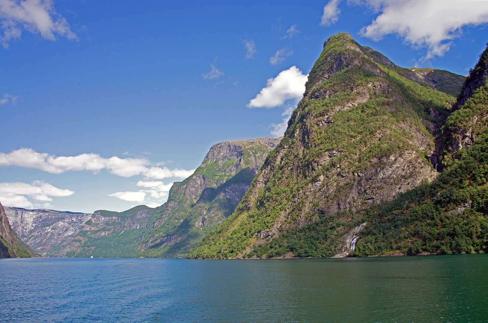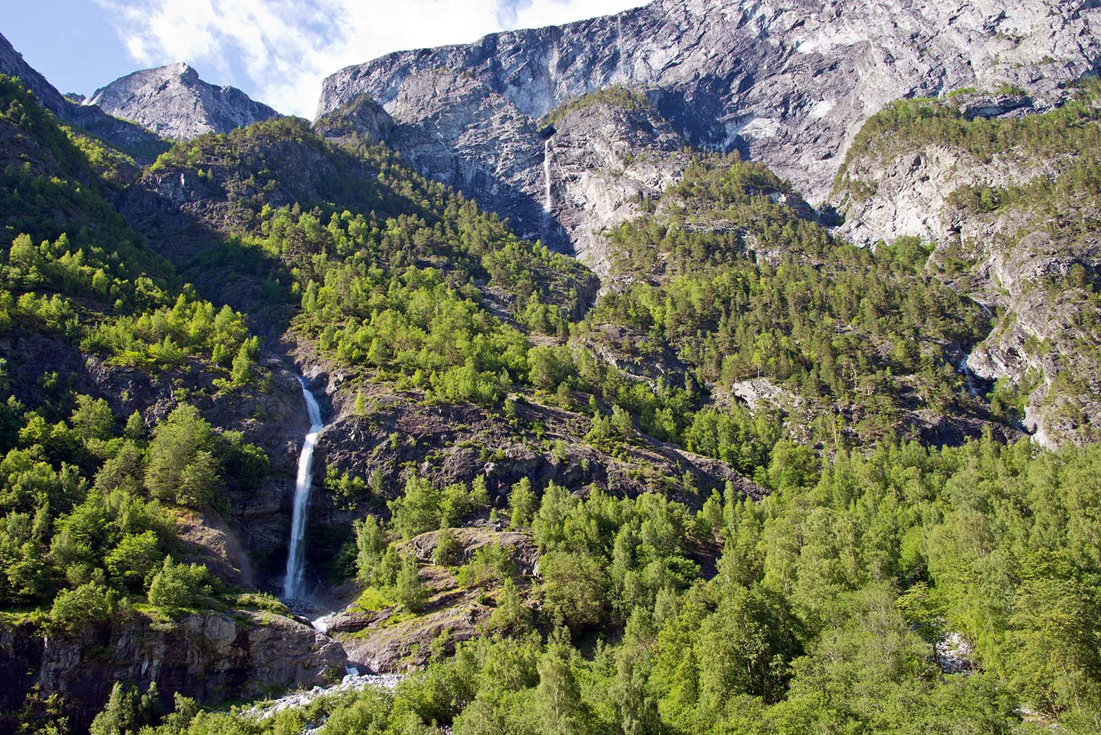 列車からフィヨールドを鑑賞 山頂から滝が流れちている。