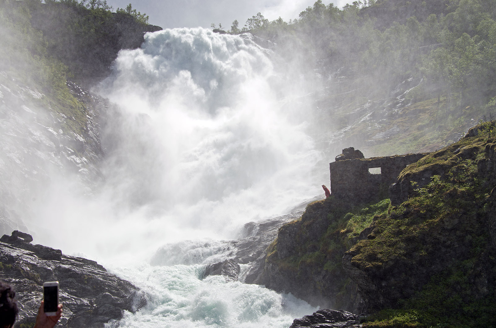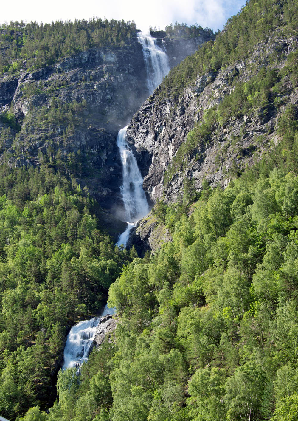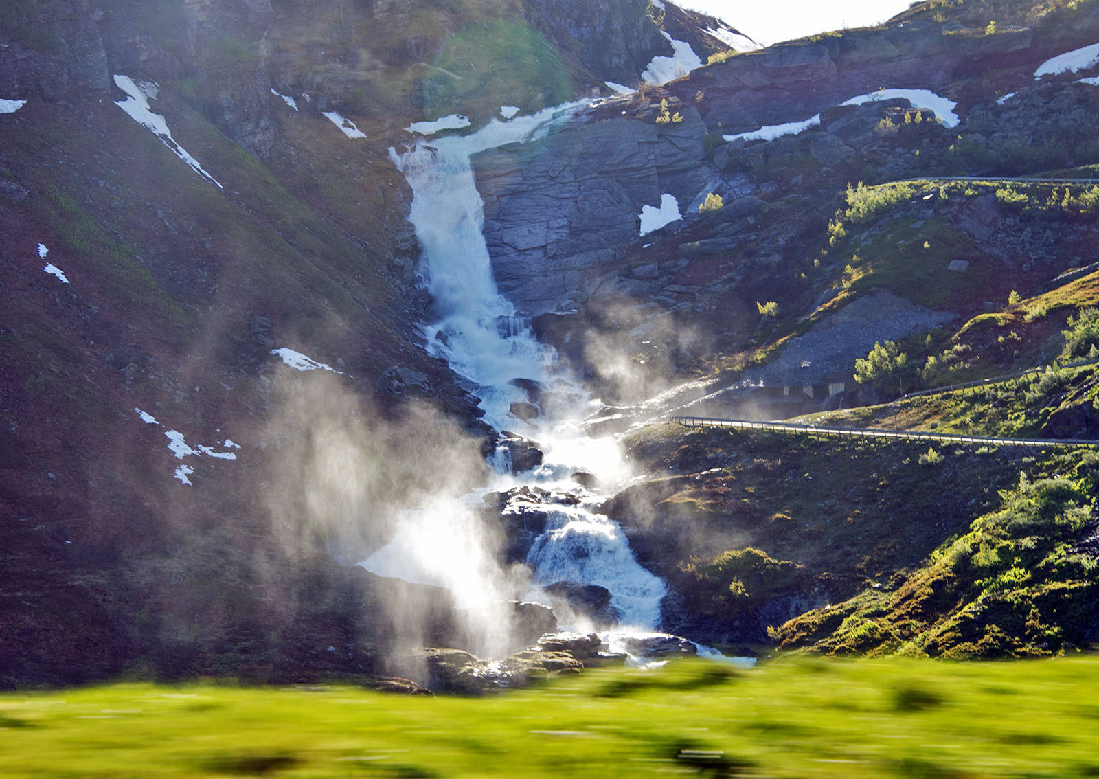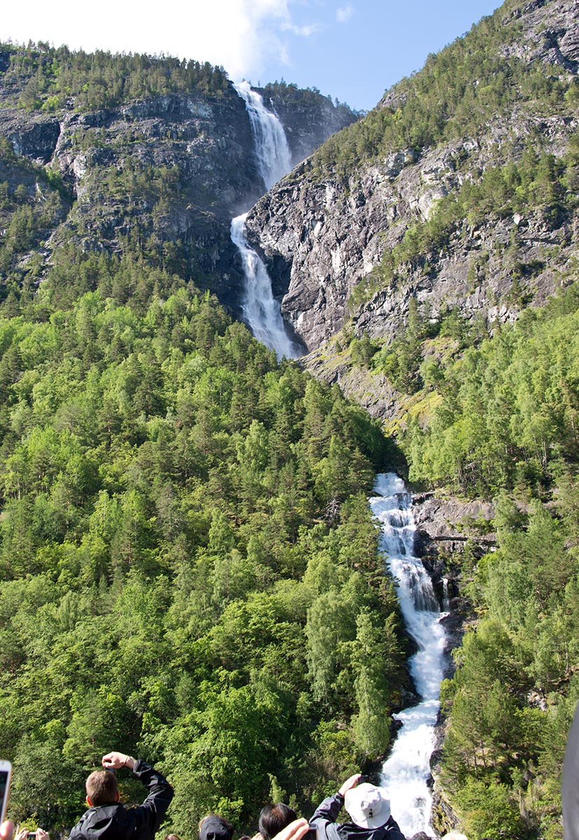 ミュルダル駅から曲がりくねったトンネルの多い路線を10分ほど進むとショース滝に着き5分ほど停車。海抜630mのショース滝は全長93mあり、海抜767mのレイヌンガ湖を水源とする。水しぶきでよく見えないほど水量の多い。山の妖精が踊りと音楽で迎えてくれる。