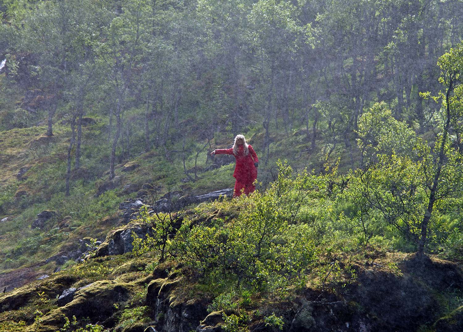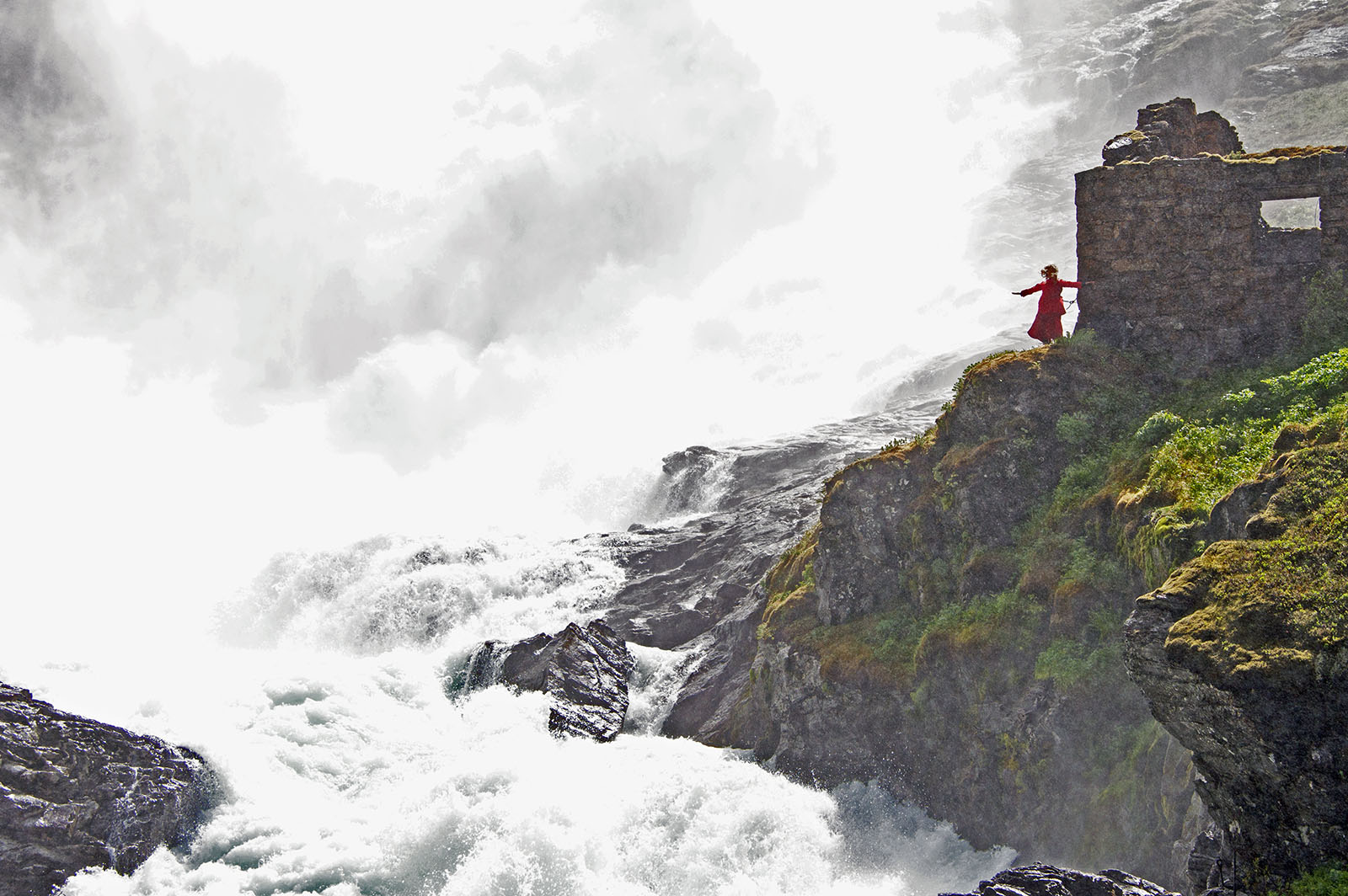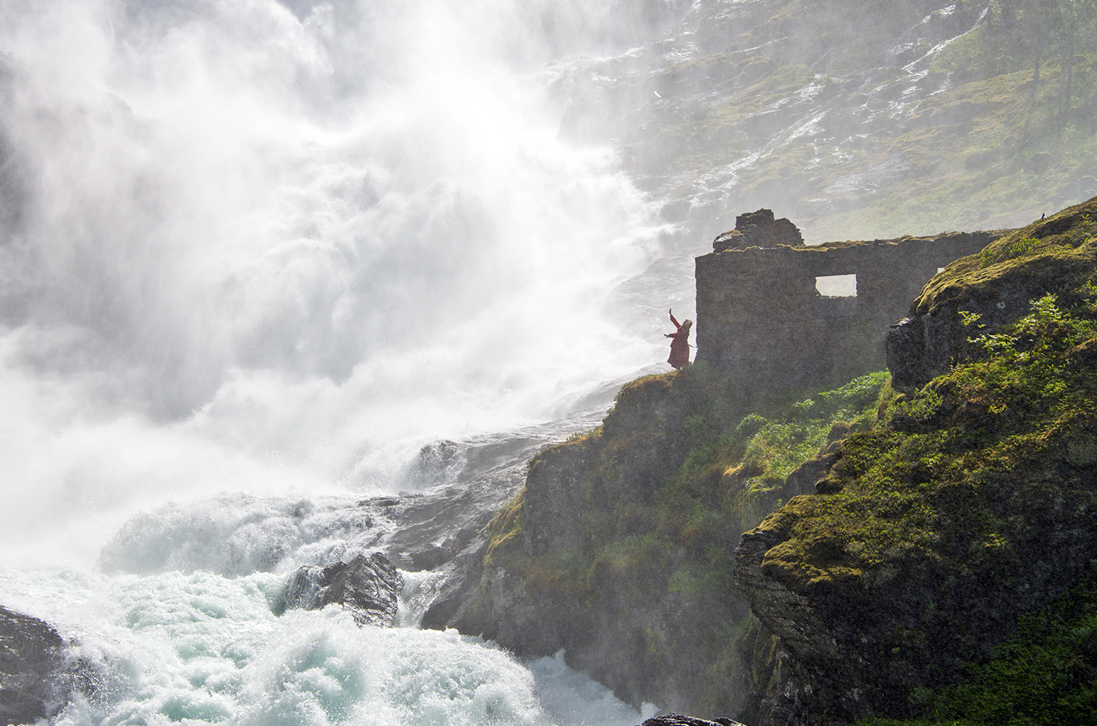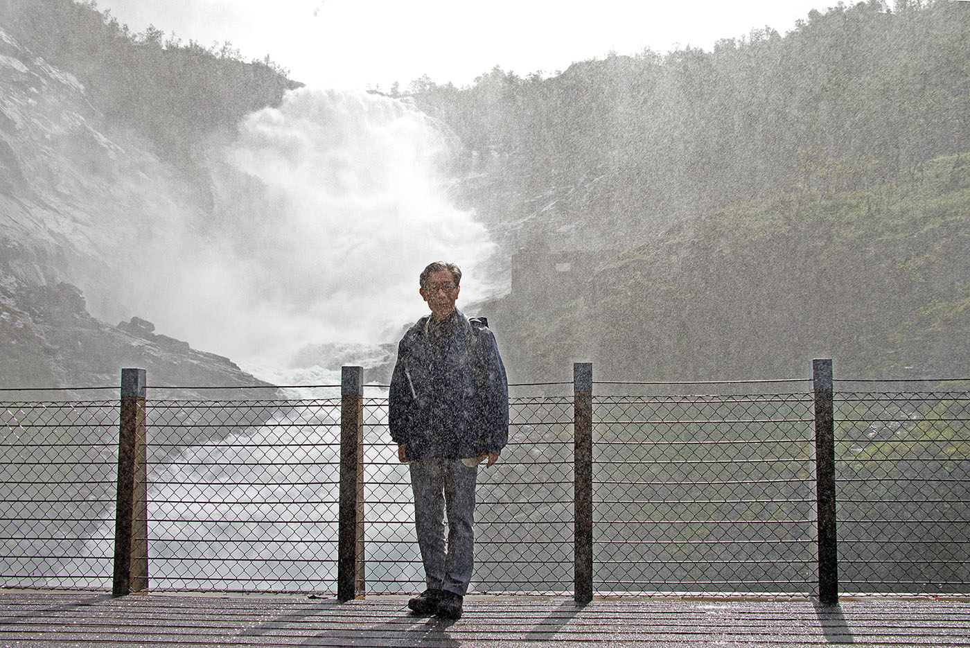 ミュルダル駅から曲がりくねったトンネルの多い路線を10分ほど進むとショース滝に着き5分ほど停車。海抜630mのショース滝は全長93mあり、海抜767mのレイヌンガ湖を水源とする。水しぶきでよく見えないほど水量の多い。山の妖精が踊りと音楽で迎えてくれる。