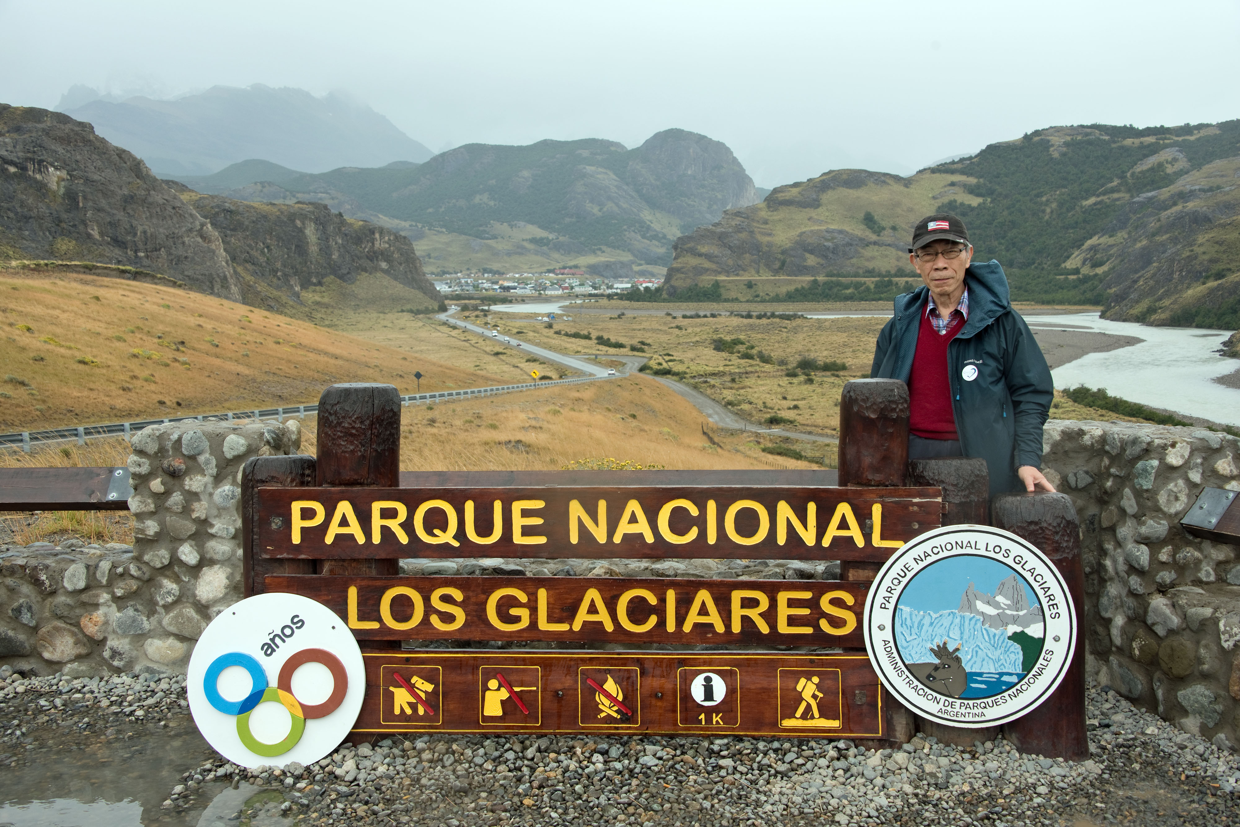 ロス・グラシアレス国立公園標識 遠景にフィッツ・ロイが見えるはず。