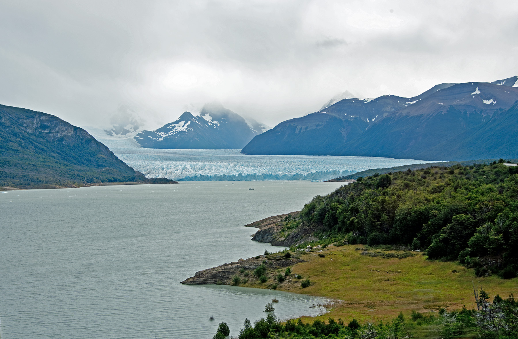 ペリト•モレノ氷河 北側 左端では氷河が陸に乗り上げ、ダムになっており、左側のブラゾ水路の水位が高くなっている。