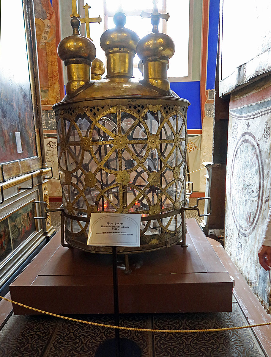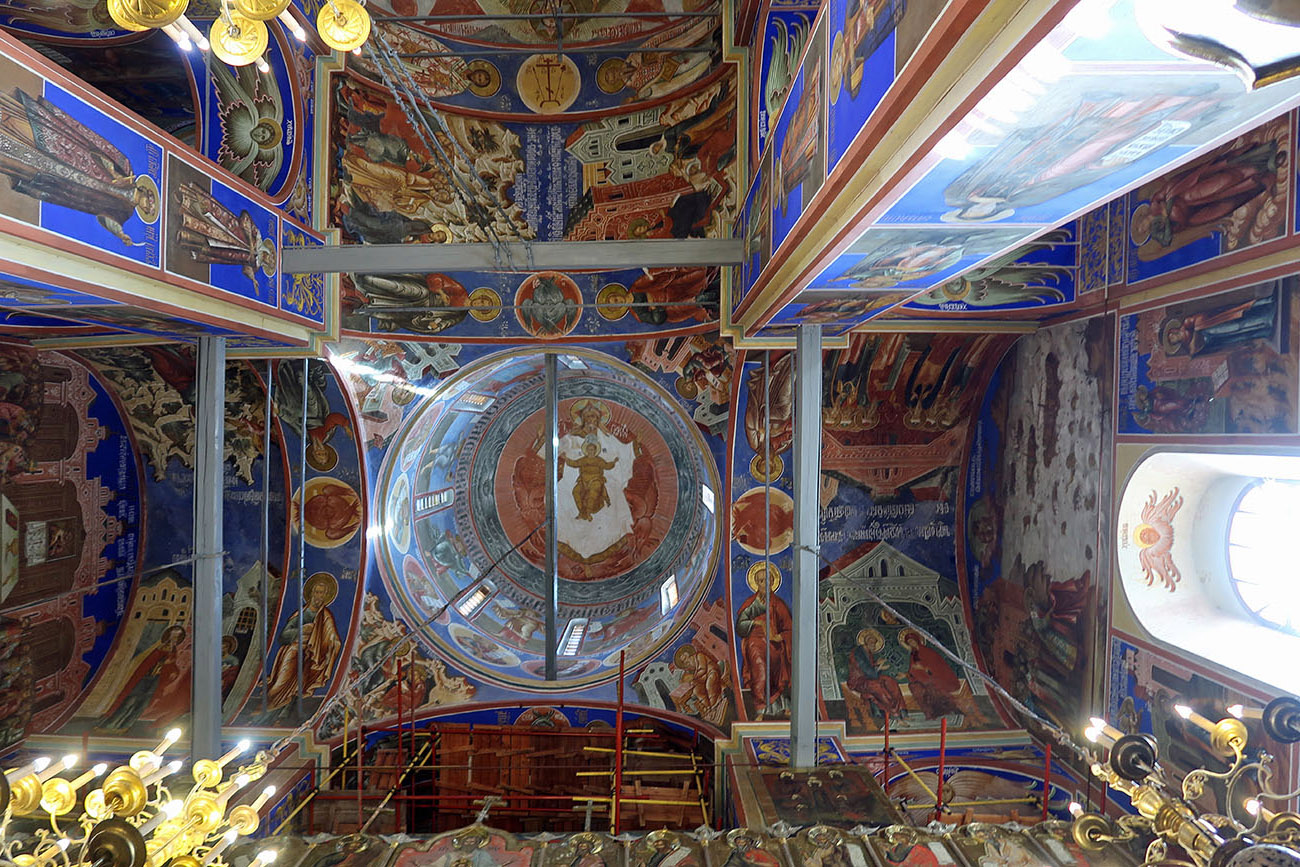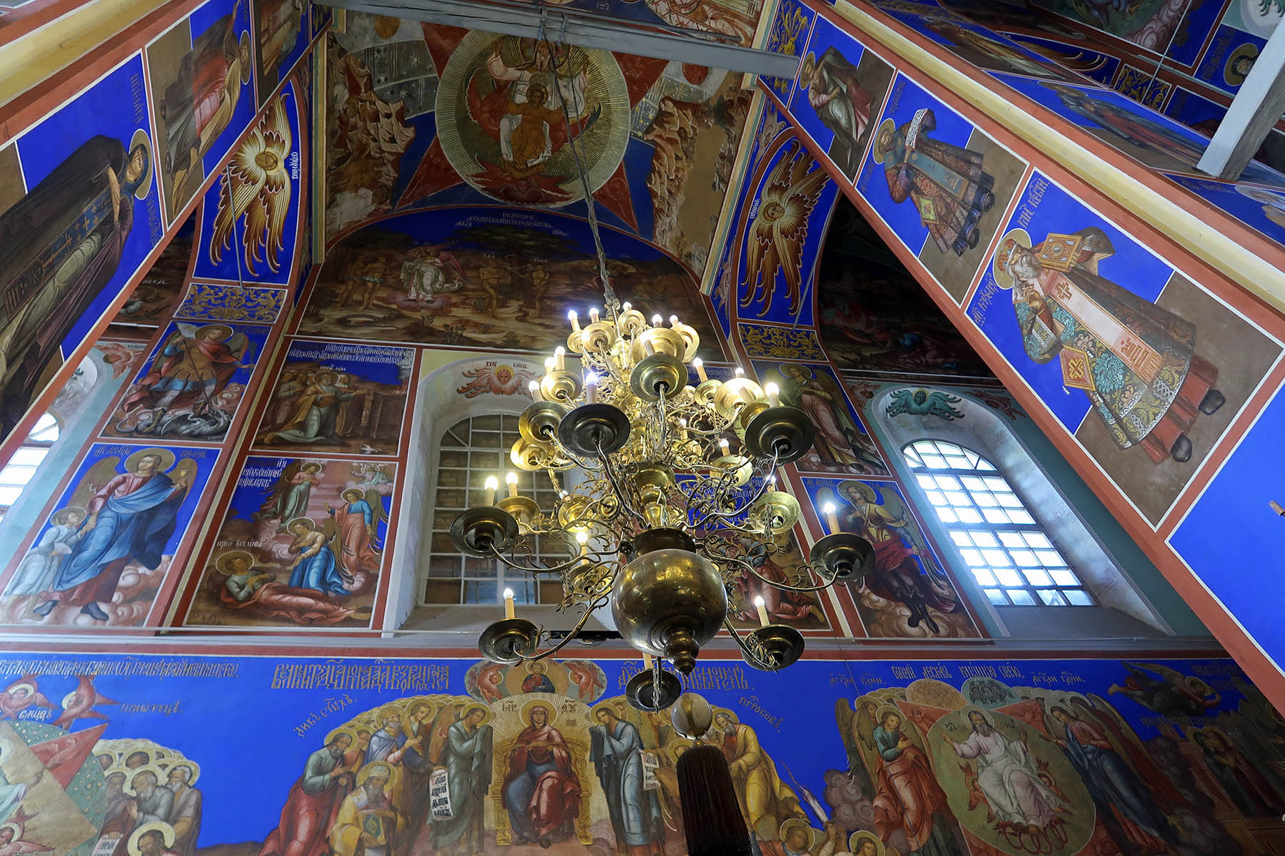 聖堂内のフレスコ画(青色が輝く)と十字架