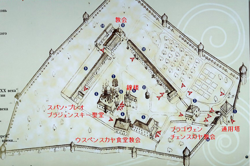中央:スパソ・プレオブラジェンスキー聖堂、右:鐘楼