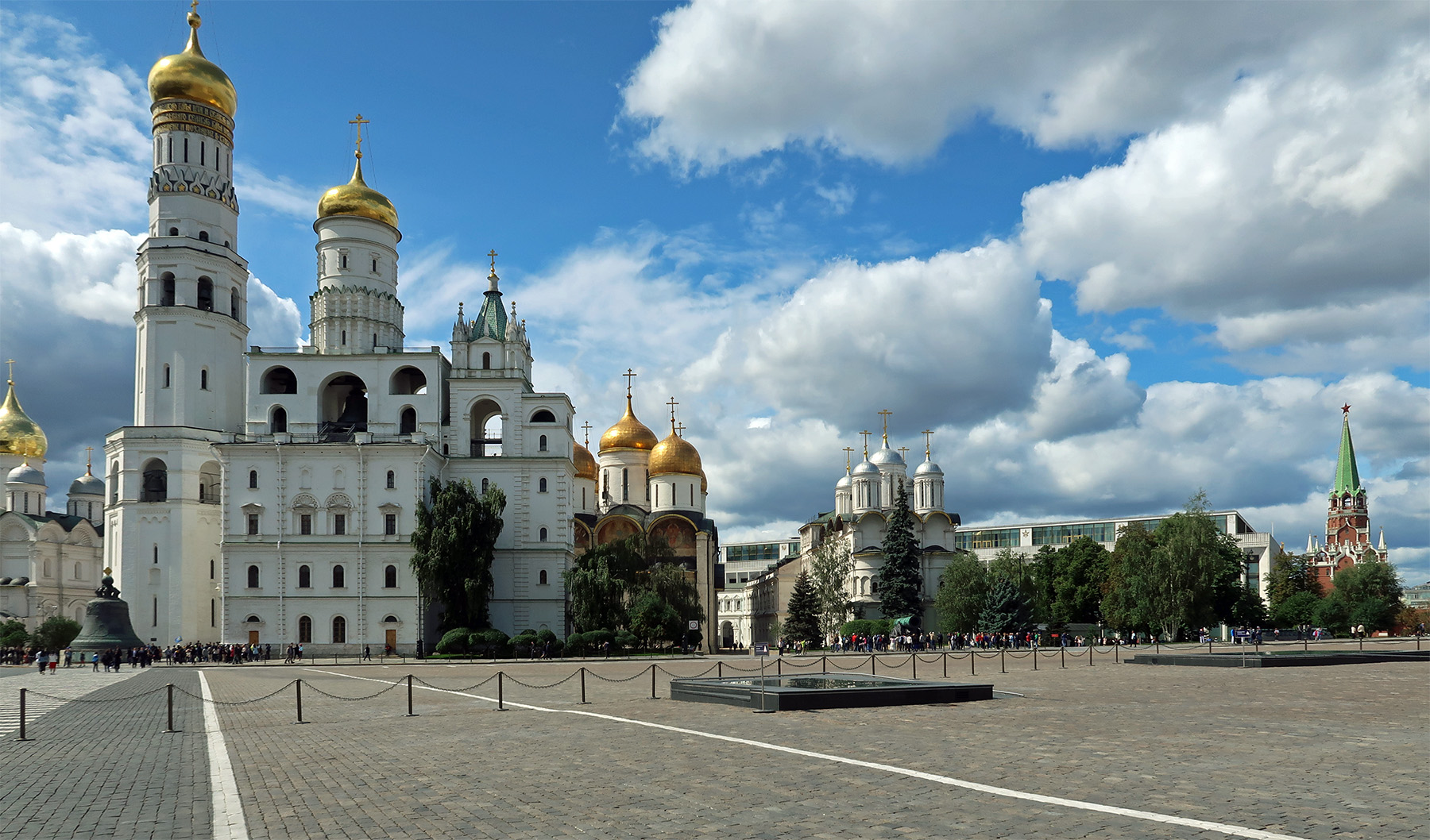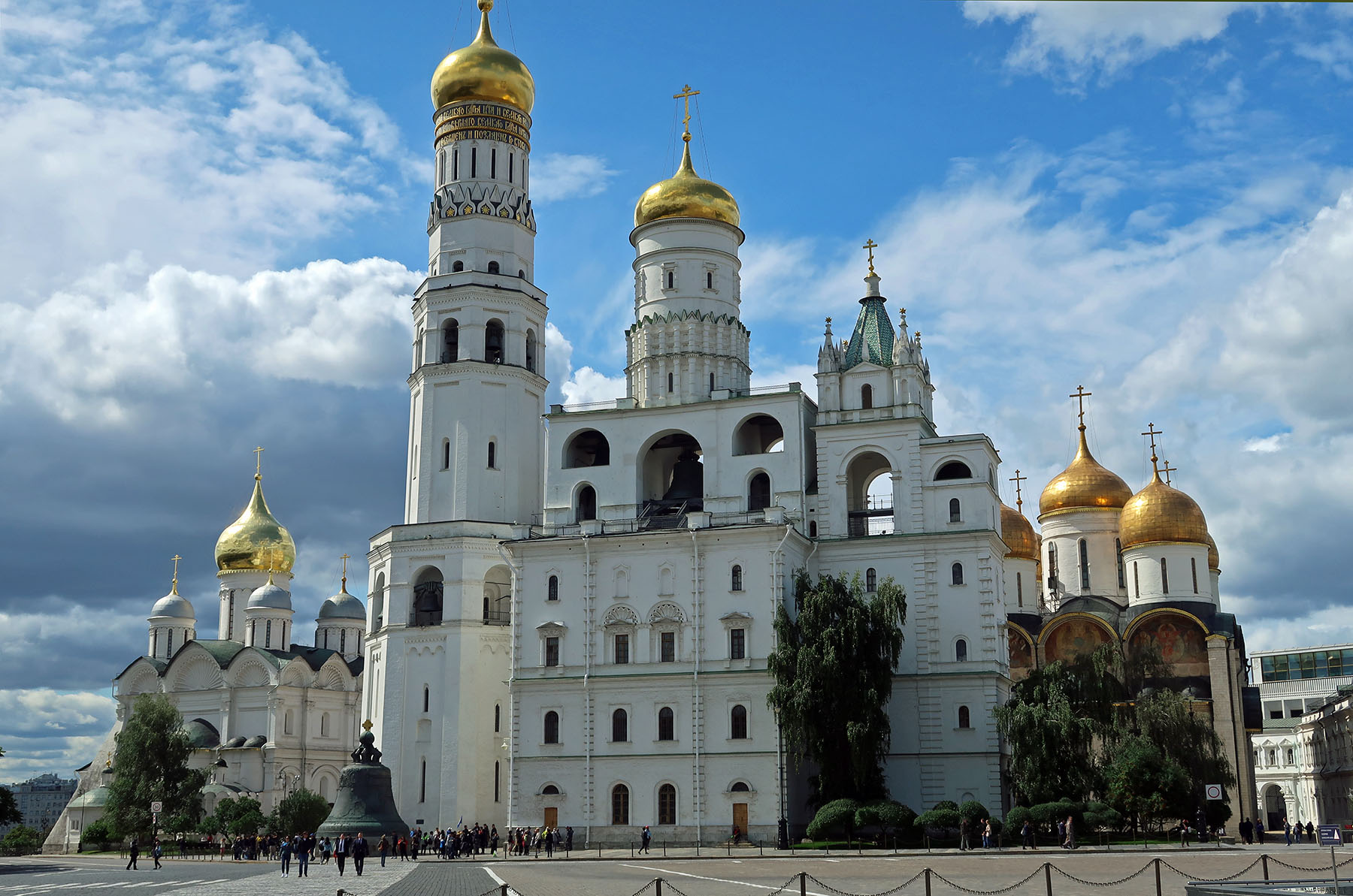 左奥:アルハンゲルスキー聖堂, 手前:イワン大帝の鐘楼, 鐘の皇帝, 金色の玉葱のウスペンスキー大聖堂, 銀色の玉葱のパトリアーシュ宮殿, 近代的なクレムリン宮殿, 右端:トロイツカヤ塔