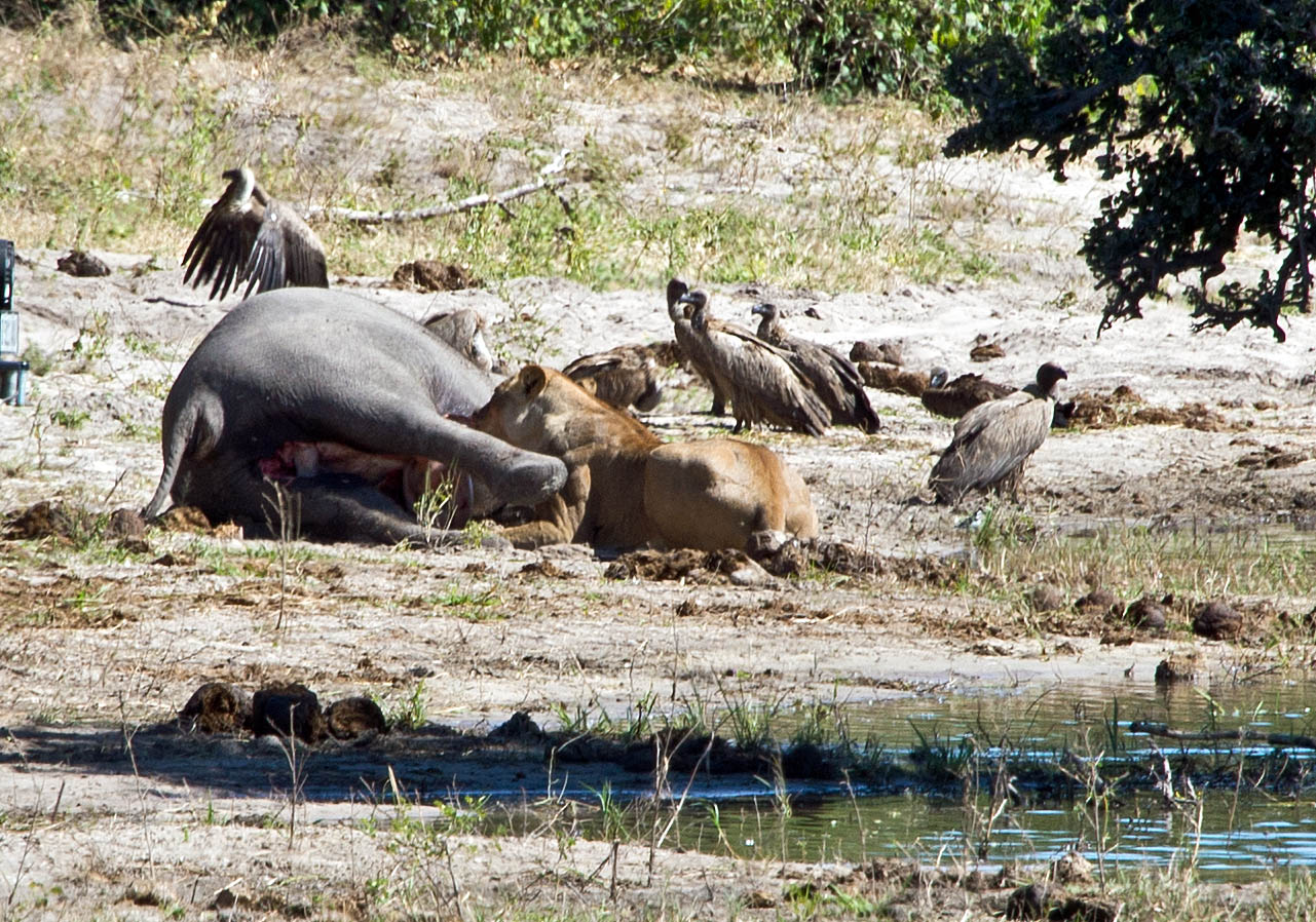 ライオンの雌が死んだ象の肉を食べている。
