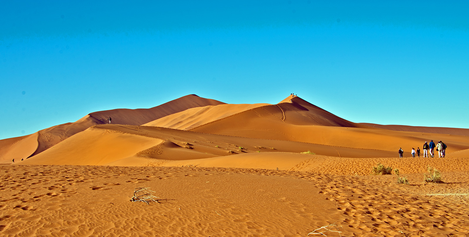 赤い砂丘に登りながら、ナミブ砂漠の中心部ソッサスフレイ、最深部のデッドフレイへ