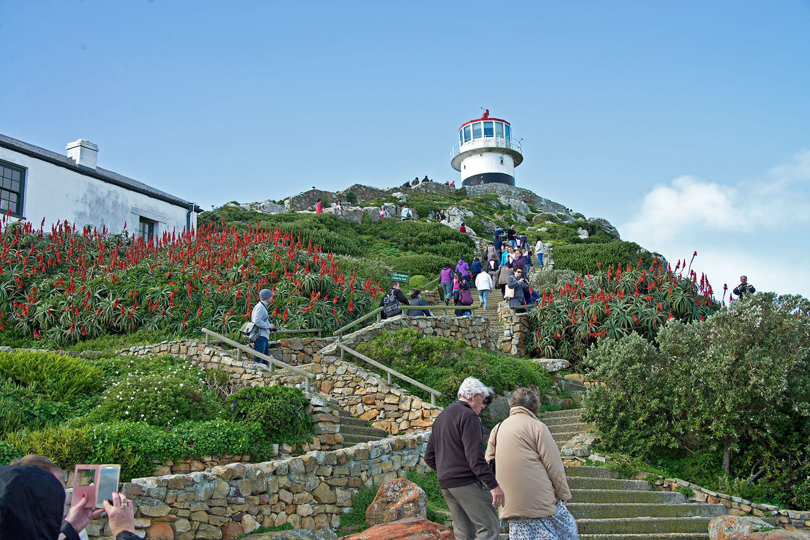 ケープポイントから見下ろす喜望峰 赤い花はアロエ