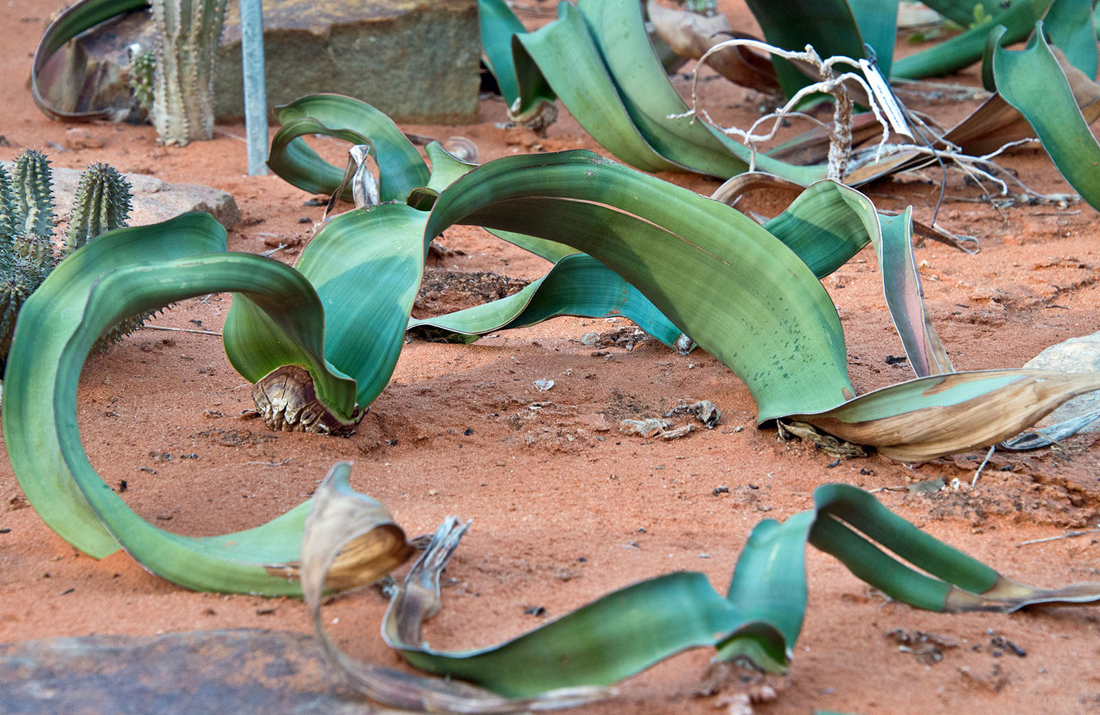 若いウイルウイッチア 葉は2枚しかないが、樹齢とともに葉がさけて、複雑な形になる。