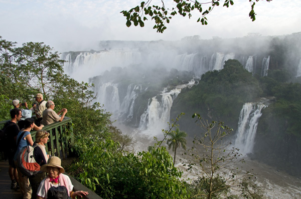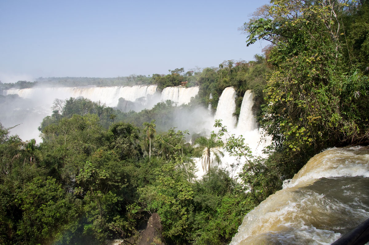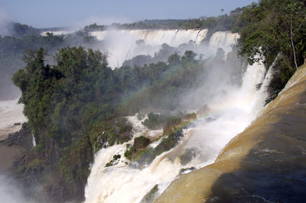 手前の遊歩道からの見物,延々と続く滝壺と目前に迫力ある流れを体感.あちこちに虹が見える. ブラジル側では水しぶきが霞となって,滝がぼんやりと霞む.