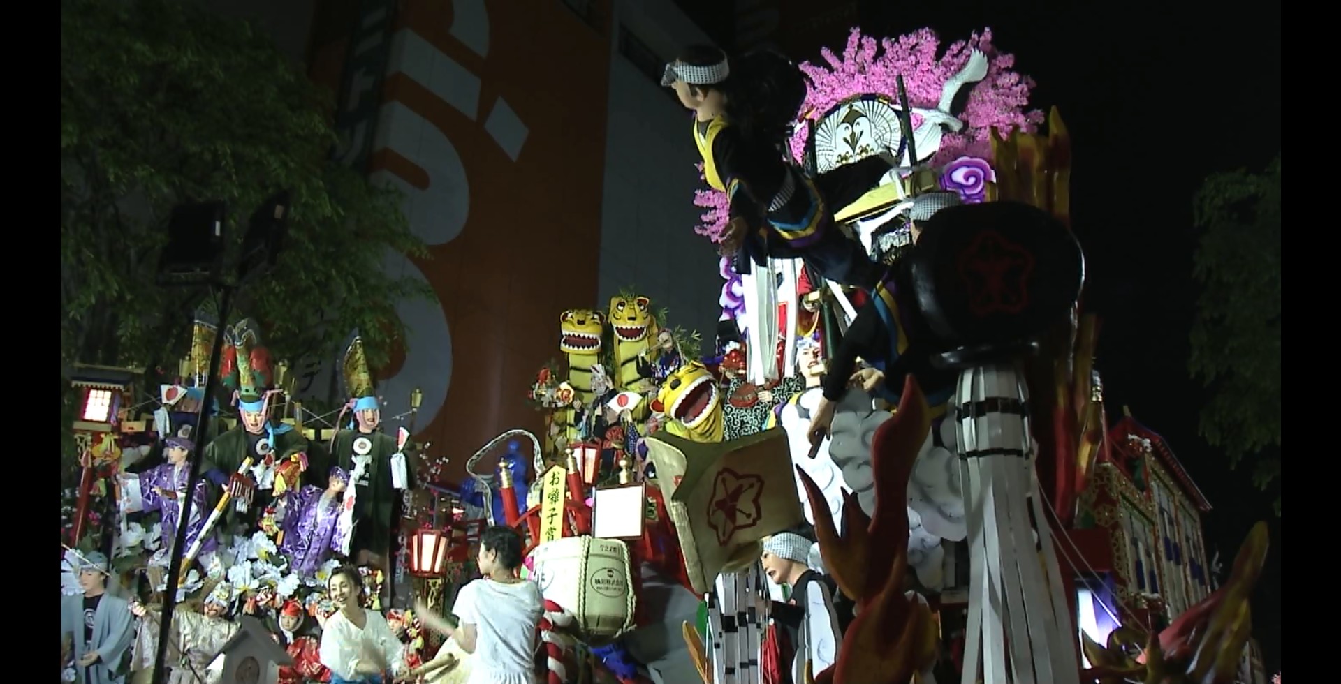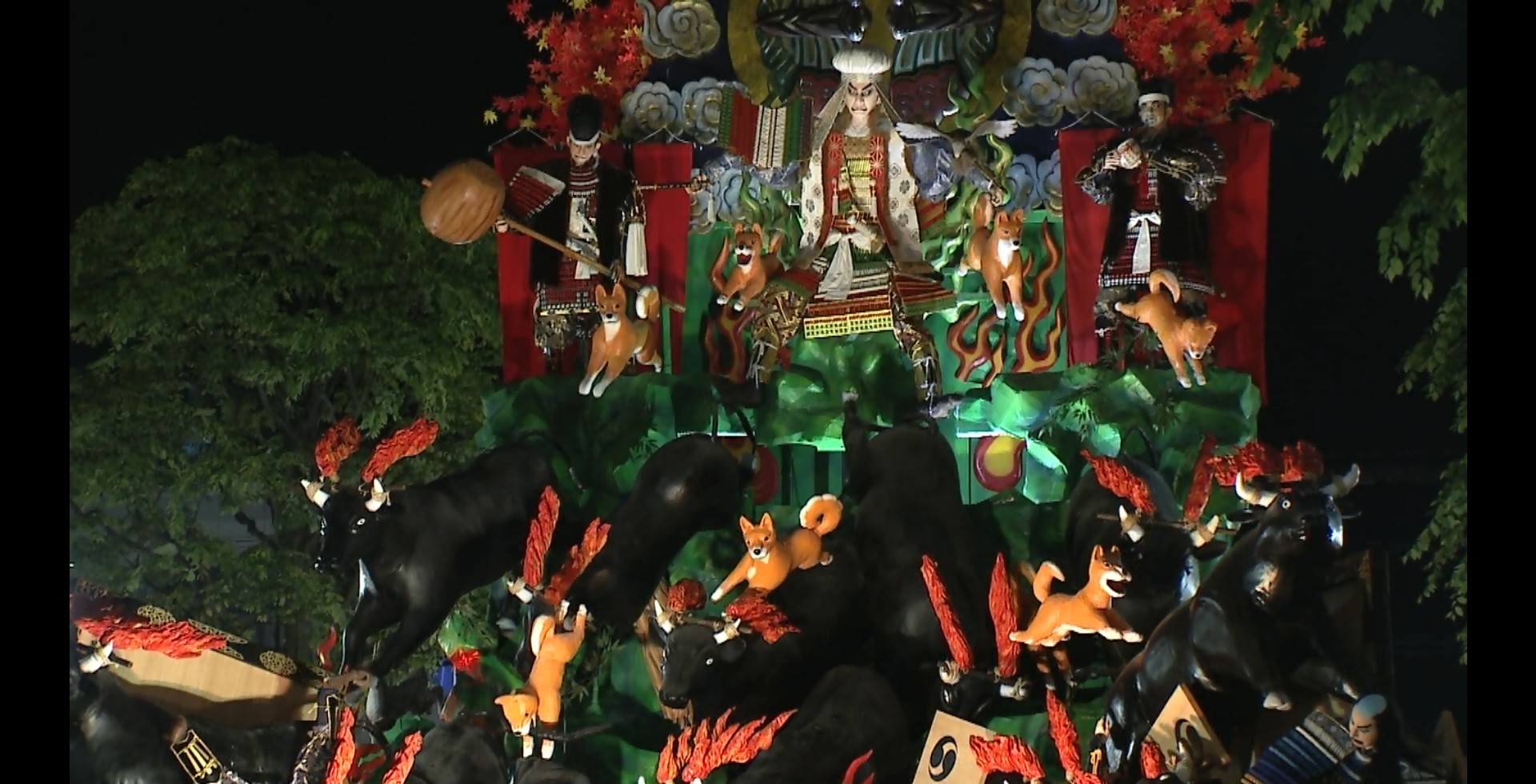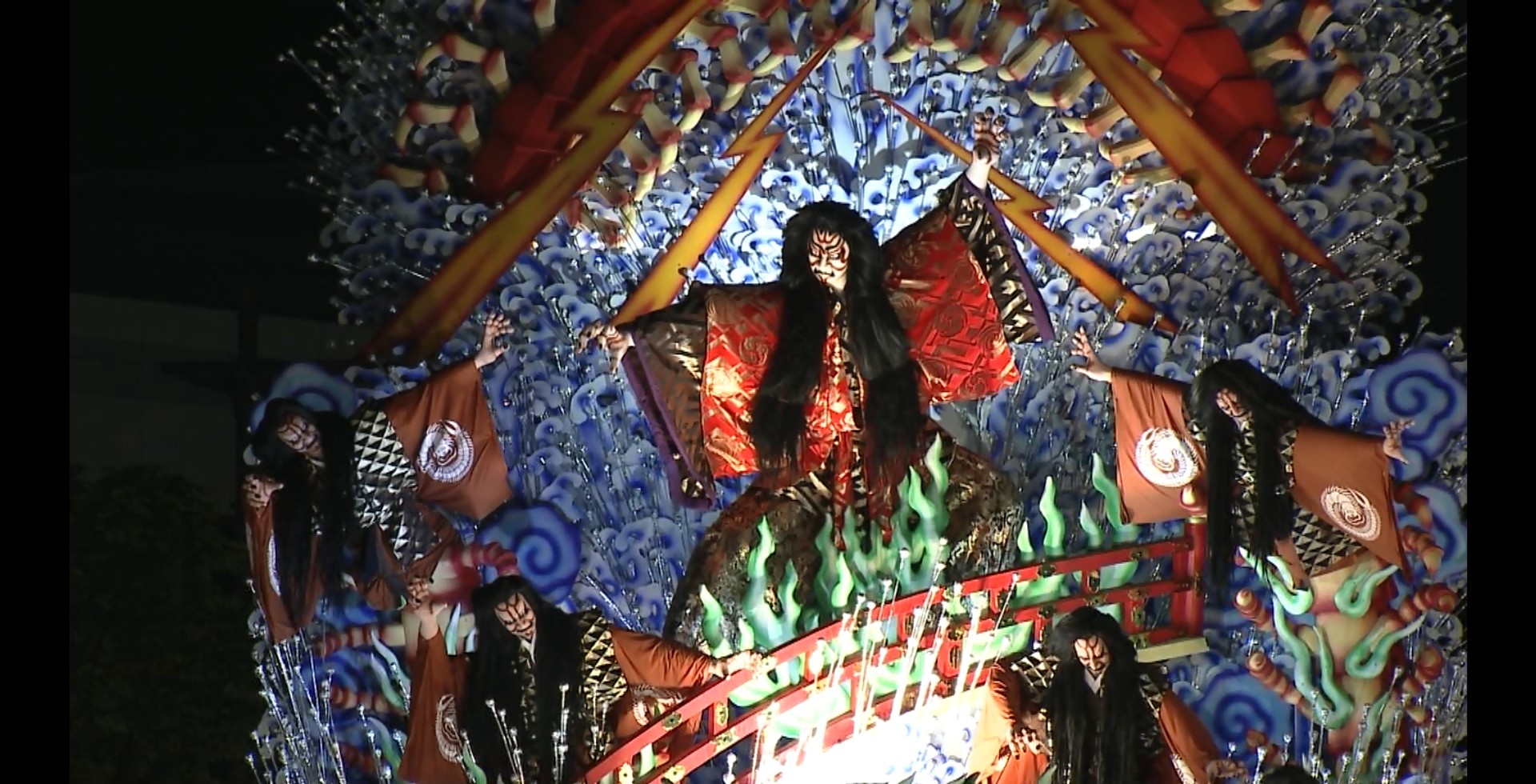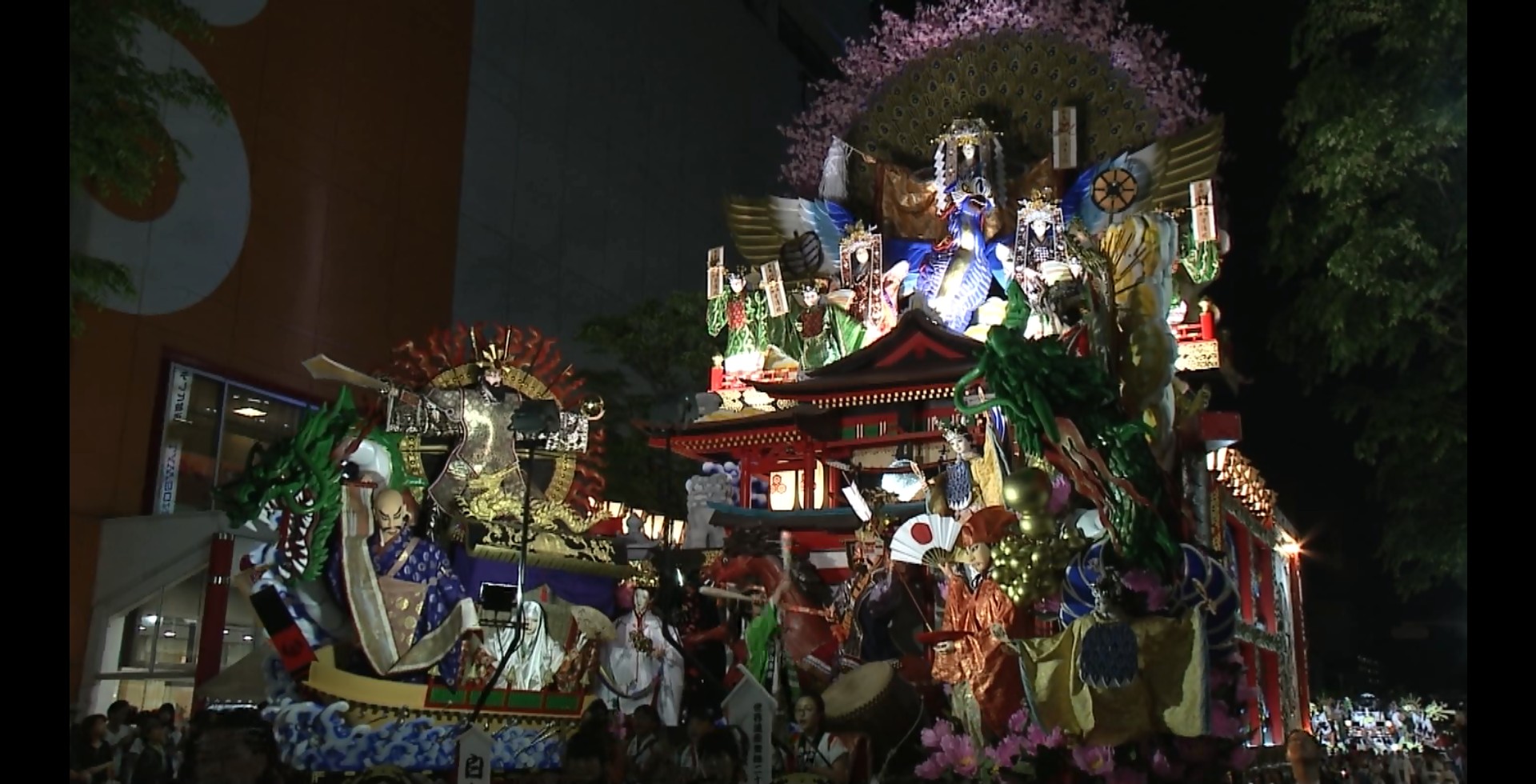 27輛の山車がライトに照らされ、妖艶な人形や動物や舞台の乗せたが山車が、お囃子ととも運行される。
