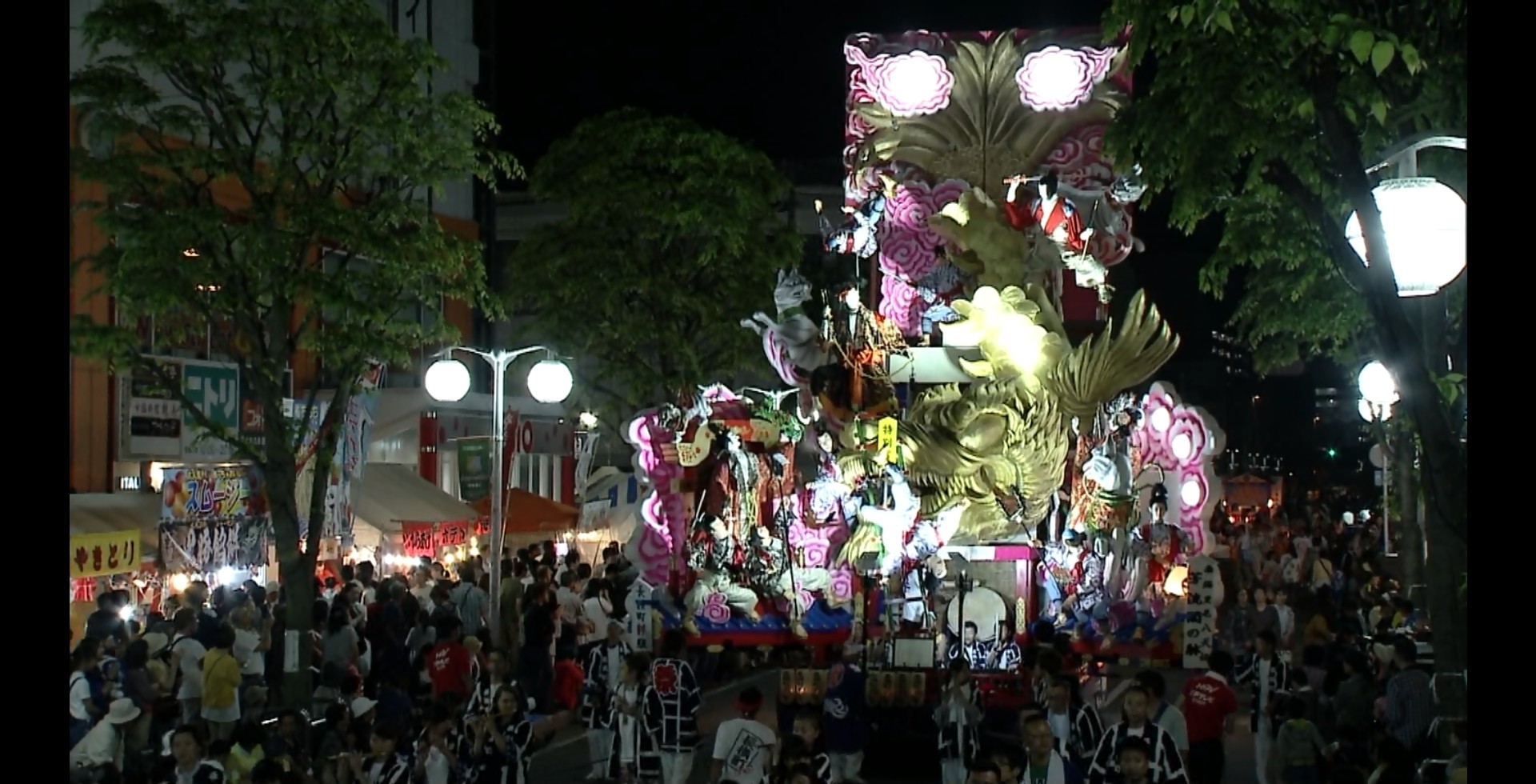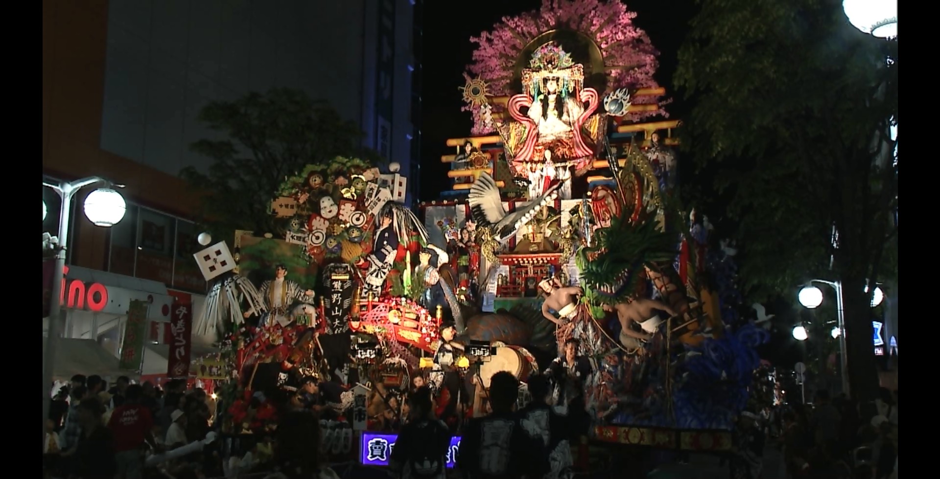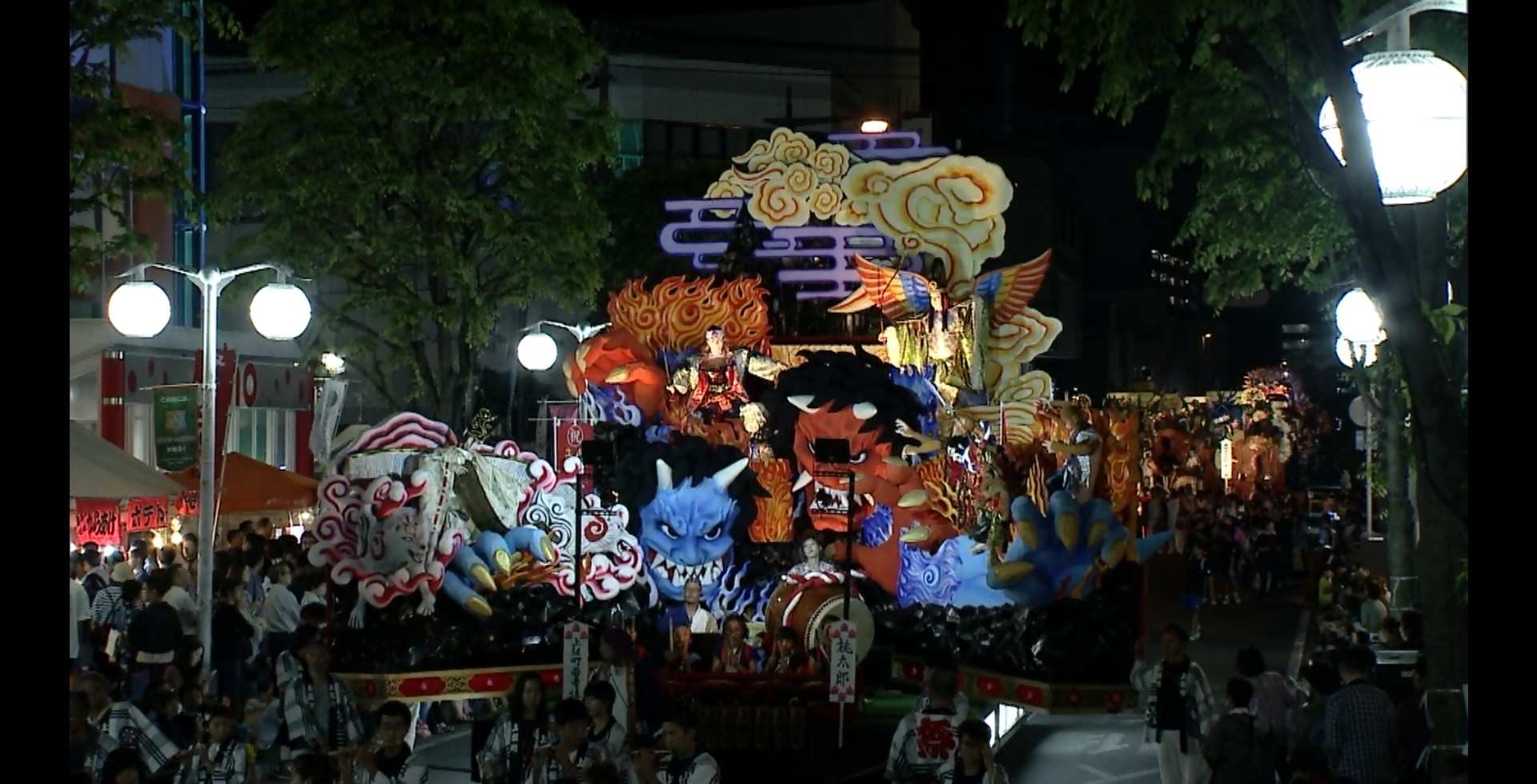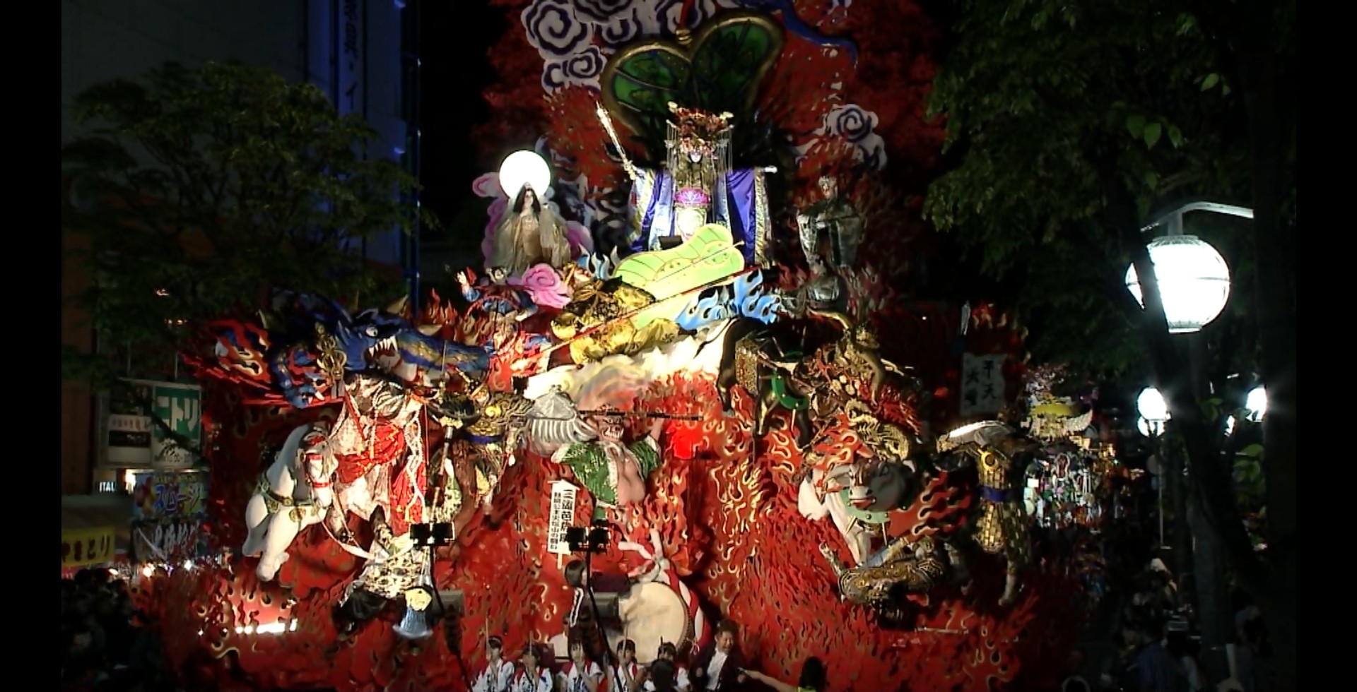 27輛の山車がライトに照らされ、妖艶な人形や動物や舞台の乗せたが山車が、お囃子ととも運行される。