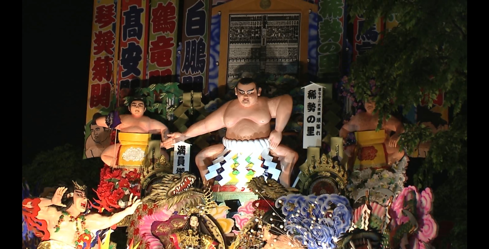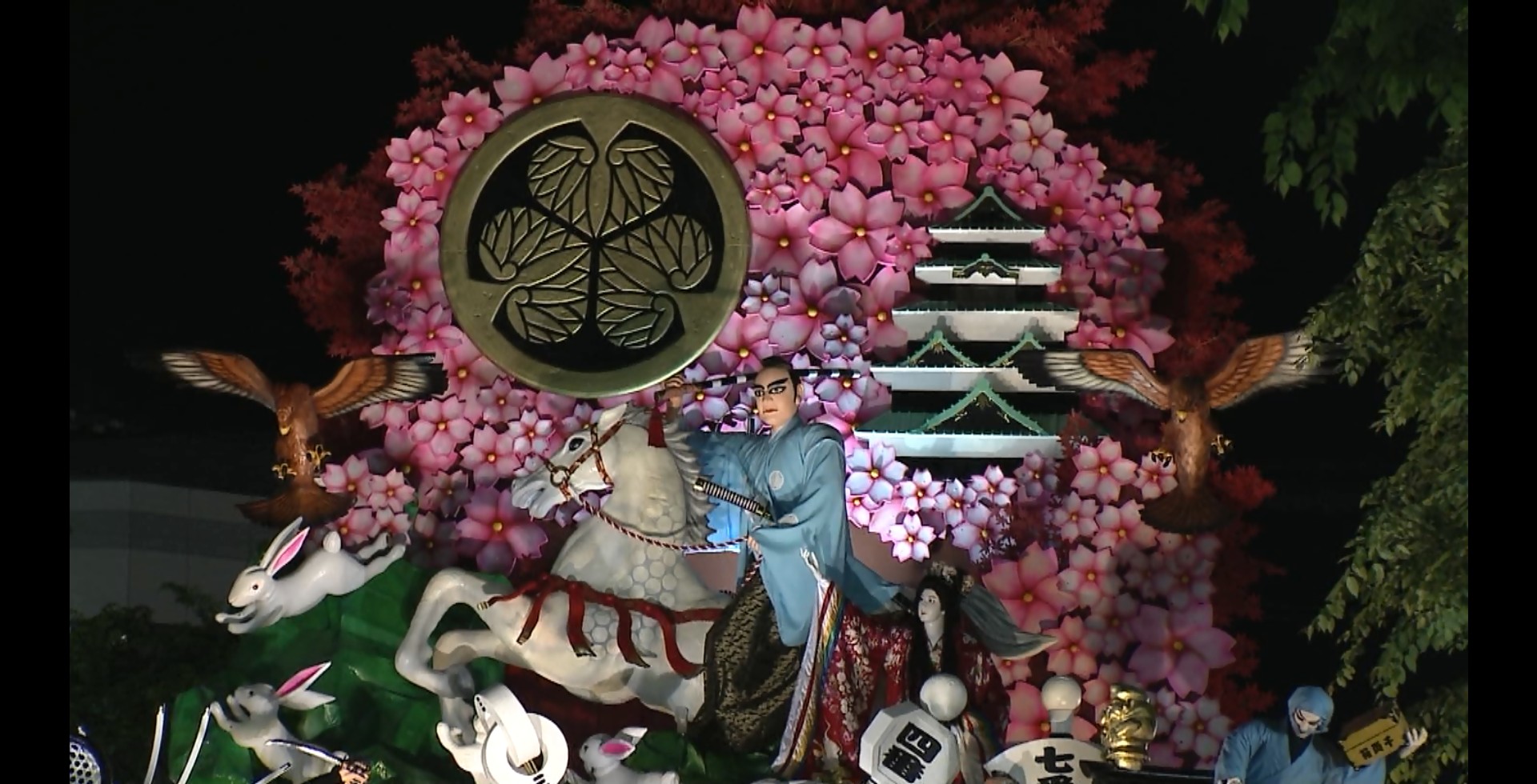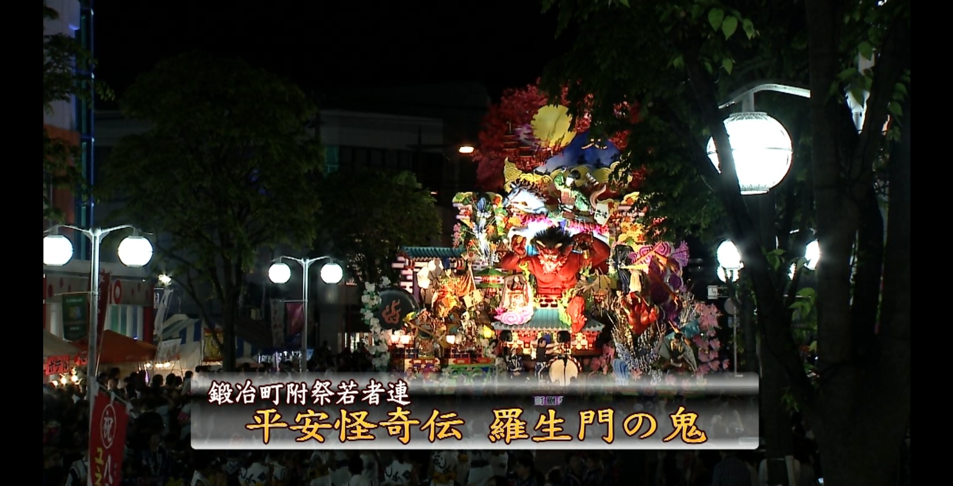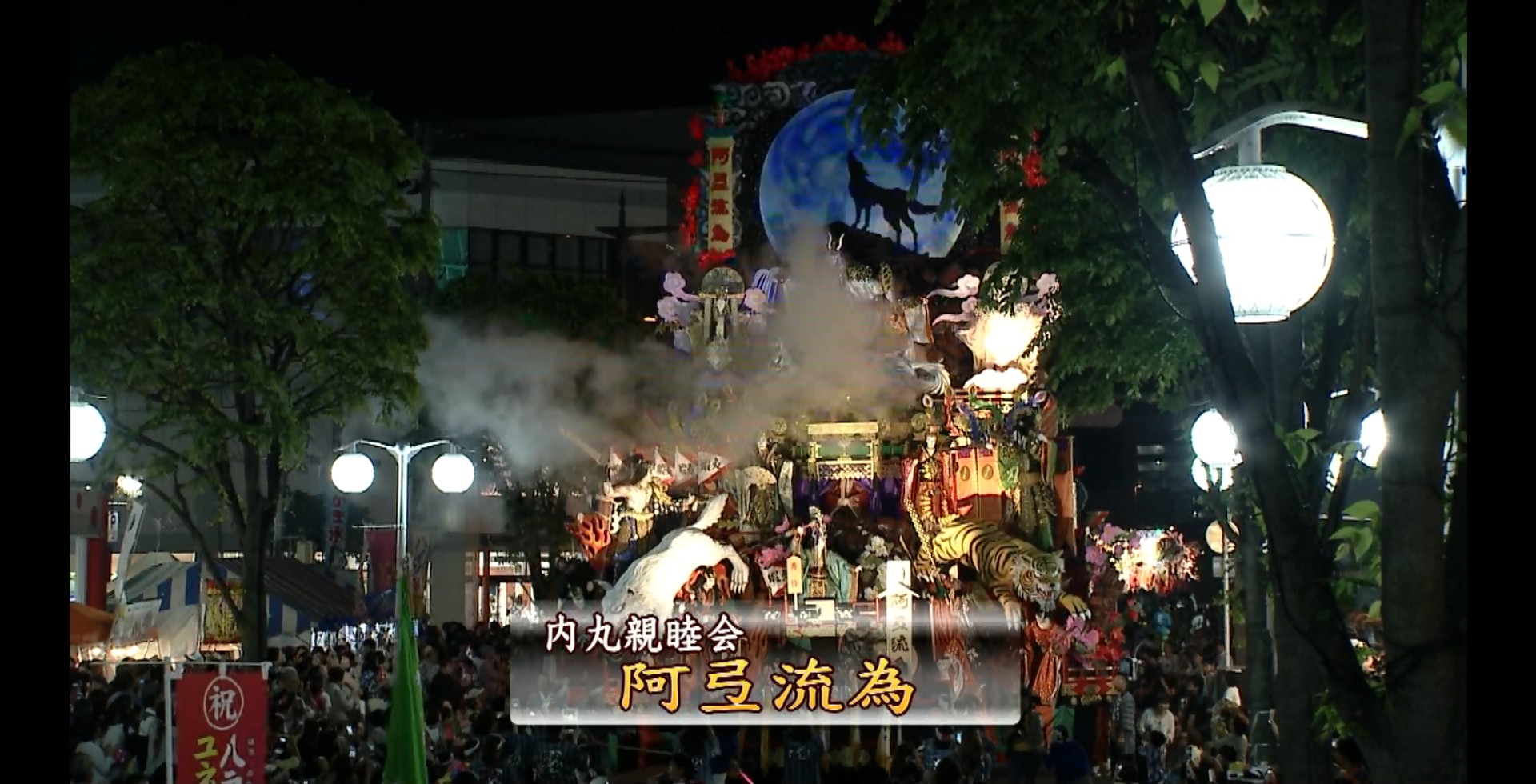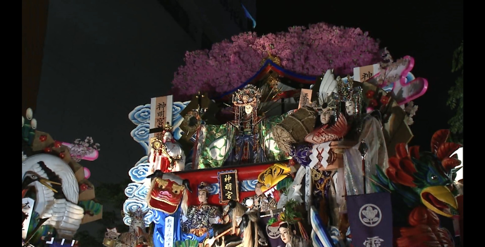 27輛の山車がライトに照らされ、妖艶な人形や動物や舞台の乗せたが山車が、お囃子ととも運行される。