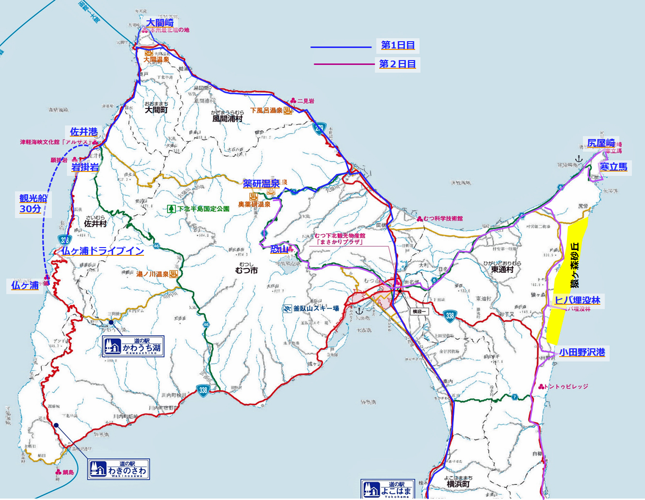 朝7:00 八戸出発、真奈のジムニーで、野辺地、むつ市、大間を経て、10時30分に下北半島先端 西側佐井に着く。佐井港10:40発、観光船サイライト号で仏ヶ浦に向かう。40分で仏ヶ浦に着く。
