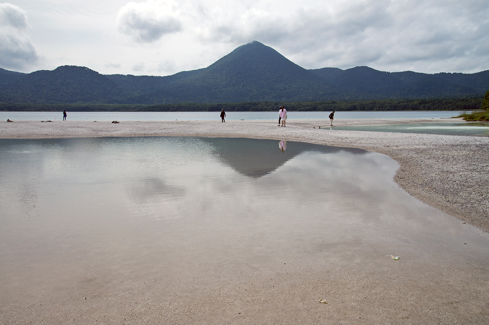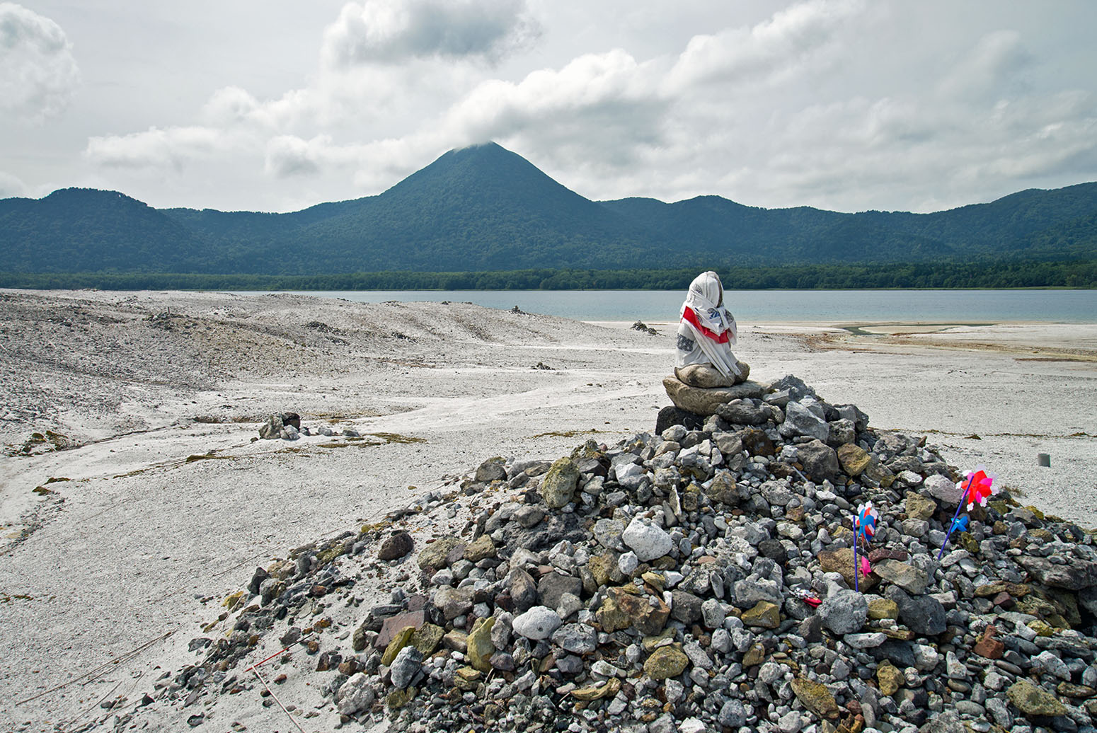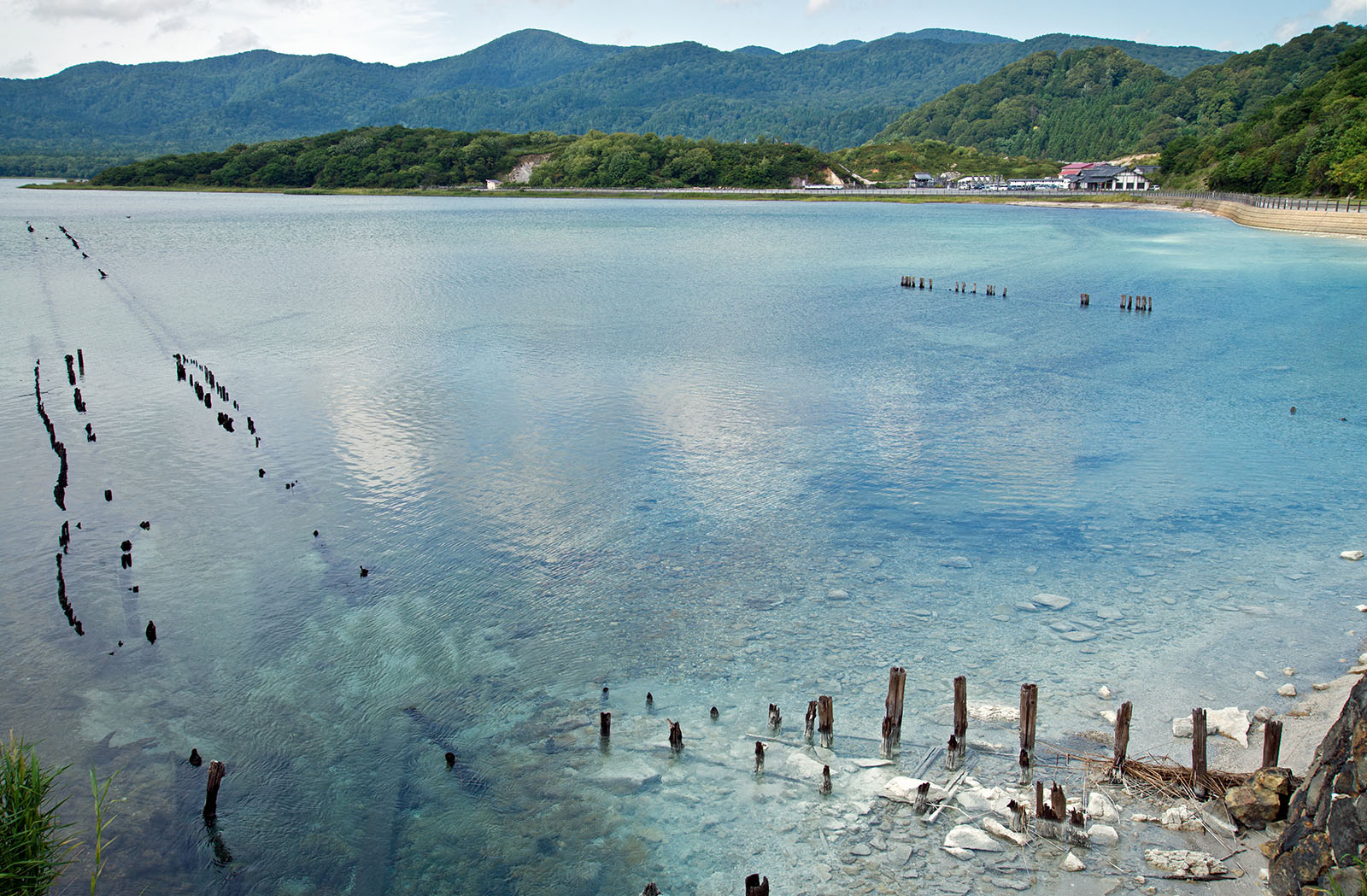 宇曽利湖は、宇曽利カルデラ内に生じたカルデラ湖です。水面の標高は214m、周囲は12.5kmにほぼ円形の湖で、面積は2.5平方km、最大水深は20mほどあります。湖水は強い酸性を示していて、ウグイなどがわずかに生息しているにすぎません。蓮華八葉の山影を映す湖面は、エメラルドグリーンの水を静かにたたえ、神秘的です。
