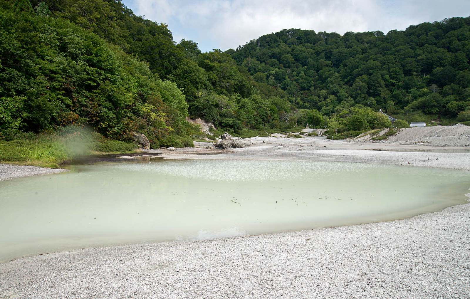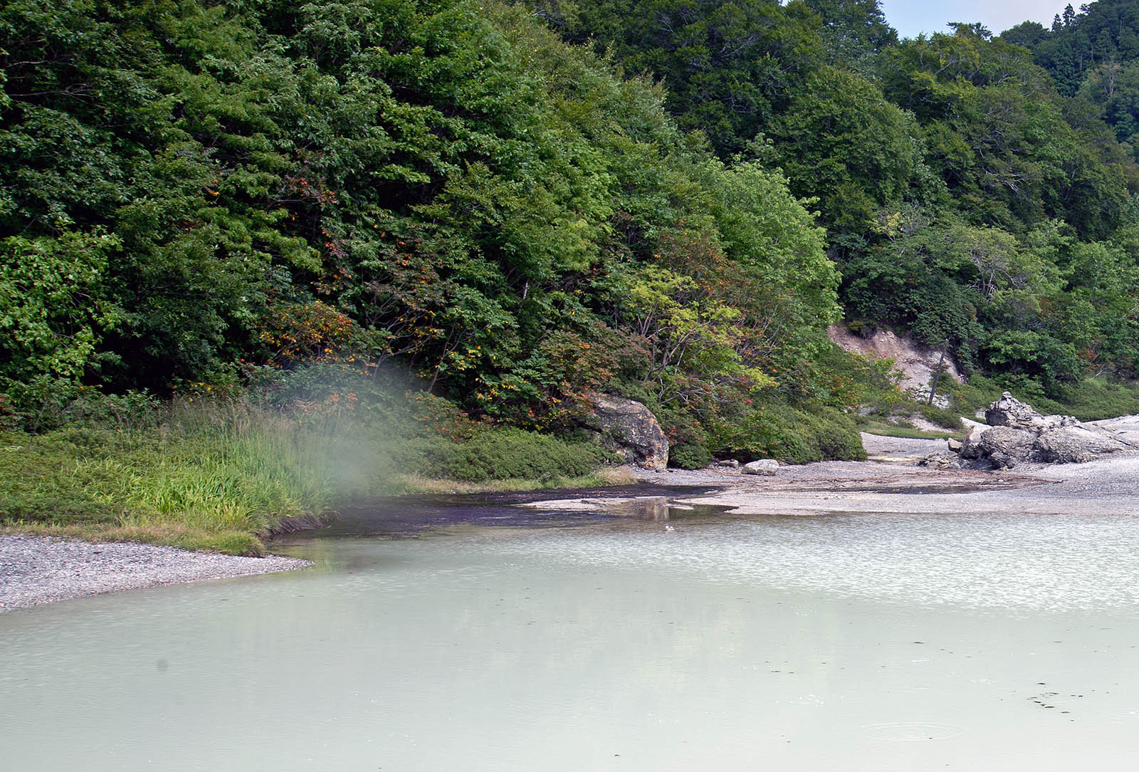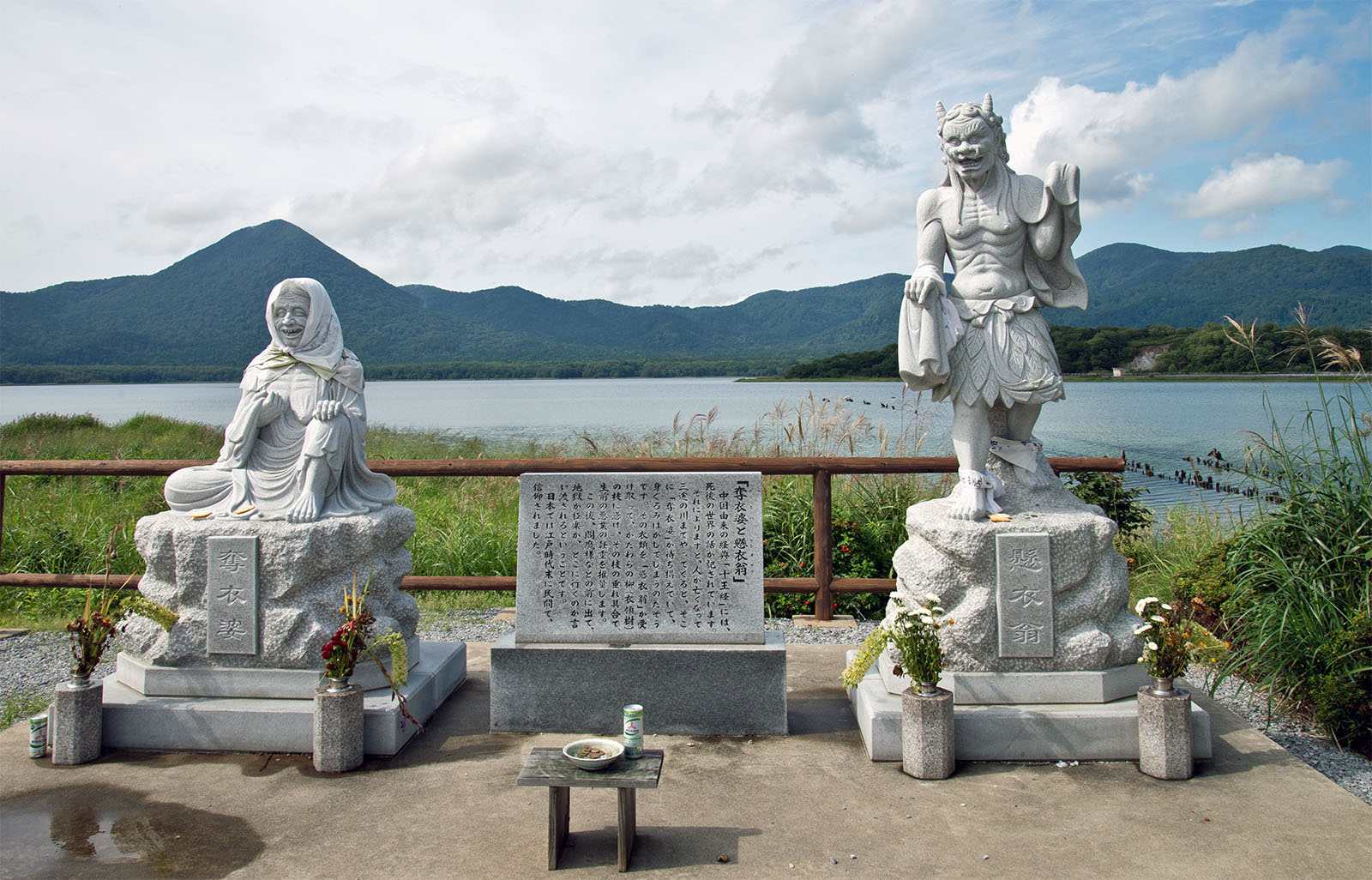 宇曽利湖は、宇曽利カルデラ内に生じたカルデラ湖です。水面の標高は214m、周囲は12.5kmにほぼ円形の湖で、面積は2.5平方km、最大水深は20mほどあります。湖水は強い酸性を示していて、ウグイなどがわずかに生息しているにすぎません。蓮華八葉の山影を映す湖面は、エメラルドグリーンの水を静かにたたえ、神秘的です。