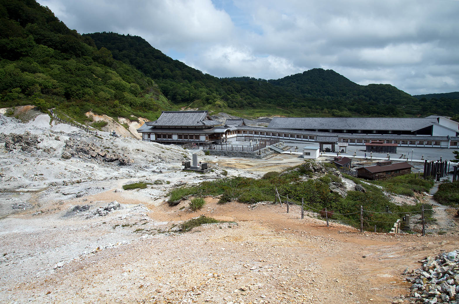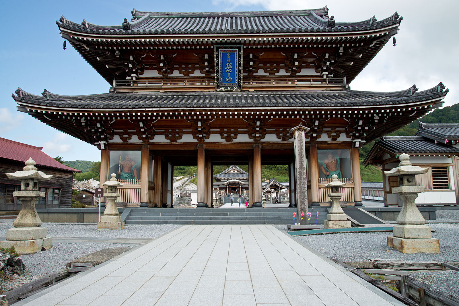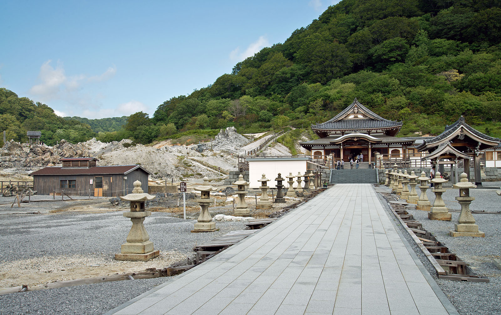 山門をくぐると常夜灯が並ぶ参道の正面に本尊地蔵尊が安置される地蔵堂があり、ここが死者の魂が集まるところと伝えられ、イタコの口寄せで知られる恐山菩提寺の境内である。左の小屋は恐山温泉の冷抜の湯である。 境内には四つの温泉が共同浴場として利用されている。いずれも白濁した硫化水素含酸性緑ばん泉で、冷抜の湯(ひえのゆ)は神経痛、リウマチなどに古滝の湯(こたきのゆ)は胃腸病などに、花染の湯(はなぞめのゆ)は吹き出物、切傷などに薬師の湯(やくしのゆ)は眼病などに、それぞれ効能があるといわれている。