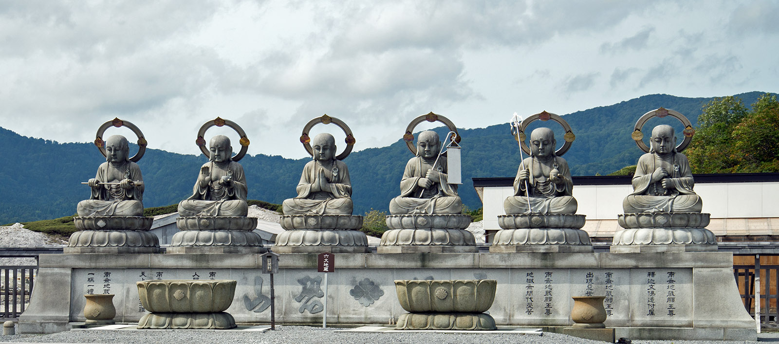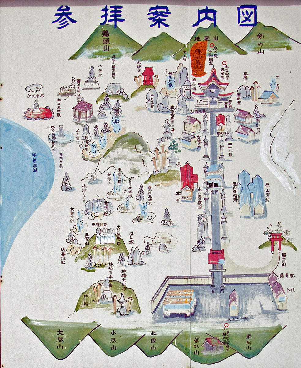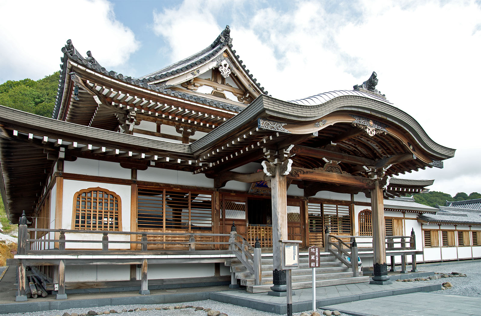 山門をくぐると常夜灯が並ぶ参道の正面に本尊地蔵尊が安置される地蔵堂があり、ここが死者の魂が集まるところと伝えられ、イタコの口寄せで知られる恐山菩提寺の境内である。左の小屋は恐山温泉の冷抜の湯である。 境内には四つの温泉が共同浴場として利用されている。いずれも白濁した硫化水素含酸性緑ばん泉で、冷抜の湯(ひえのゆ)は神経痛、リウマチなどに古滝の湯(こたきのゆ)は胃腸病などに、花染の湯(はなぞめのゆ)は吹き出物、切傷などに薬師の湯(やくしのゆ)は眼病などに、それぞれ効能があるといわれている。