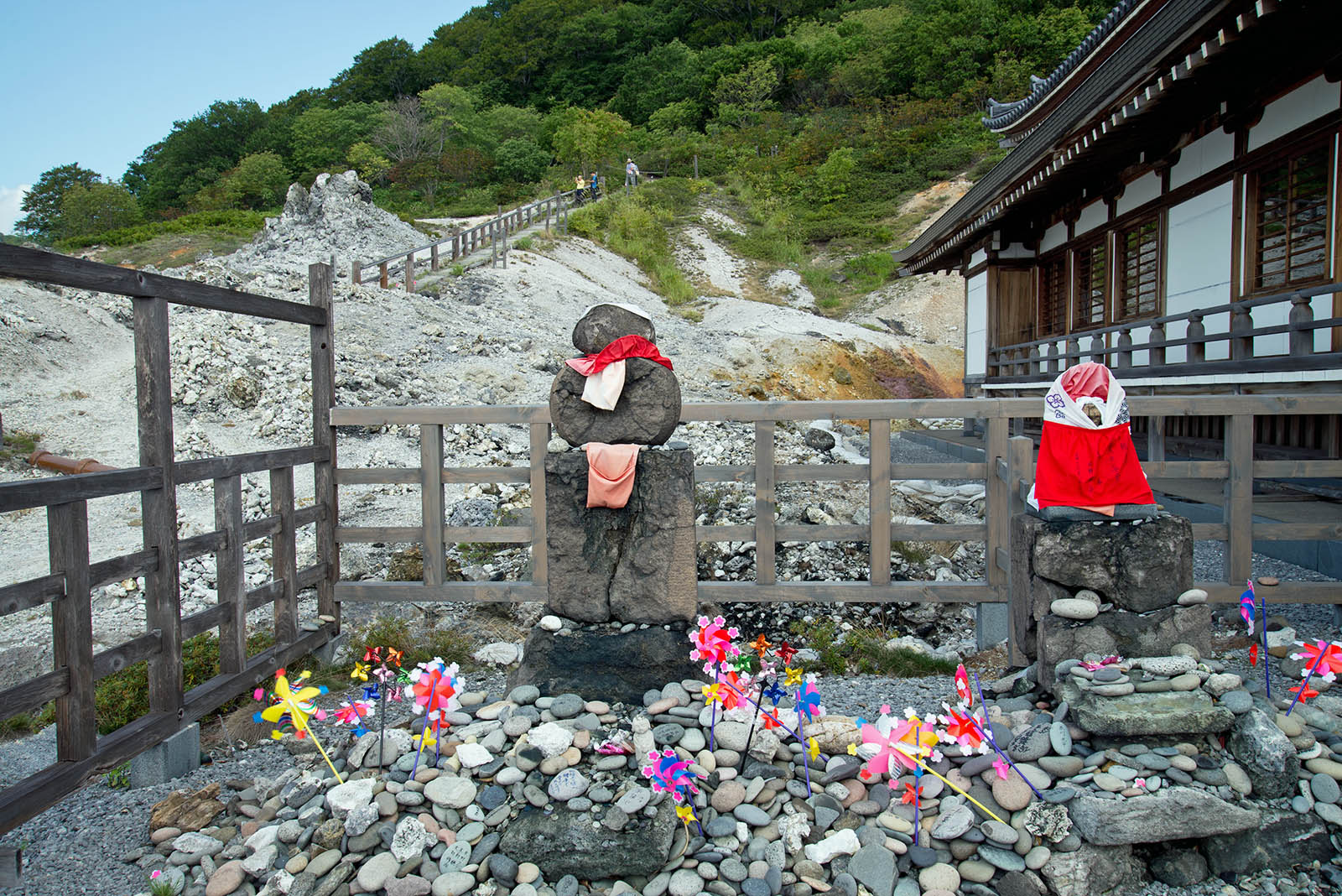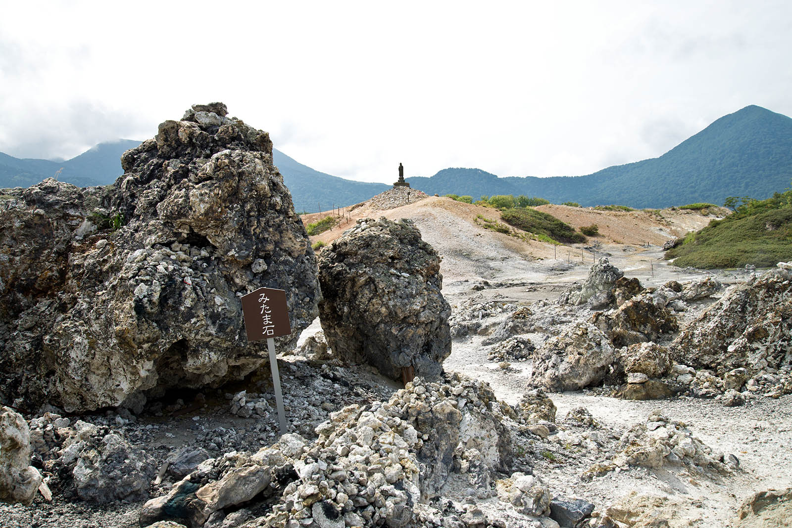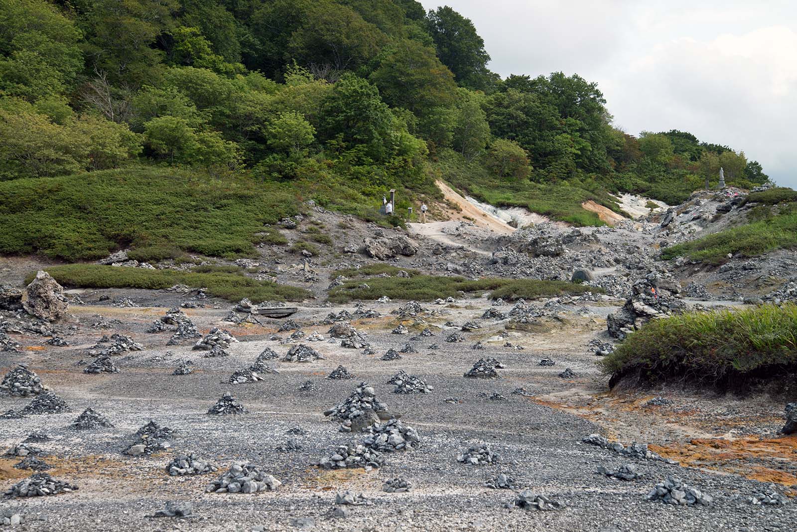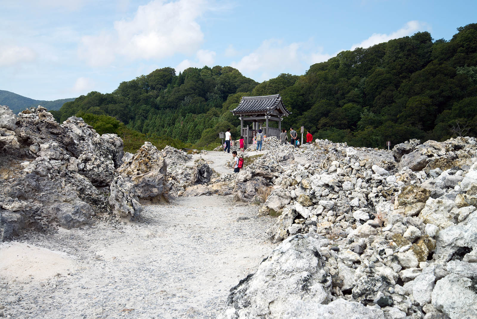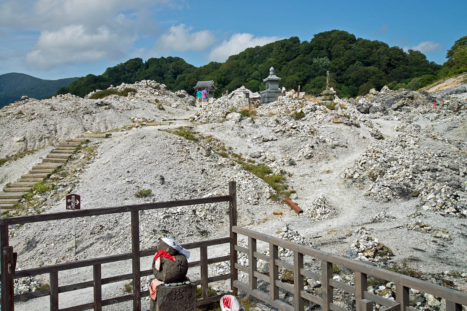 境内の宇曽利山湖寄りは、賽の河原と呼ばれ、いたるところから噴気や温泉が噴出し、鼻を突くような硫気もただよって、ほとんど植物も育たない荒涼とした風景が展開しています。