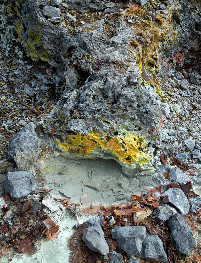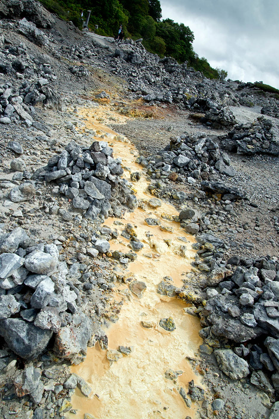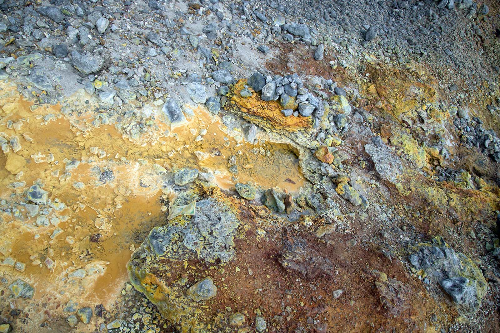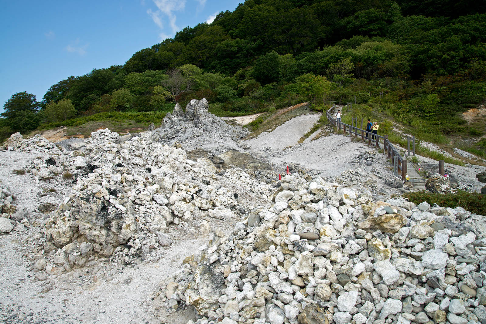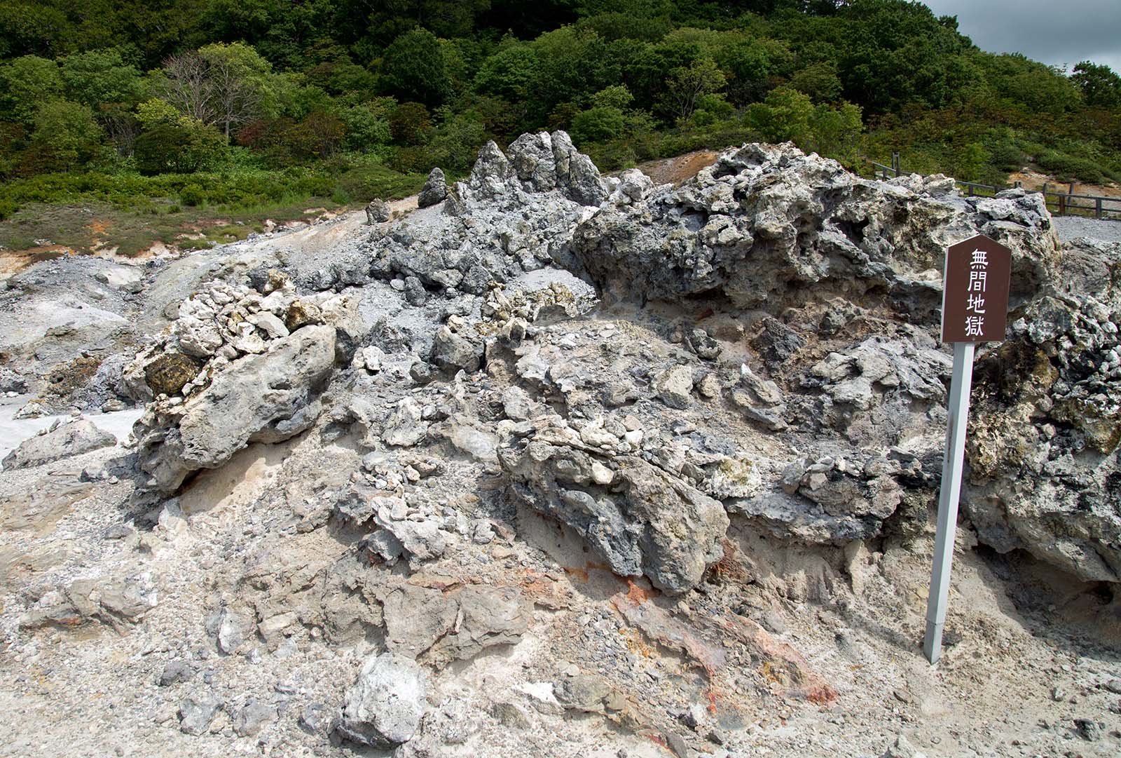 境内の宇曽利山湖寄りは、賽の河原と呼ばれ、いたるところから噴気や温泉が噴出し、鼻を突くような硫気もただよって、ほとんど植物も育たない荒涼とした風景が展開しています。