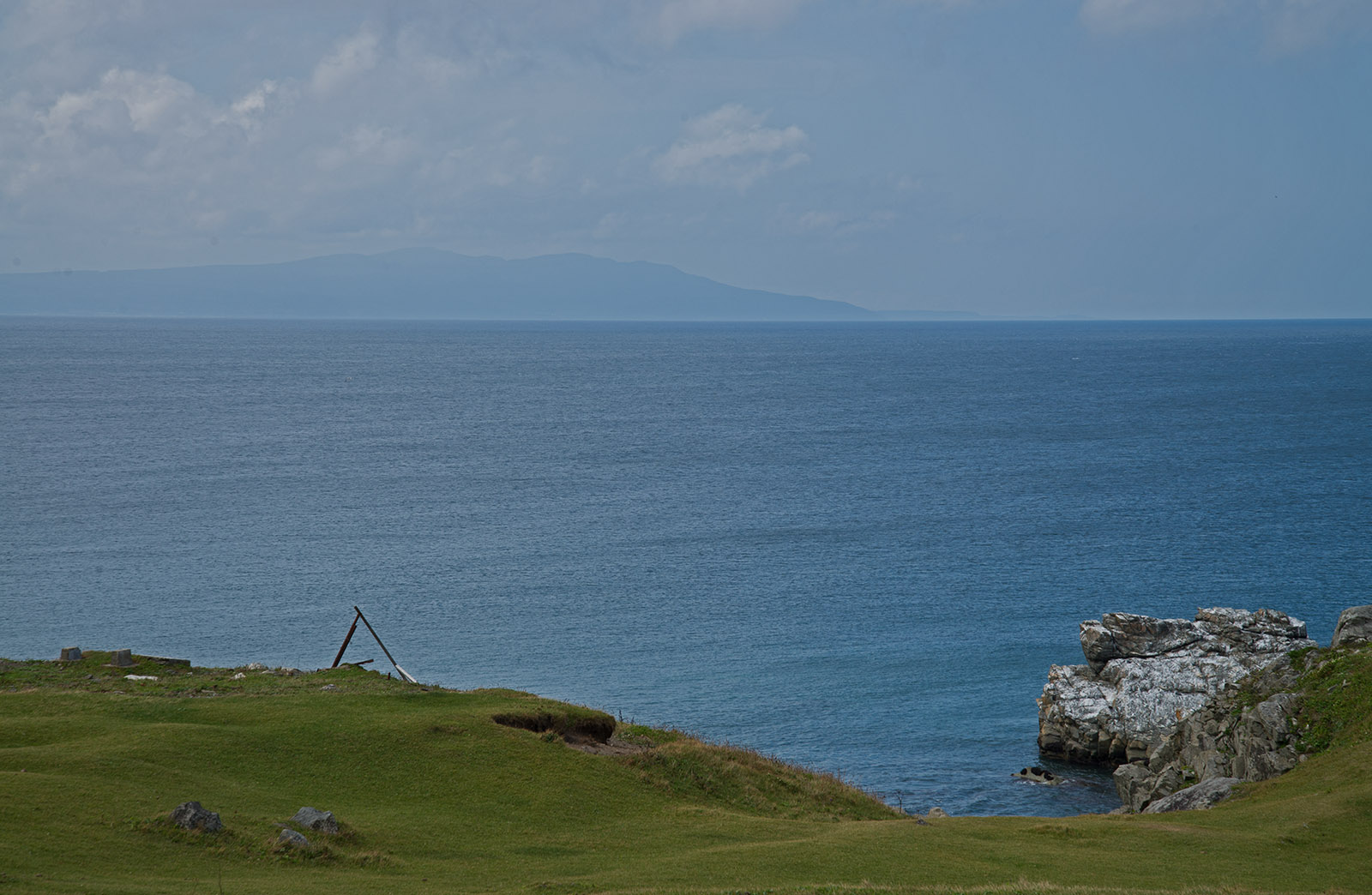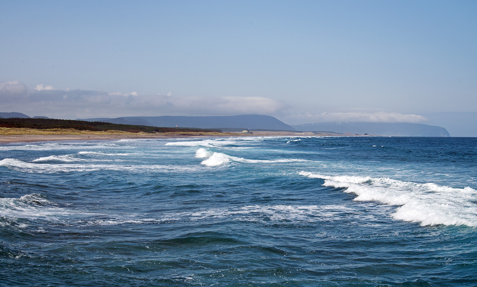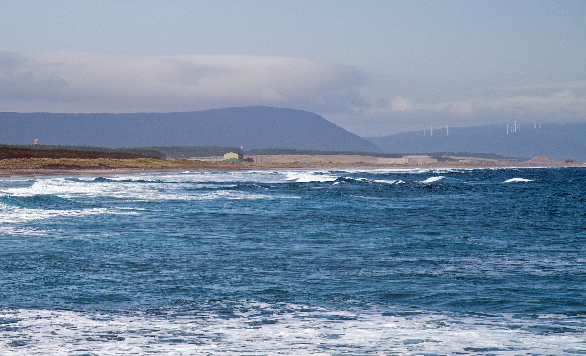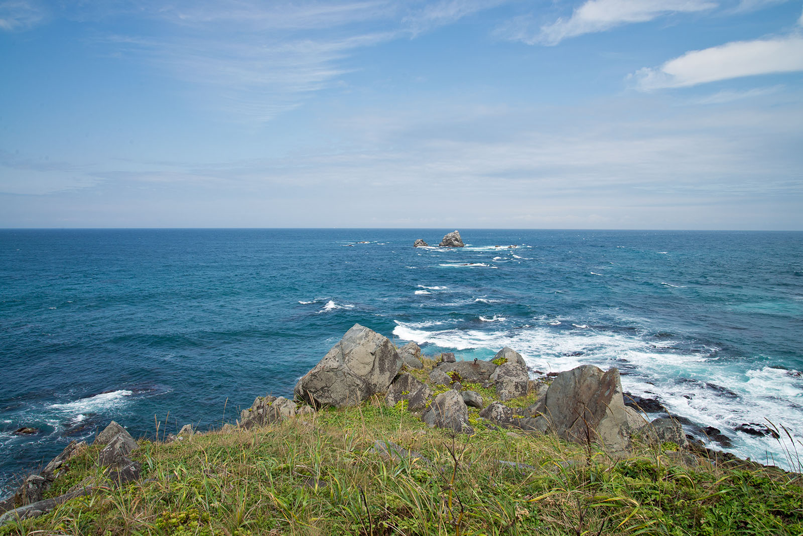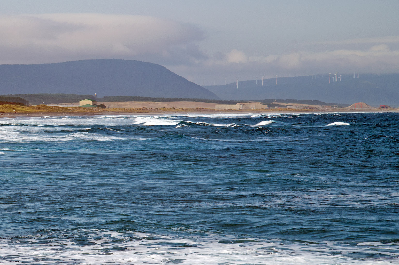 探しあてた撮影スポットは小田野沢漁港の防波堤)全長17kmが見えており、遠くに防衛省技術研究本部の下北試験場(弾道試験場)の建物も見える。一番先は尻屋岬の近くの山で風力発電機が沢山設置されている。