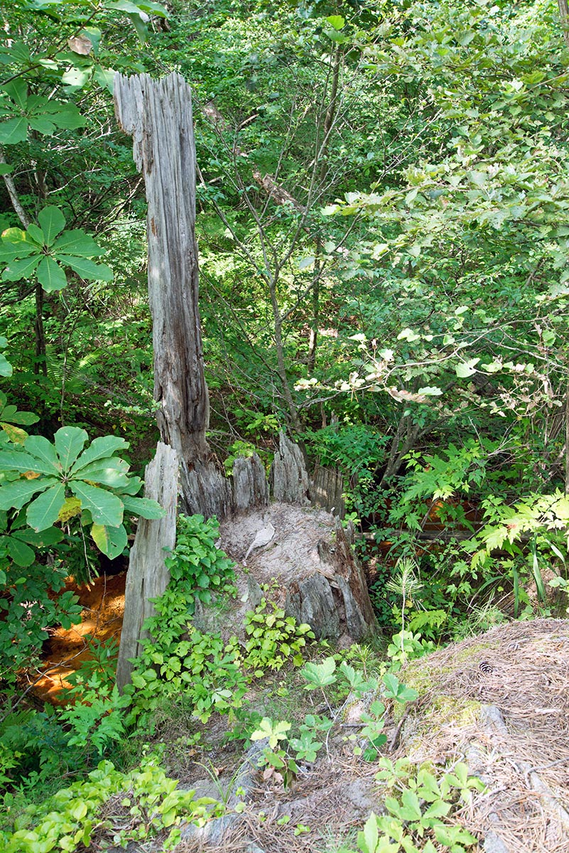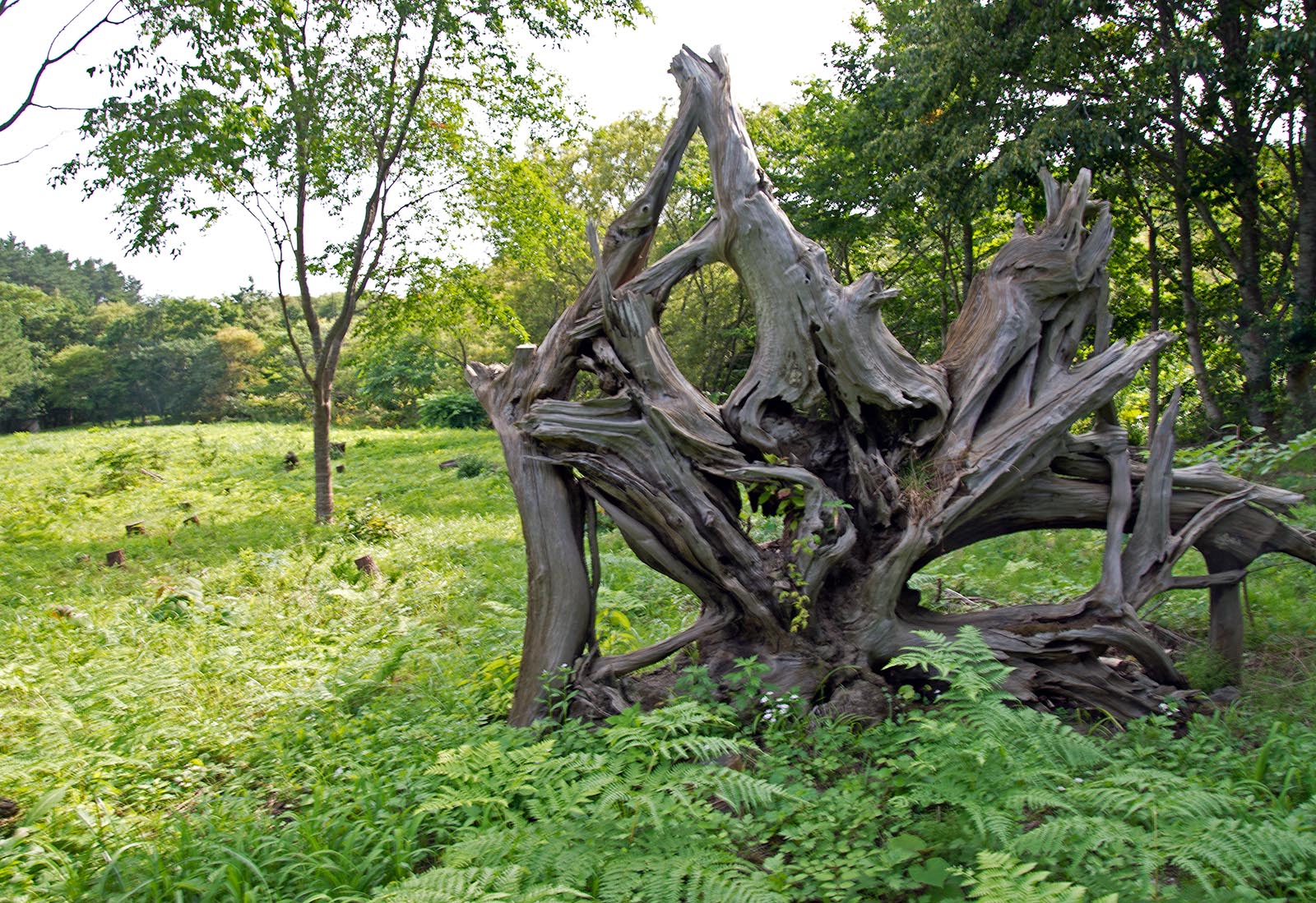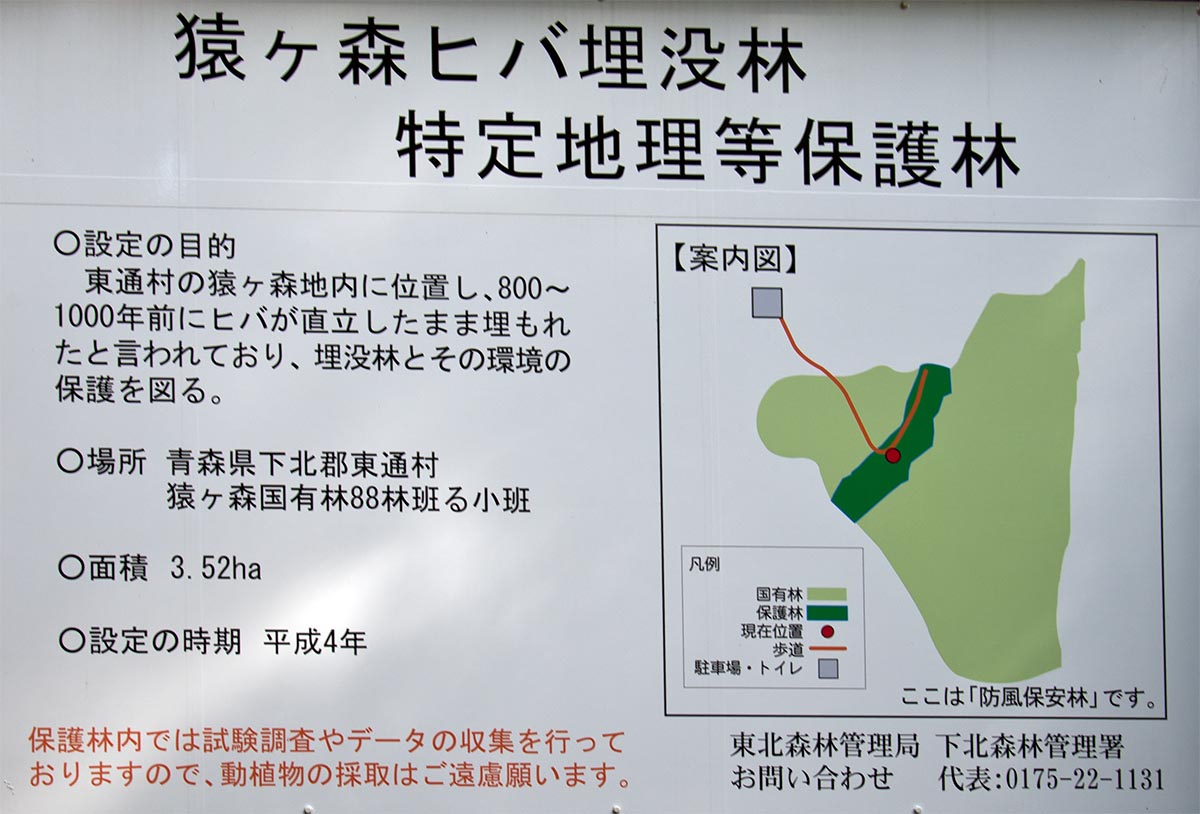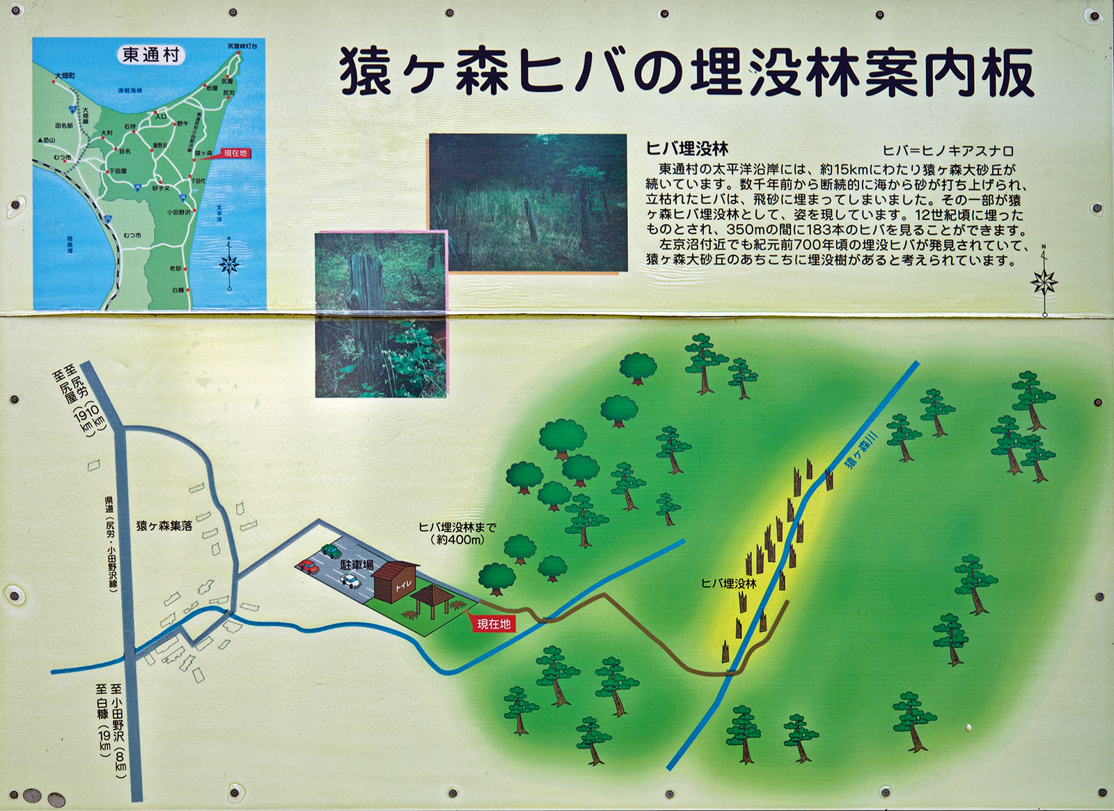 県道から標識に従って、海側に入り、廃校になった猿ヶ森小中学校の建物の左の道に入ると駐車場がある。このから砂地を400m歩くと小川沿いに立ち枯れたヒバが点在している。900年ほど前に砂丘の移動で枯れたとのこと。シーズンの日曜というのに、他の人には全く合わないという独占状態であり、まさに秘境と言える場所であった。
