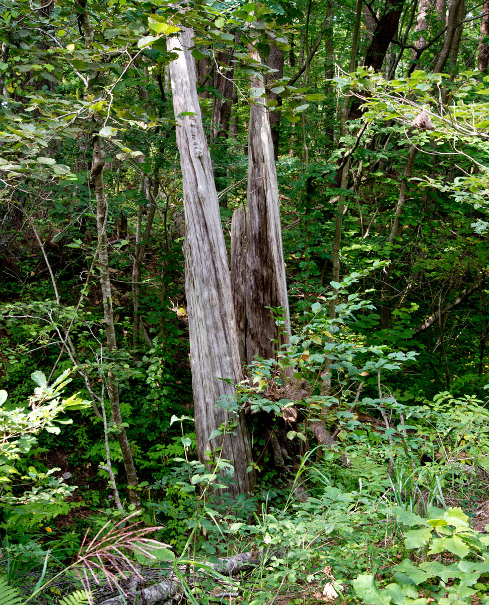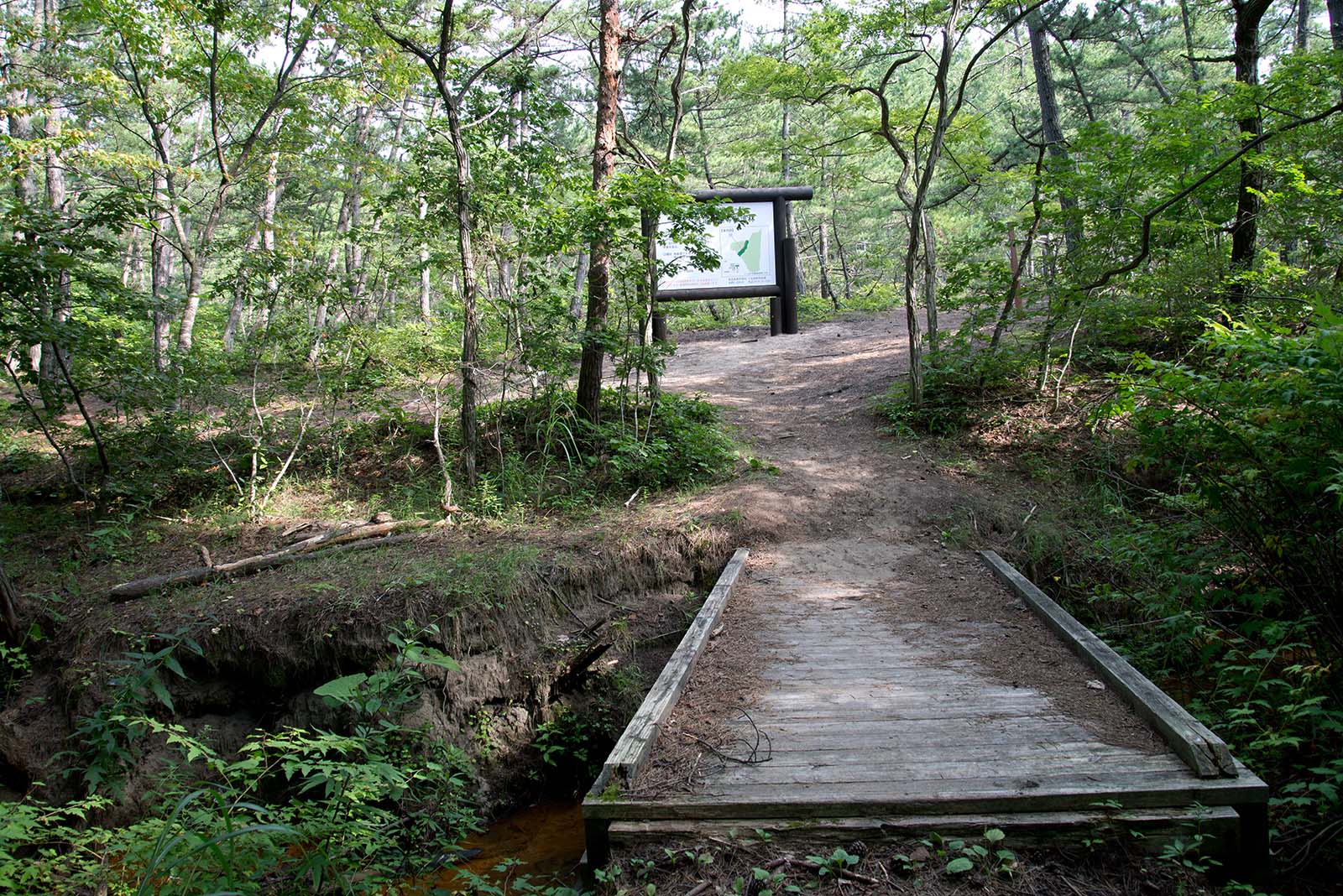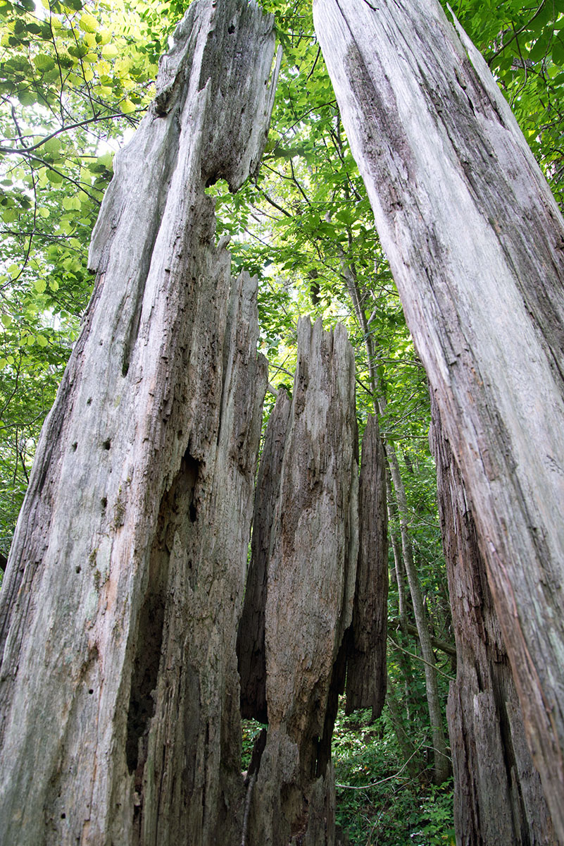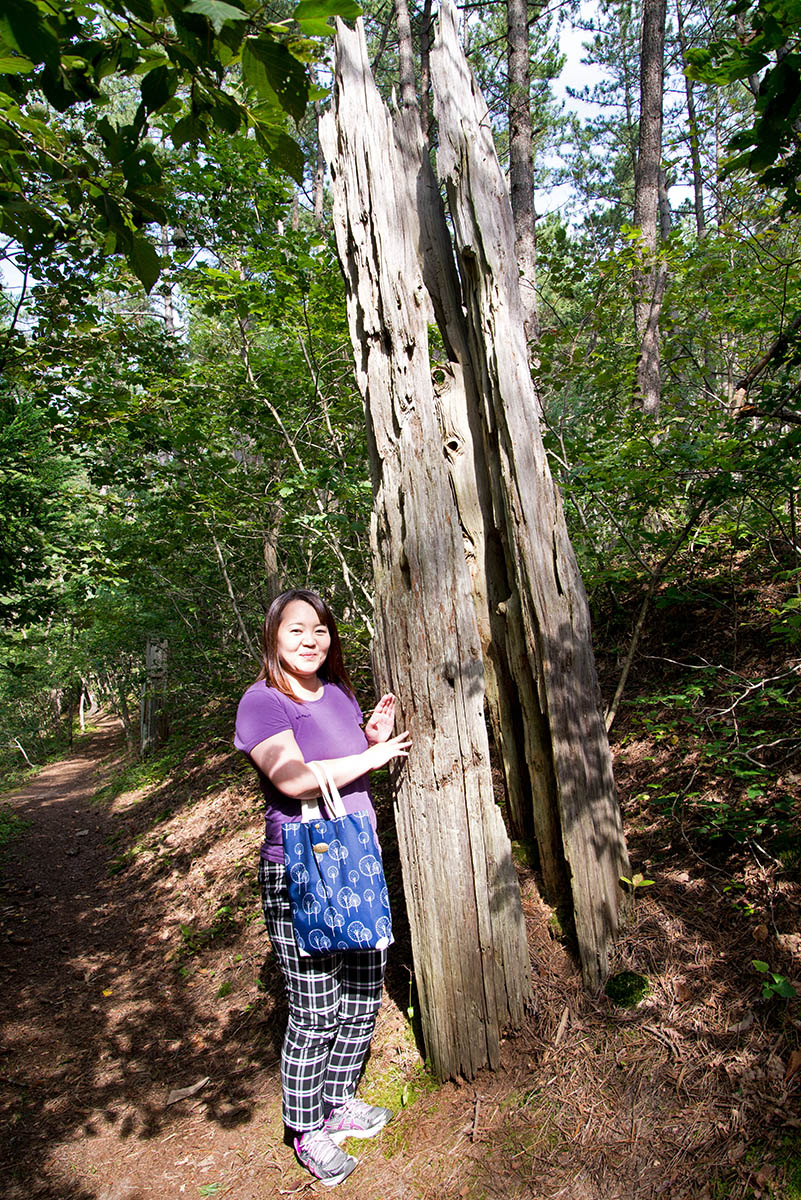 県道から標識に従って、海側に入り、廃校になった猿ヶ森小中学校の建物の左の道に入ると駐車場がある。このから砂地を400m歩くと小川沿いに立ち枯れたヒバが点在している。900年ほど前に砂丘の移動で枯れたとのこと。シーズンの日曜というのに、他の人には全く合わないという独占状態であり、まさに秘境と言える場所であった。