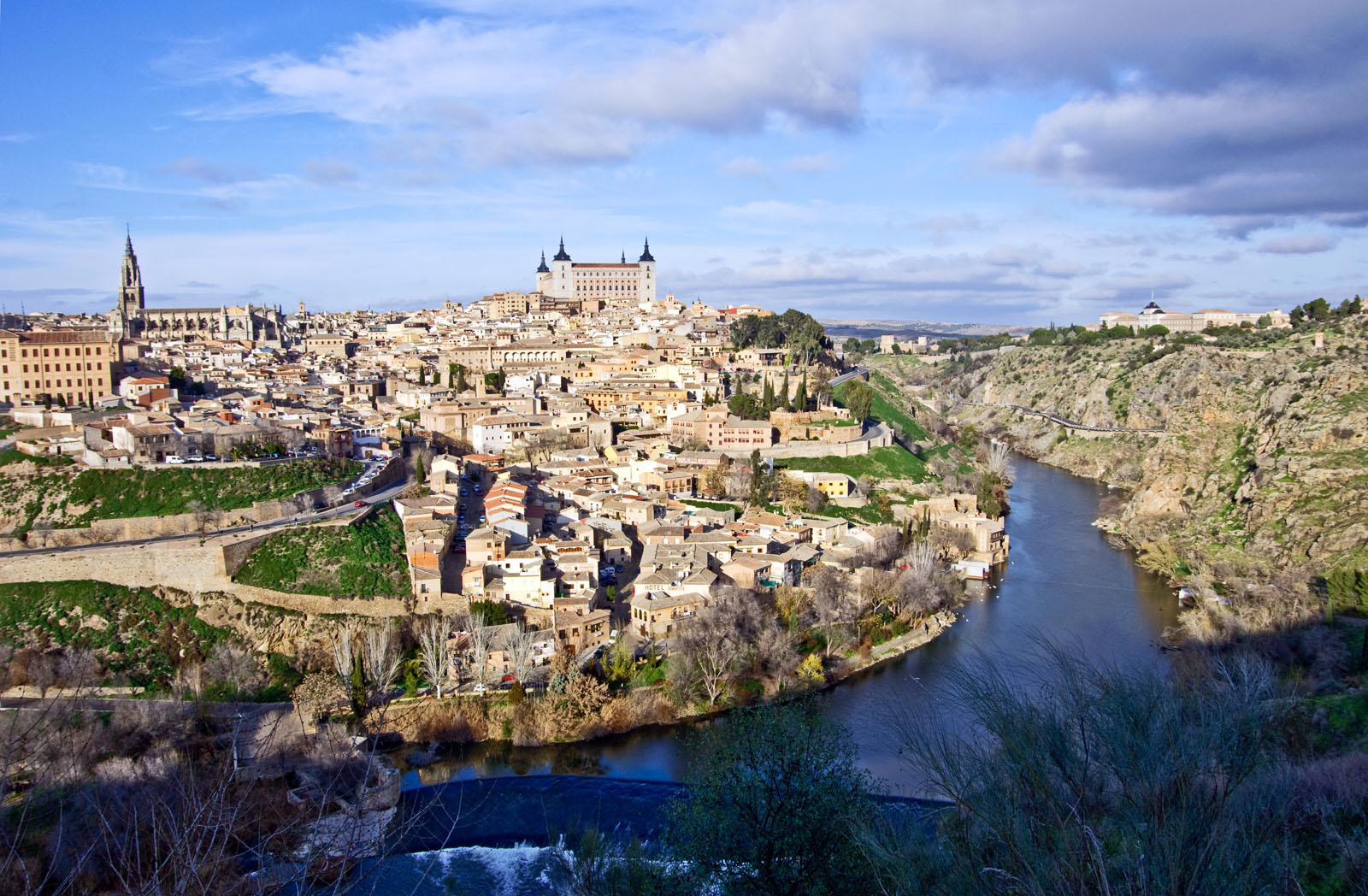 トレドはスペイン中部のカスティーリャ ラ マンチャ州に広がる平原地帯の丘の上にある古代の城塞都市です。この城塞都市は、中世時代に建てられたイスラム教、ユダヤ教、キリスト教の歴史的建造物があります。中心に荘厳な大聖堂があります。ムーア様式を用いたビサグラ門とムデハル様式を用いた太陽の門が旧市街への入り口。旧市街にはたくさんの人で賑わうソコドベール広場があります。トレド旧市街全域が世界遺産登録されている。また、マニエリスムの画家エル・グレコが暮らしていた街でもあります。
