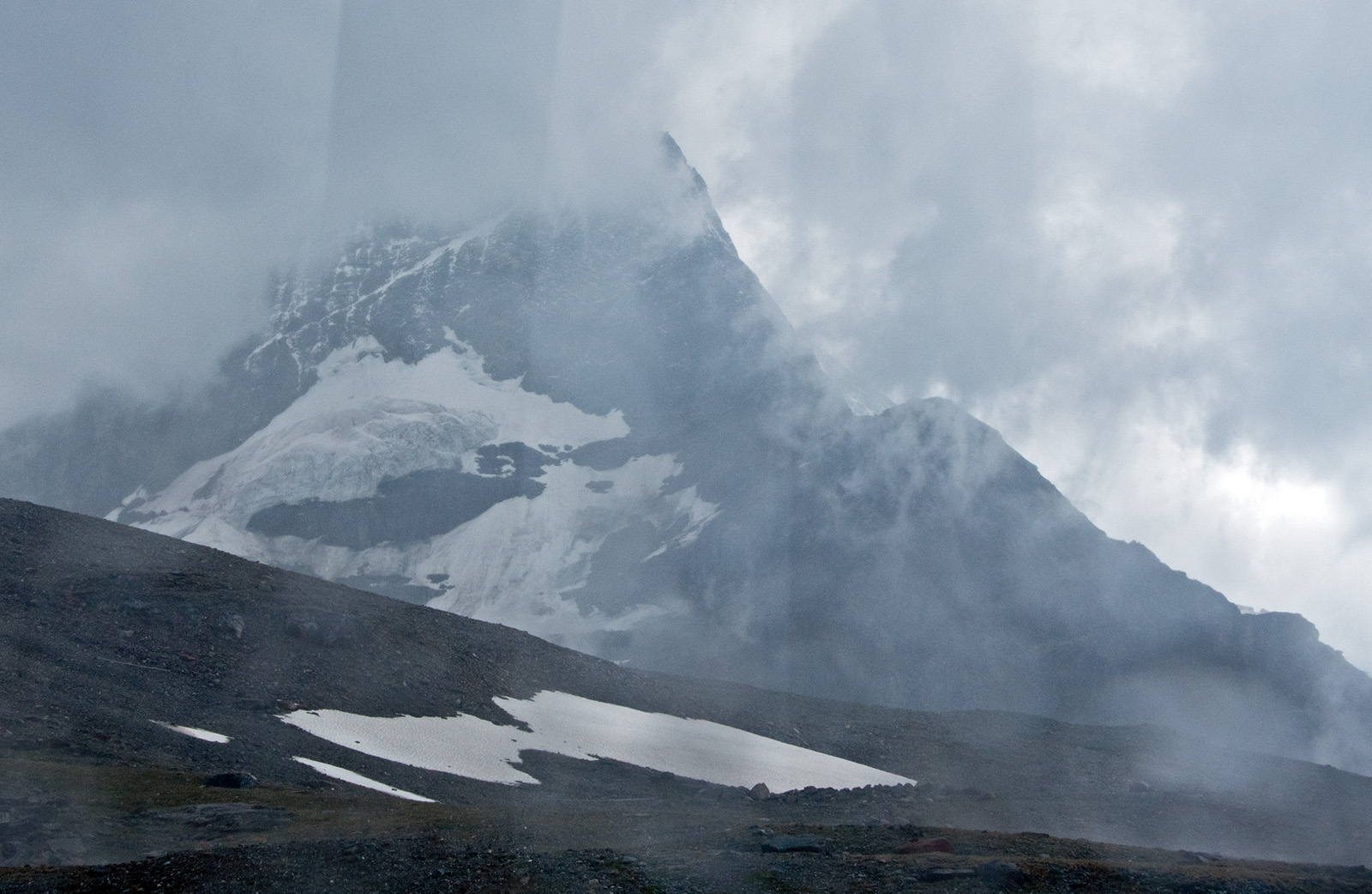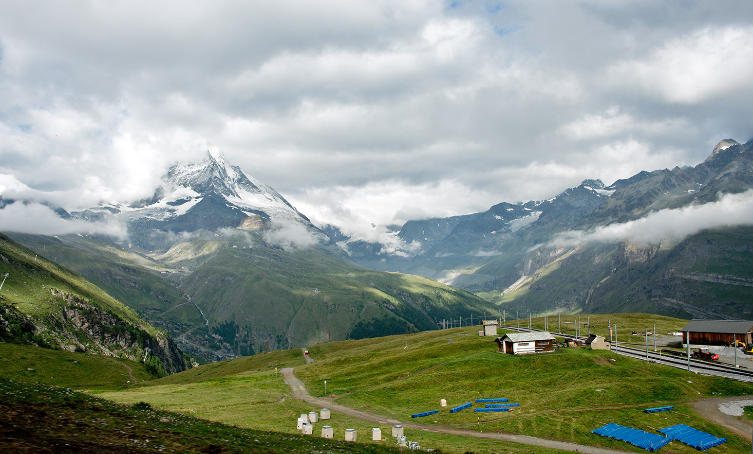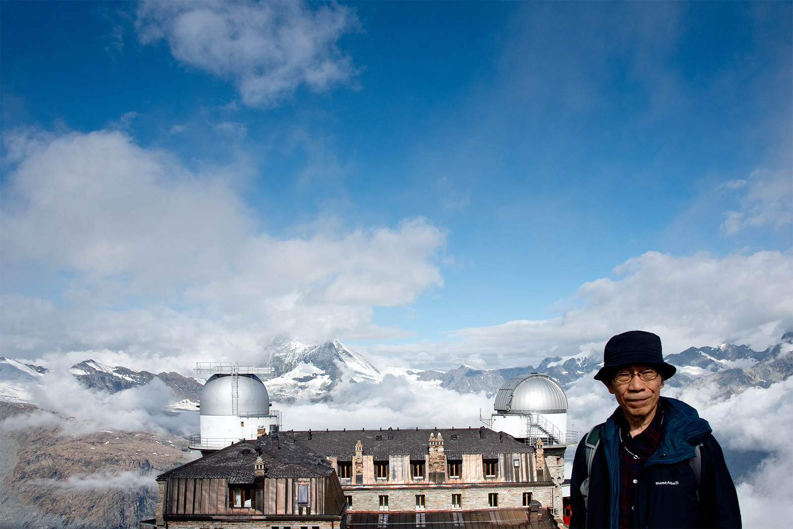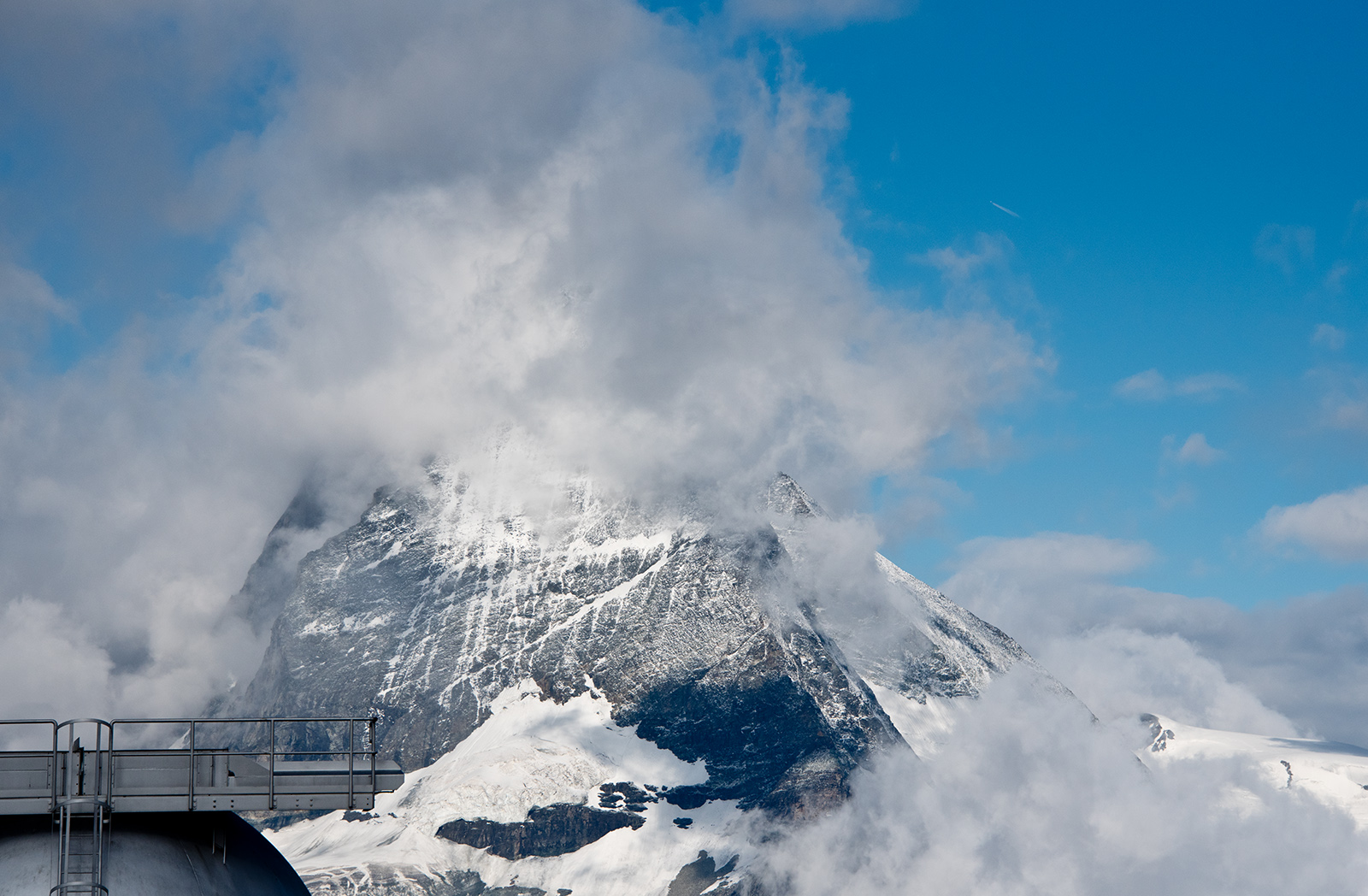 天文台のドームの先にマッタホルン (だいぶ雲がかかってきた)