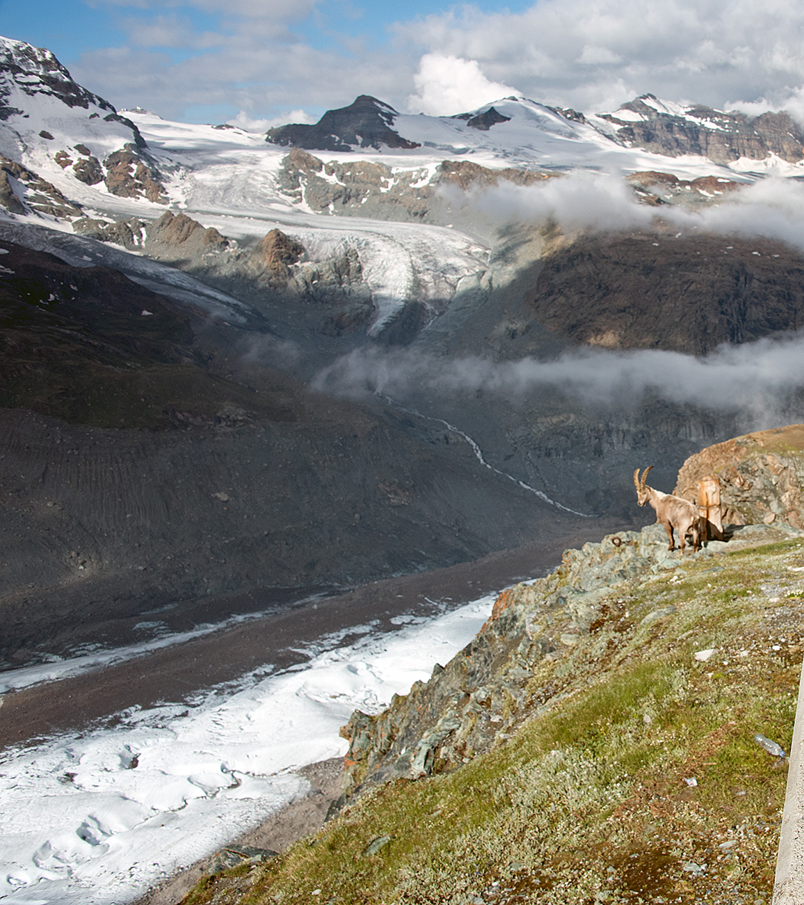 ゴルナー氷河を見下ろす野生の大角鹿 上部にはテオドゥール氷河とウンターテオドゥール氷河 ガイドによれば大角鹿に出会えるのは相当な幸運のようです。