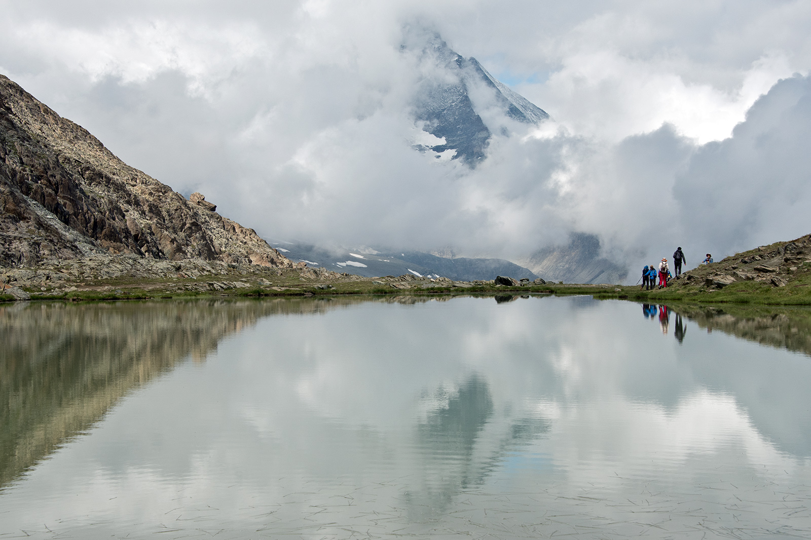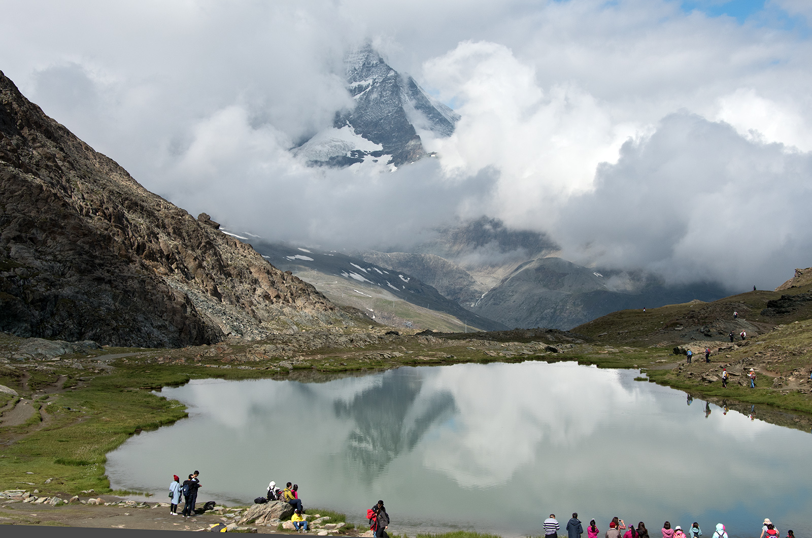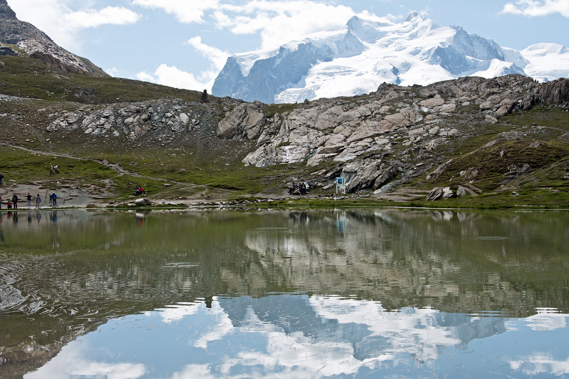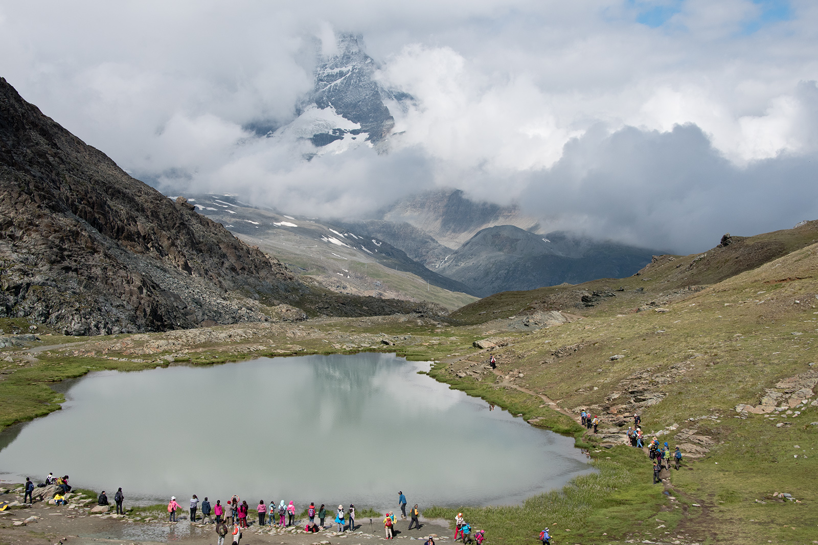 ローテンボーデンで登山電車を下車し、リフェル湖で水面に映るマッタホルンなど峰峰を眺め、高山の花花を楽しみながら、リッフェルべルグ駅まで下る。(約1時間30分の緩やかな下り)一面に咲いている花を踏まないように注意して歩く。アルパイン・マーモットの生息地を下るが、出会うことはなかった。