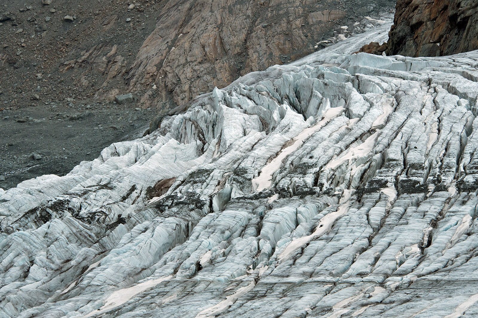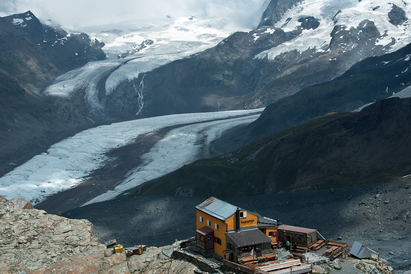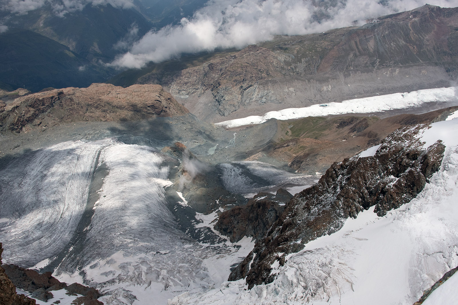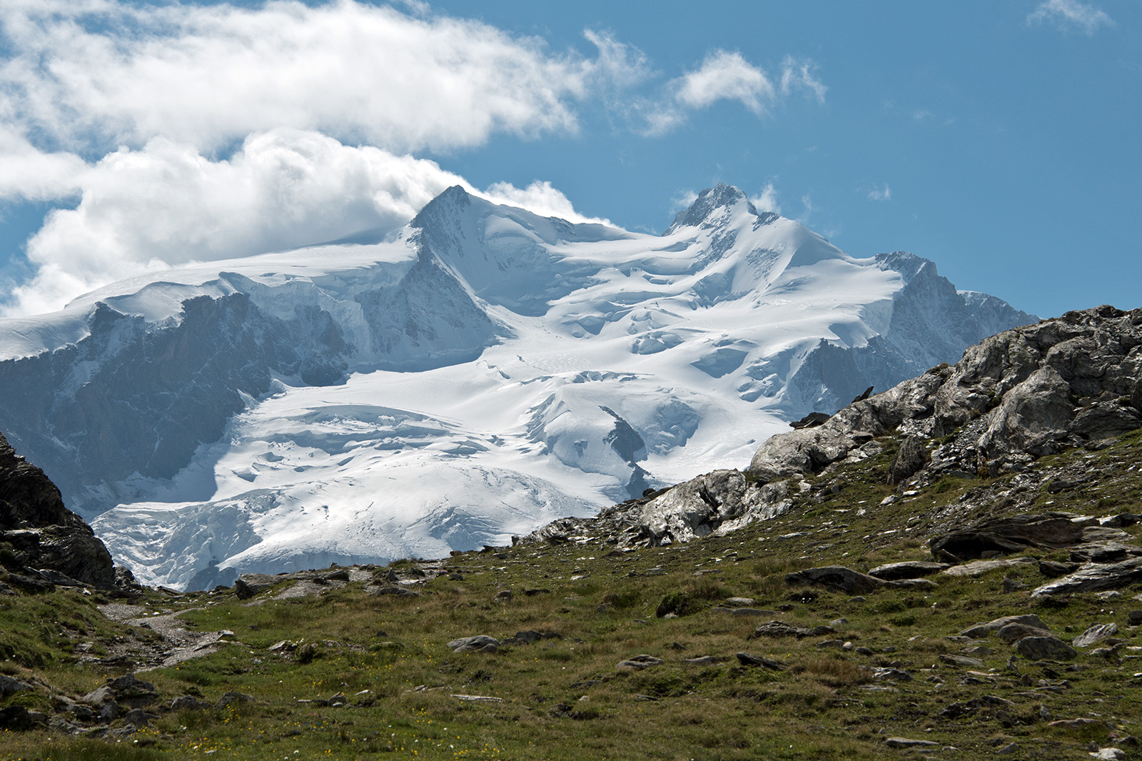 左:モンテローザ(4634m),右:リスカム(4527m),間を流れるグレンツ氷河