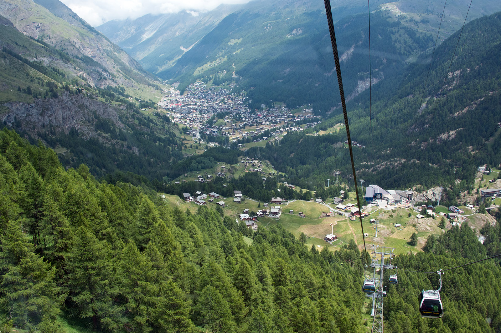 高度を上げる登山電車から見たマッタホルンとツェルマットの街