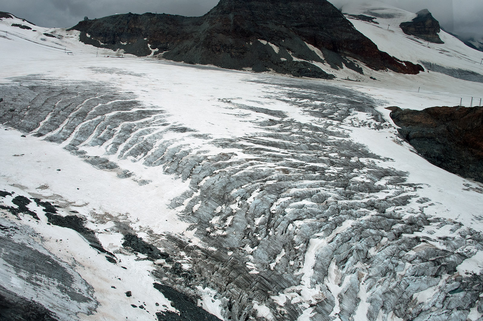 左:ストックホルン(3532m),右:モンテローザ,間を流れるゴルナー氷河