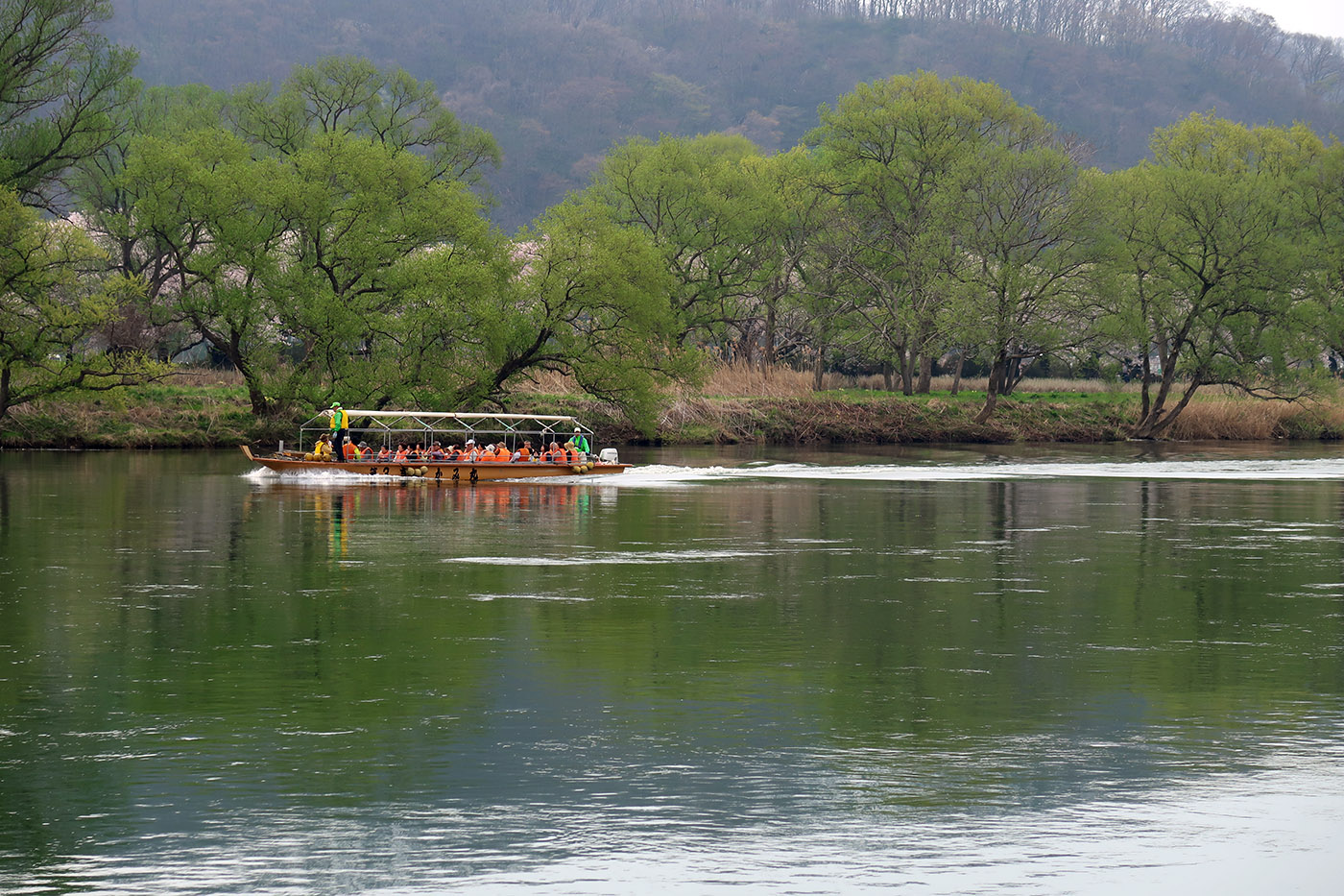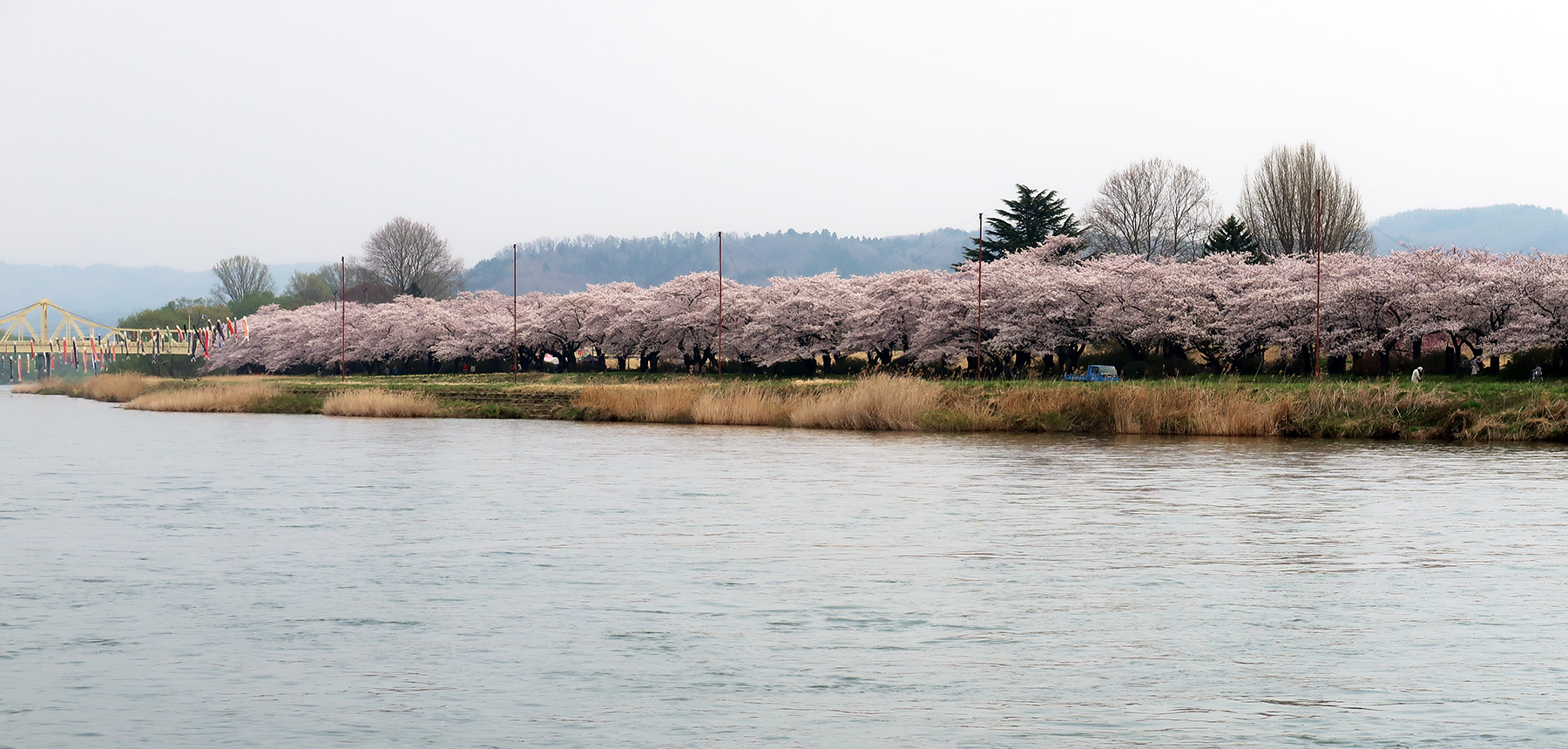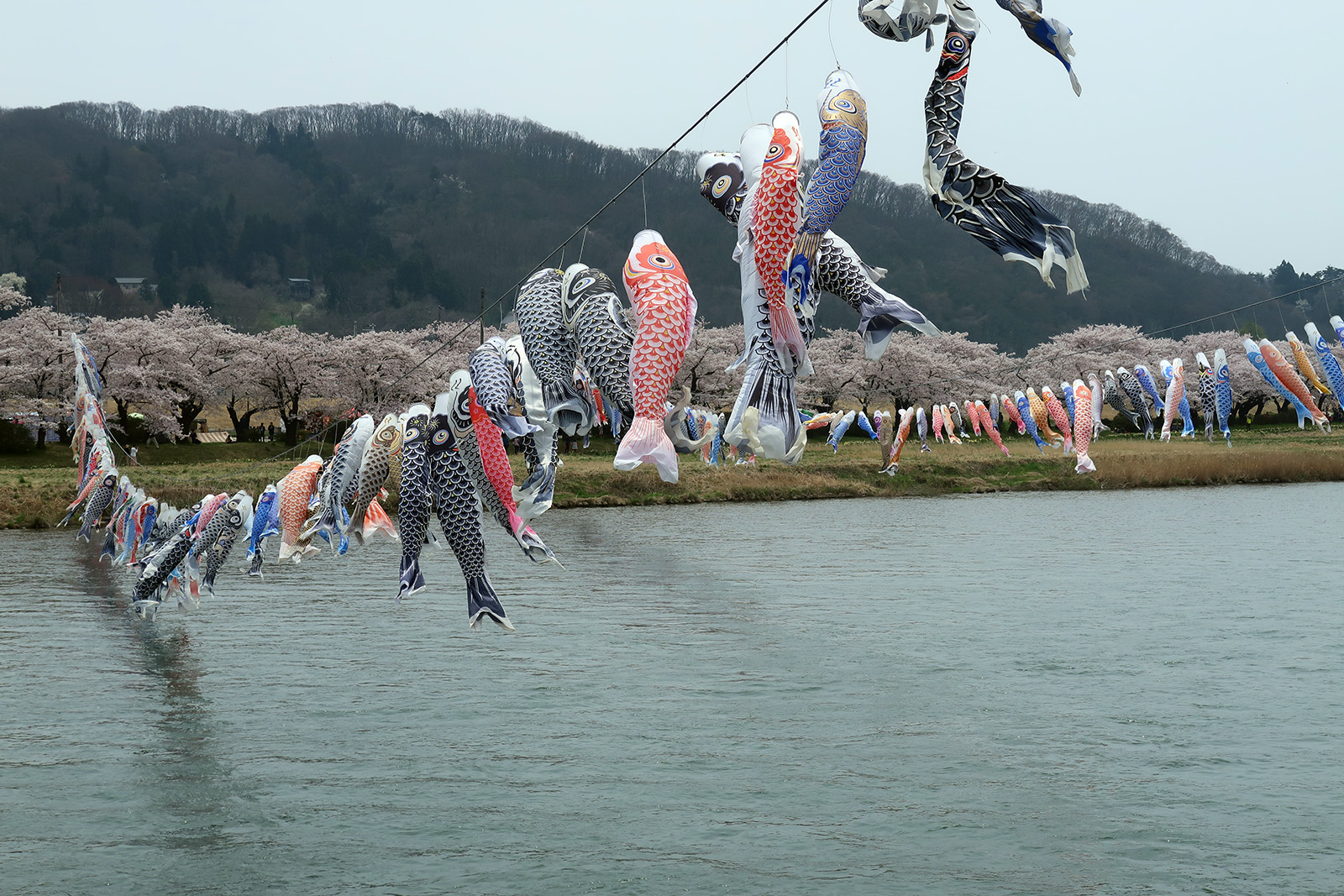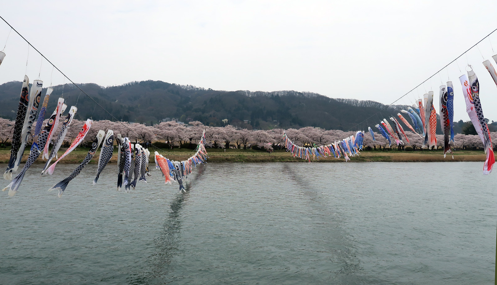 北上展勝地は、全国の桜名所百選に選定され、青森県弘前市・秋田県角館町と並び「みちのく三大桜名所」となっています。北上川沿いの約2kmの桜並木は、桜のトンネルとなり、訪れる人々を優しく迎えます。また、夜には、ライトアップされ、幻想的な雰囲気が醸し出されます。まつり期間中は並木間を観光馬車、川面には観光遊覧船と渡し舟が往来し、300匹の鯉のぼりが空を泳ぎます。