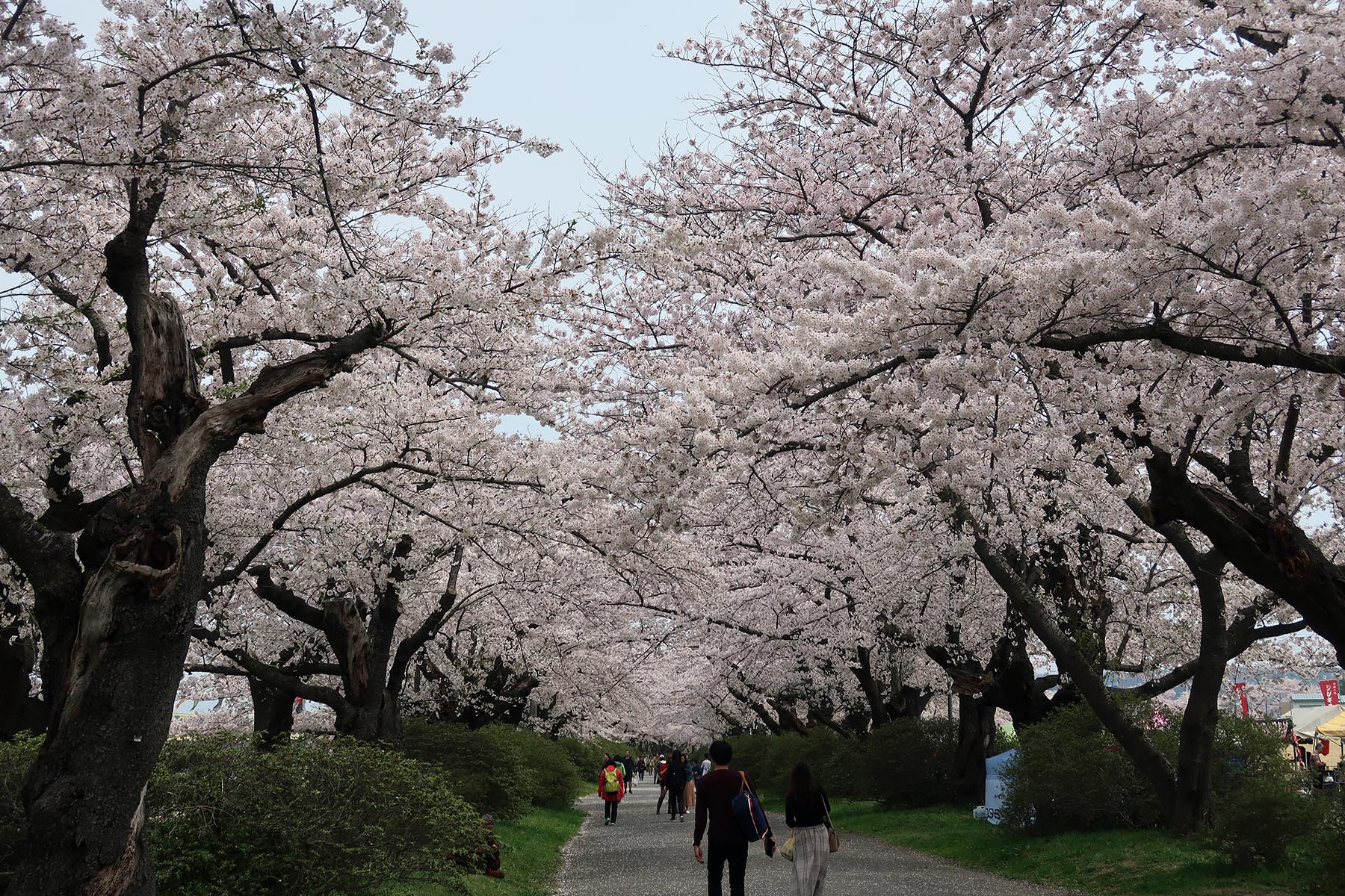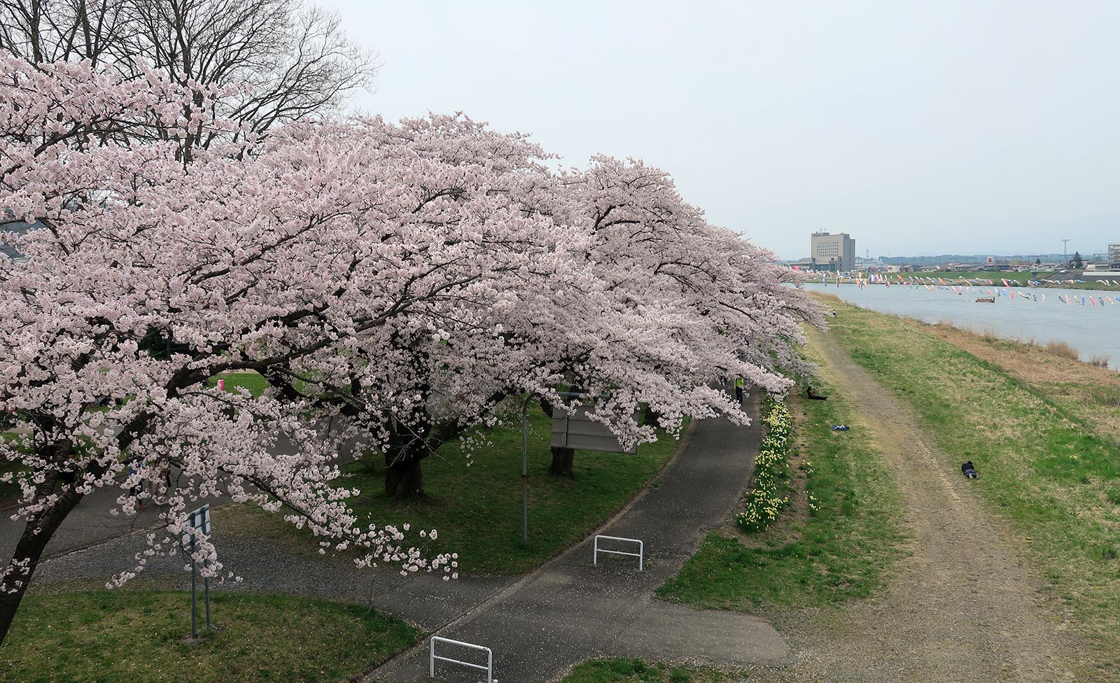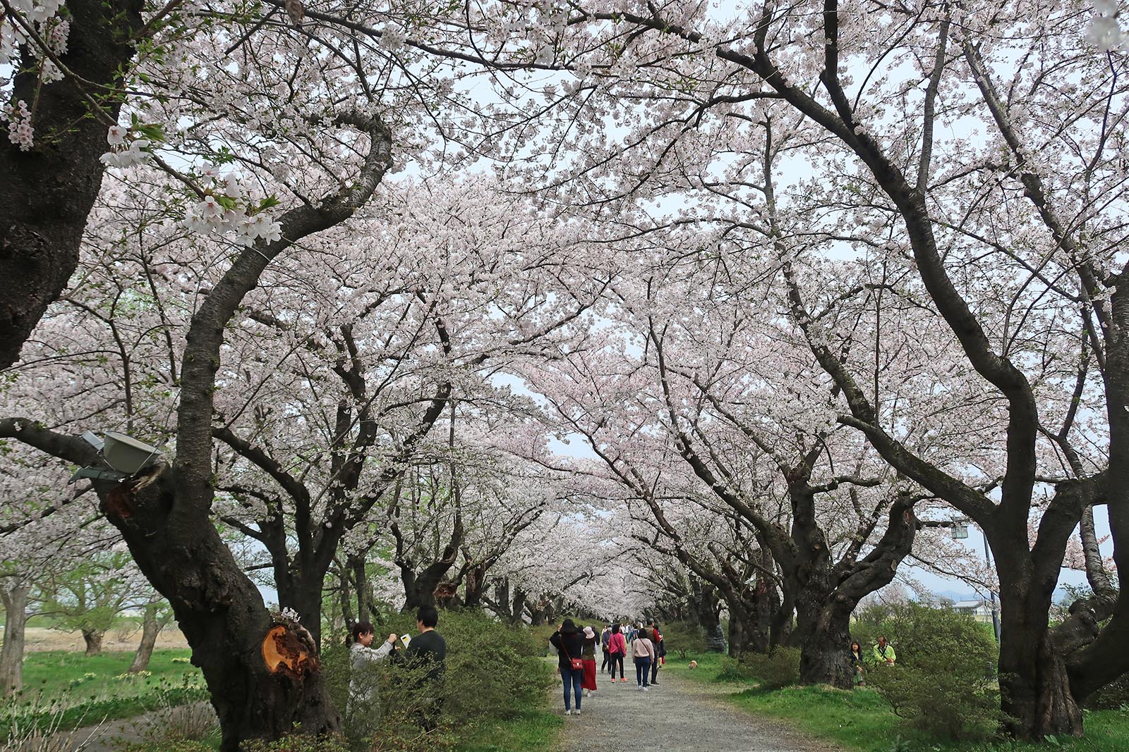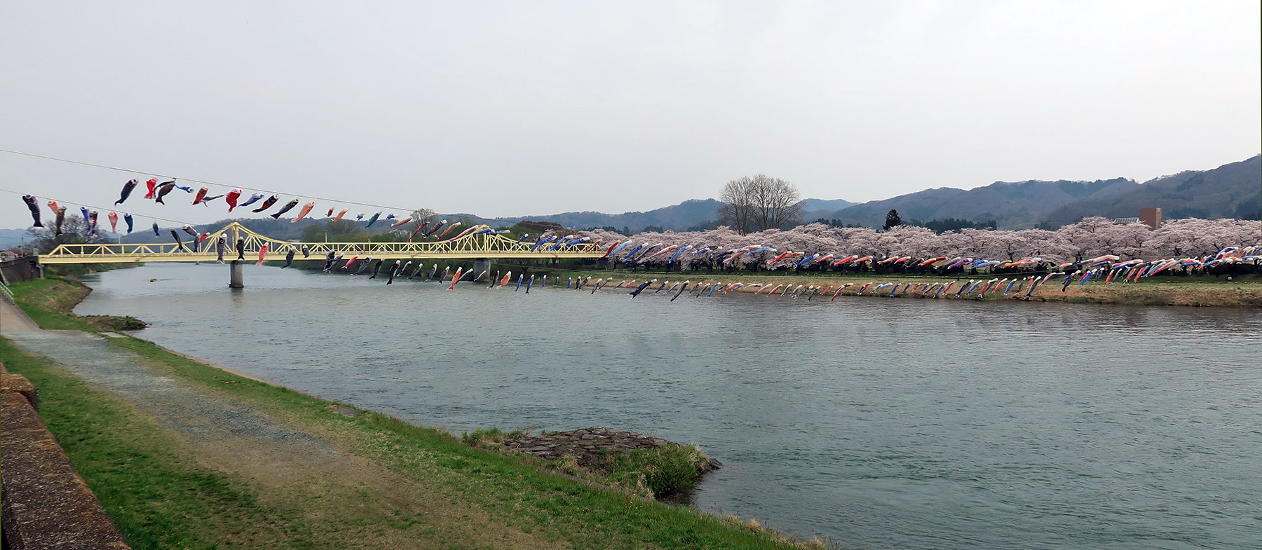 北上展勝地は、全国の桜名所百選に選定され、青森県弘前市・秋田県角館町と並び「みちのく三大桜名所」となっています。北上川沿いの約2kmの桜並木は、桜のトンネルとなり、訪れる人々を優しく迎えます。また、夜には、ライトアップされ、幻想的な雰囲気が醸し出されます。まつり期間中は並木間を観光馬車、川面には観光遊覧船と渡し舟が往来し、300匹の鯉のぼりが空を泳ぎます。