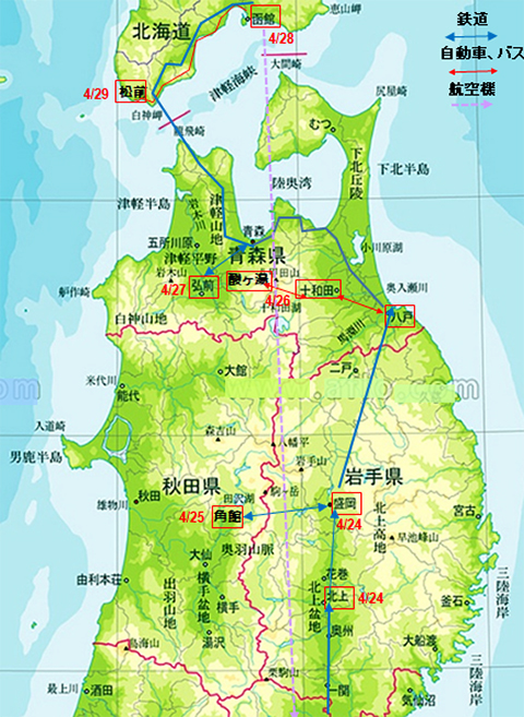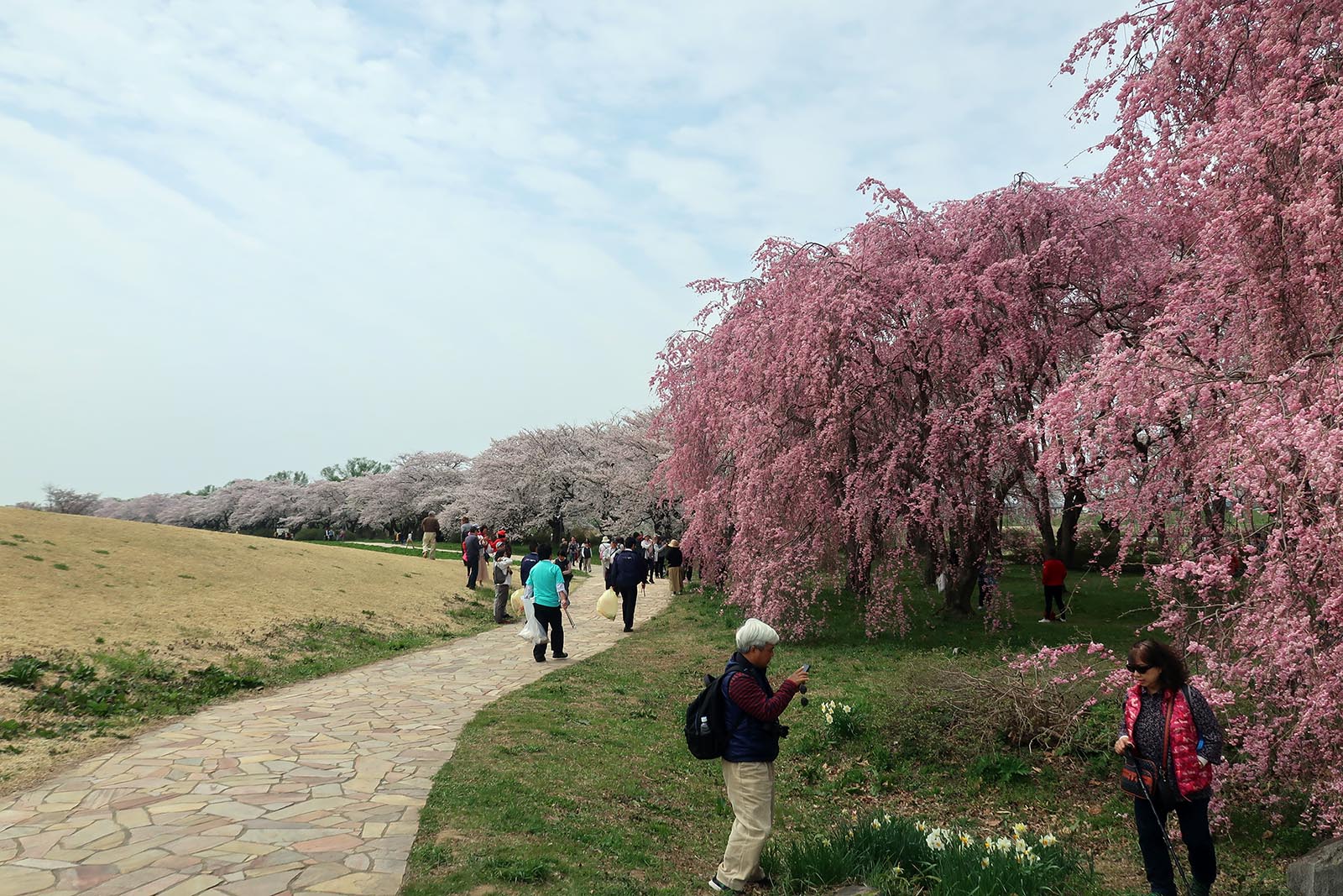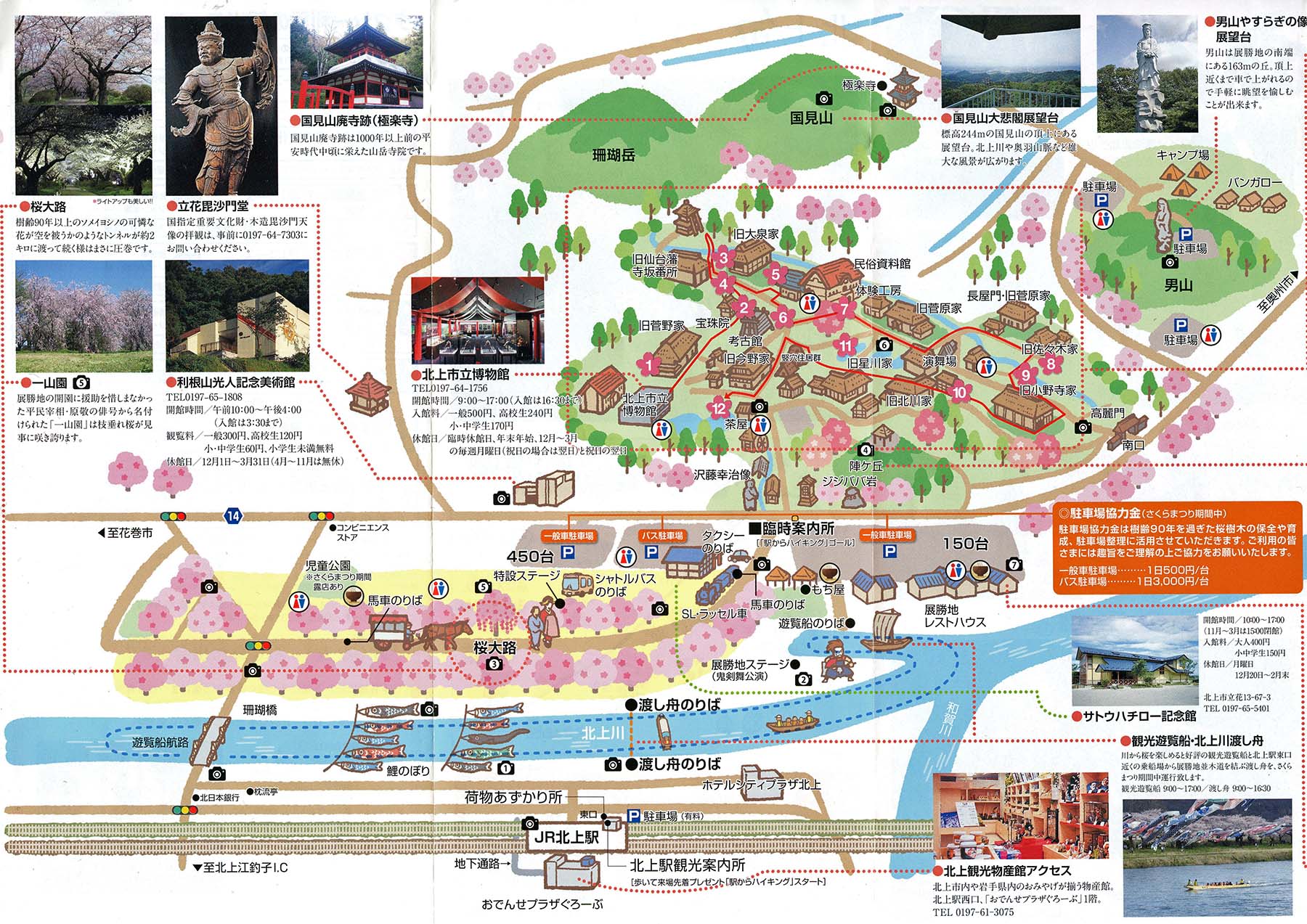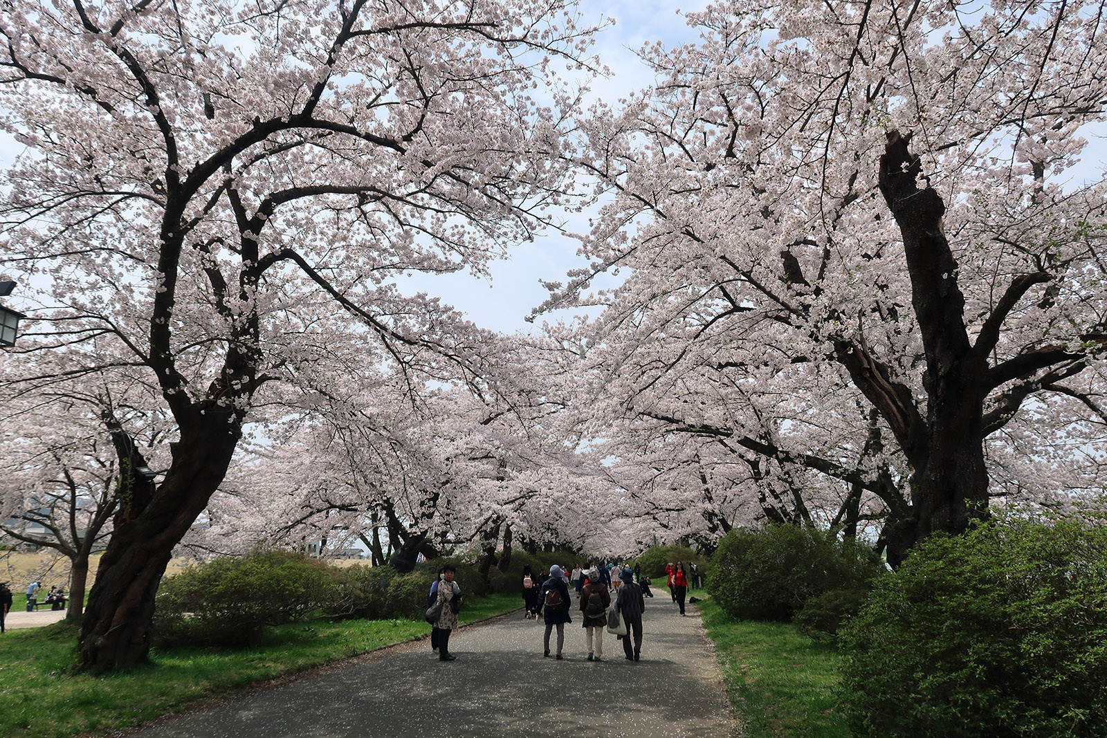 北上展勝地は、全国の桜名所百選に選定され、青森県弘前市・秋田県角館町と並び「みちのく三大桜名所」となっています。北上川沿いの約2kmの桜並木は、桜のトンネルとなり、訪れる人々を優しく迎えます。また、夜には、ライトアップされ、幻想的な雰囲気が醸し出されます。まつり期間中は並木間を観光馬車、川面には観光遊覧船と渡し舟が往来し、300匹の鯉のぼりが空を泳ぎます。