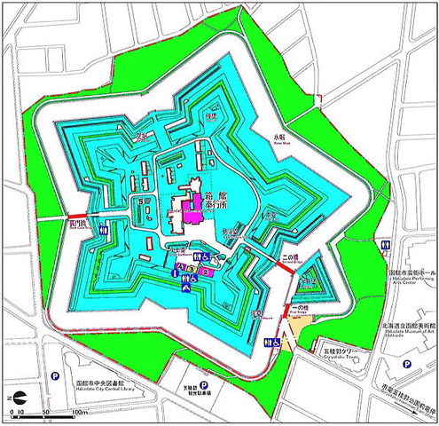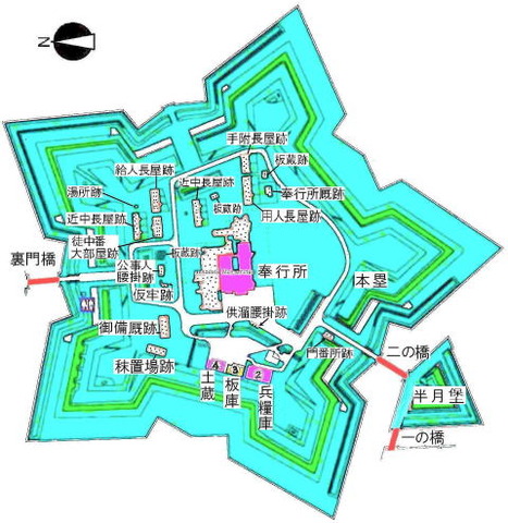 江戸時代末期,蘭学者武田斐三郎がオランダの築城書を参考にして設計し,箱館奉行所が安政4 (1857) 年着工,7年かかって元治1 (1864) 年に完成した洋風平城。面積は約 25万m2。周囲の土塁が五角形の星形をしている点が特徴である。この星形は,射撃の際死角を少くする目的で設計された。江戸無血開城に際して,海軍総裁榎本武揚らは新政府に対する武器引渡しを拒み,軍艦を率いて箱館に逃れ,五稜郭に拠って官軍に抗戦した。しかし抗戦の末,官軍参謀黒田清隆の説得により,明治2 (1869) 年5月降伏し,箱館戦争 (五稜郭の戦 ) は終りを告げた。その後は新政府開拓使が管理していたが,まもなく廃棄され,外郭だけを残した。 1922年史跡として指定され,現在は公園で,桜の名所となっている。(https://kotobank.jp/word/五稜郭-66552)